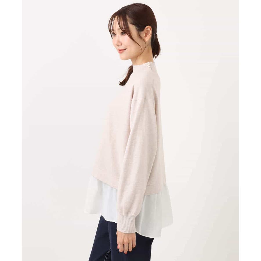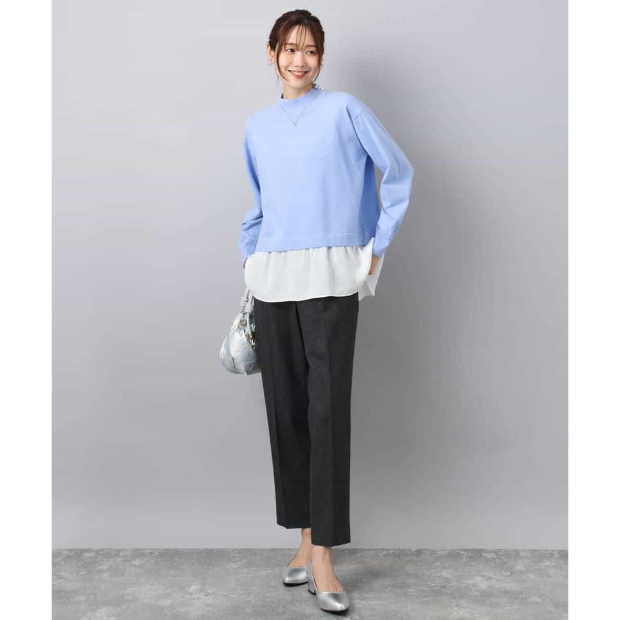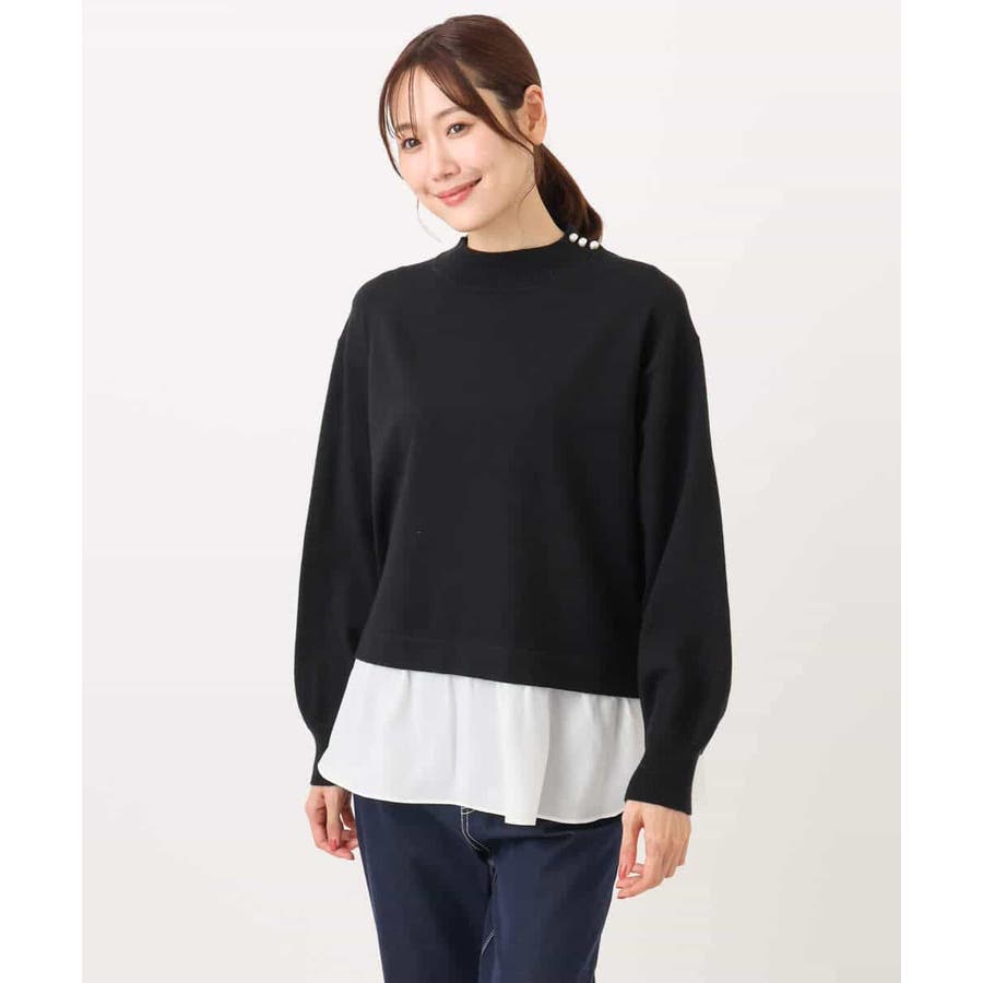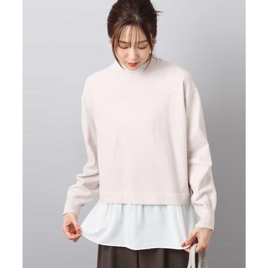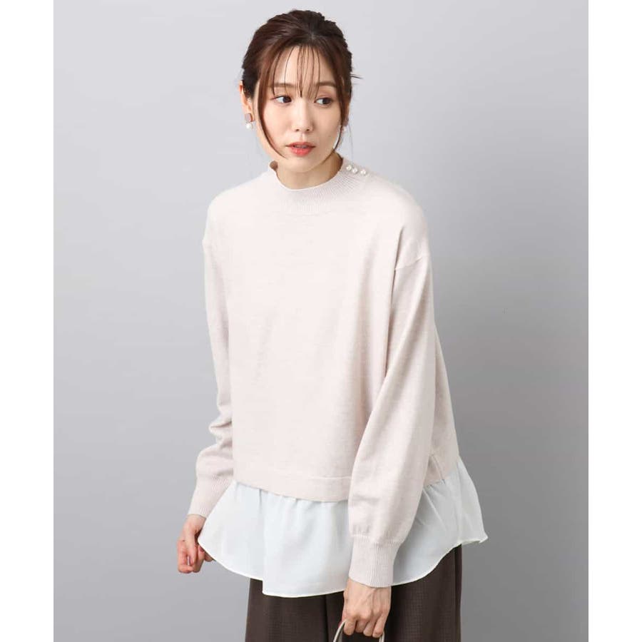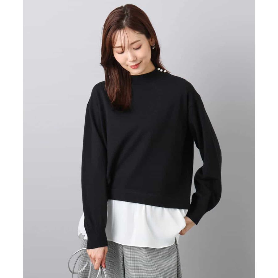 テクニック要らずで簡単に決まるレイヤードデザインのニットトップス。コートのインナー使いにもちょうどいい肉感で秋冬春と3シーズンで活躍してくれます。衿ぐりはさりげないパール調釦が付いたモックネックデザイン。