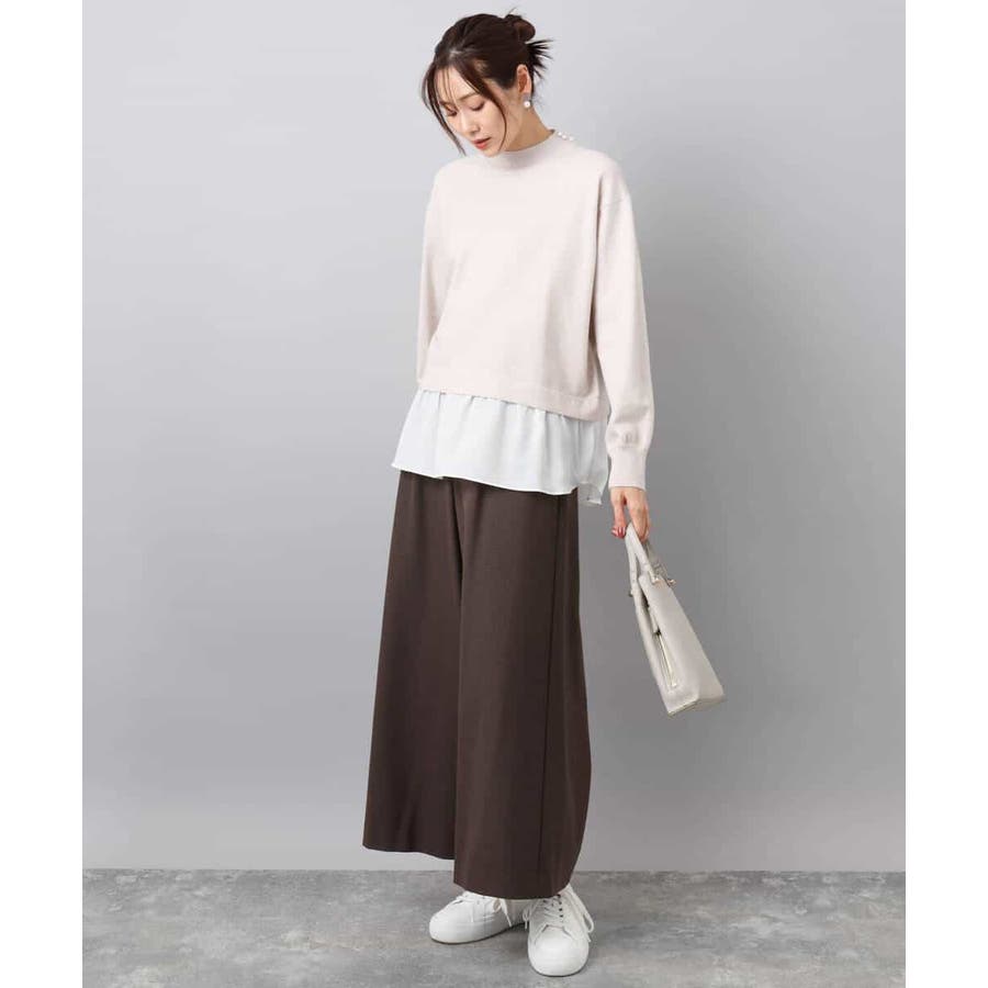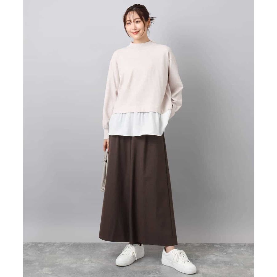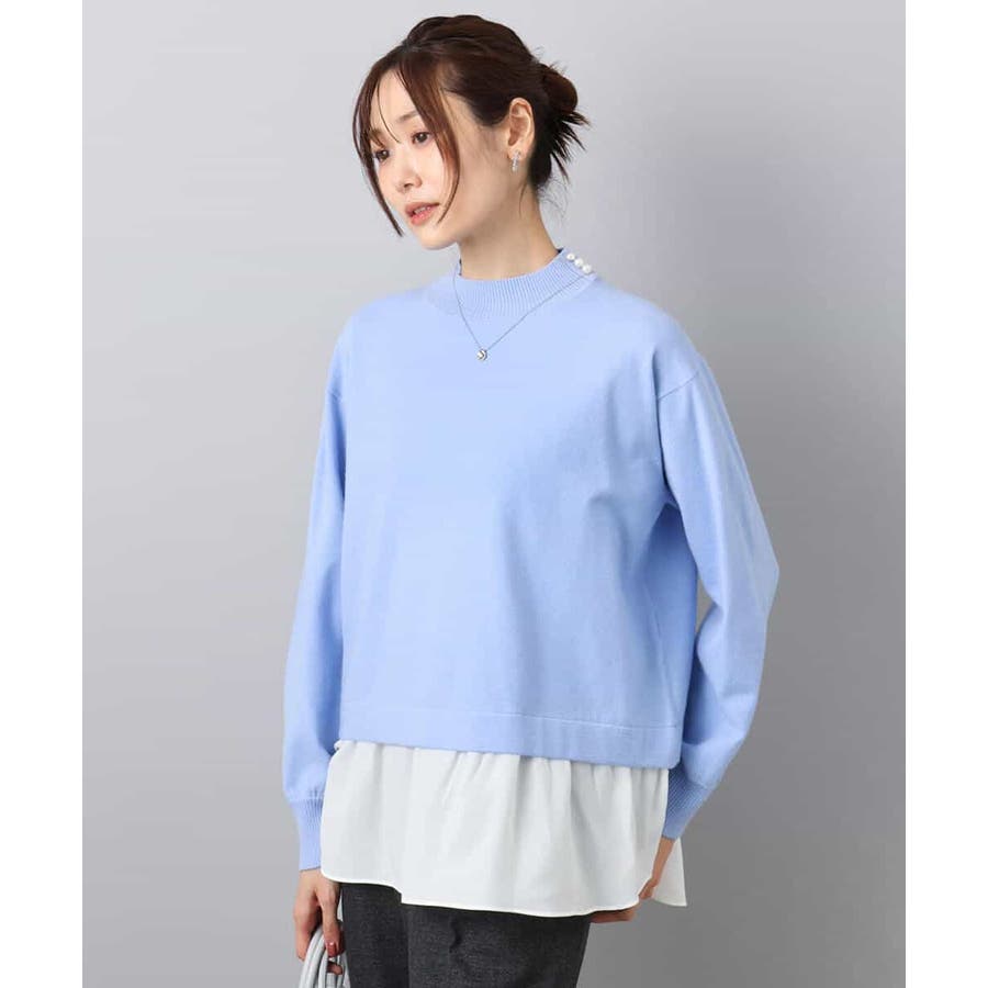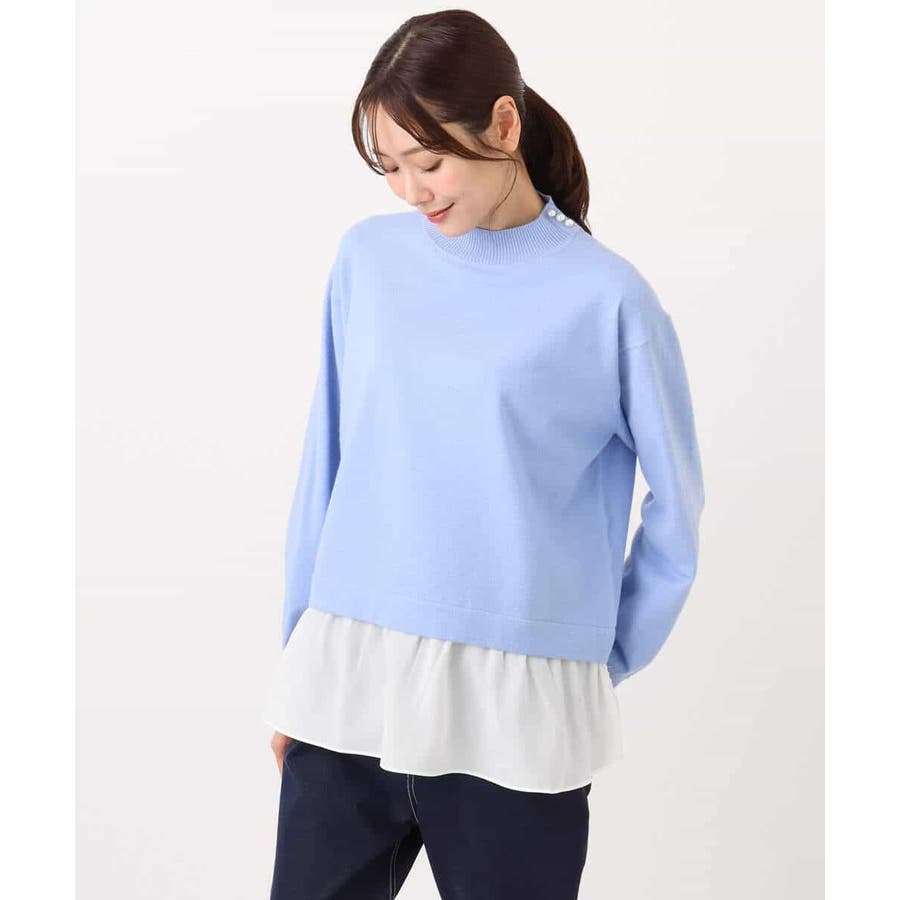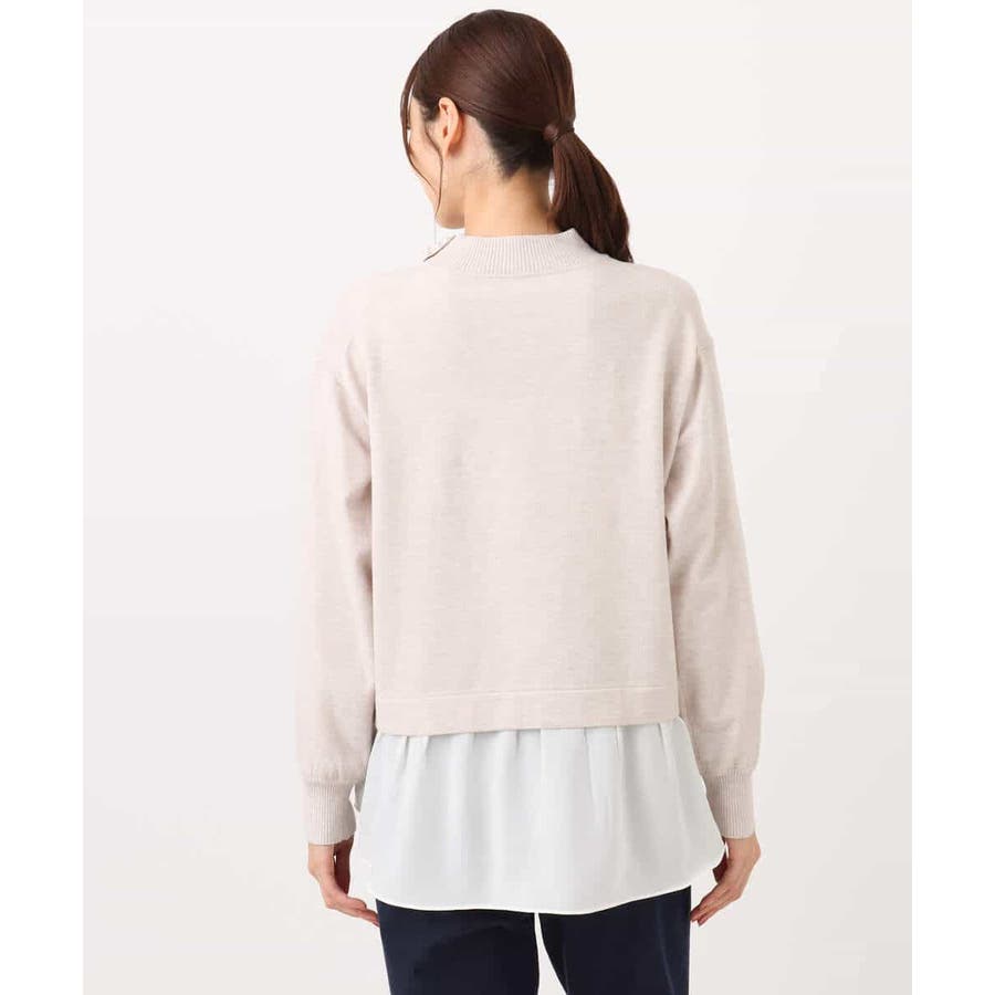 テクニック要らずで簡単に決まるレイヤードデザインのニットトップス。コートのインナー使いにもちょうどいい肉感で秋冬春と3シーズンで活躍してくれます。衿ぐりはさりげないパール調釦が付いたモックネックデザイン。