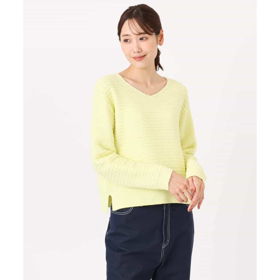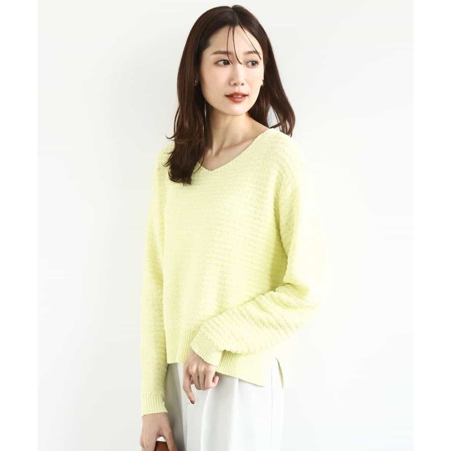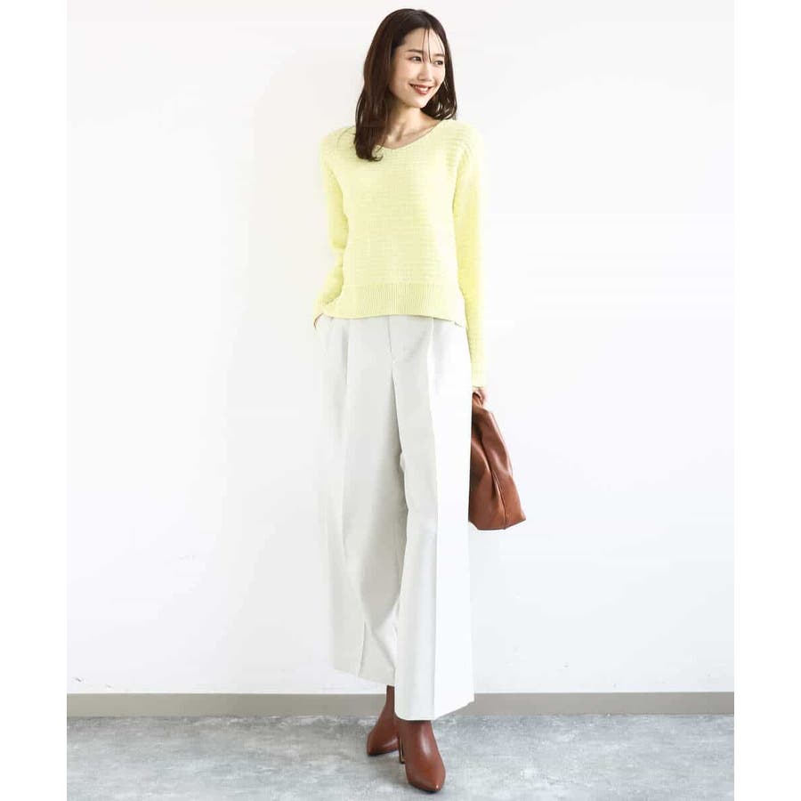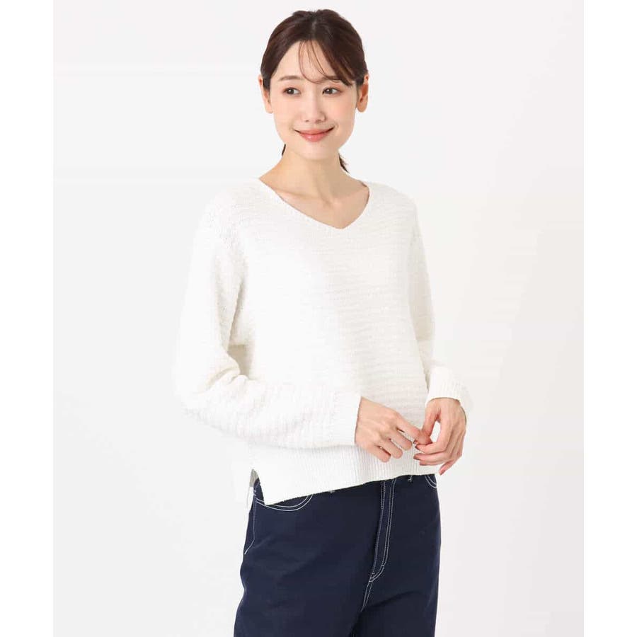 やや短めの着丈がボトムを選ばないクロップド丈のニット。デコルテラインをきれいに見せるVネックのデザイン。
