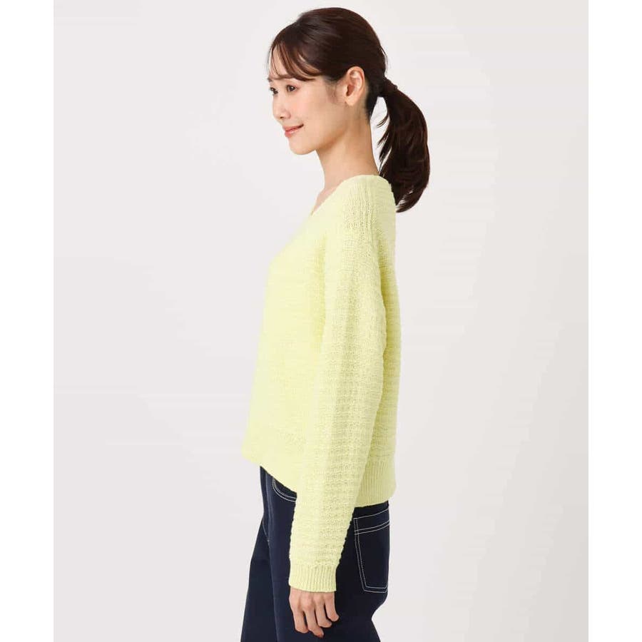 凹凸のある表面感は無地ながらもコーディネートのアクセントに映えます。Vネックも深すぎず程よい抜け感に。