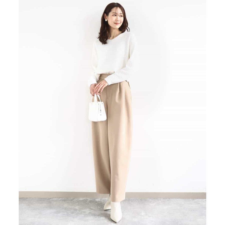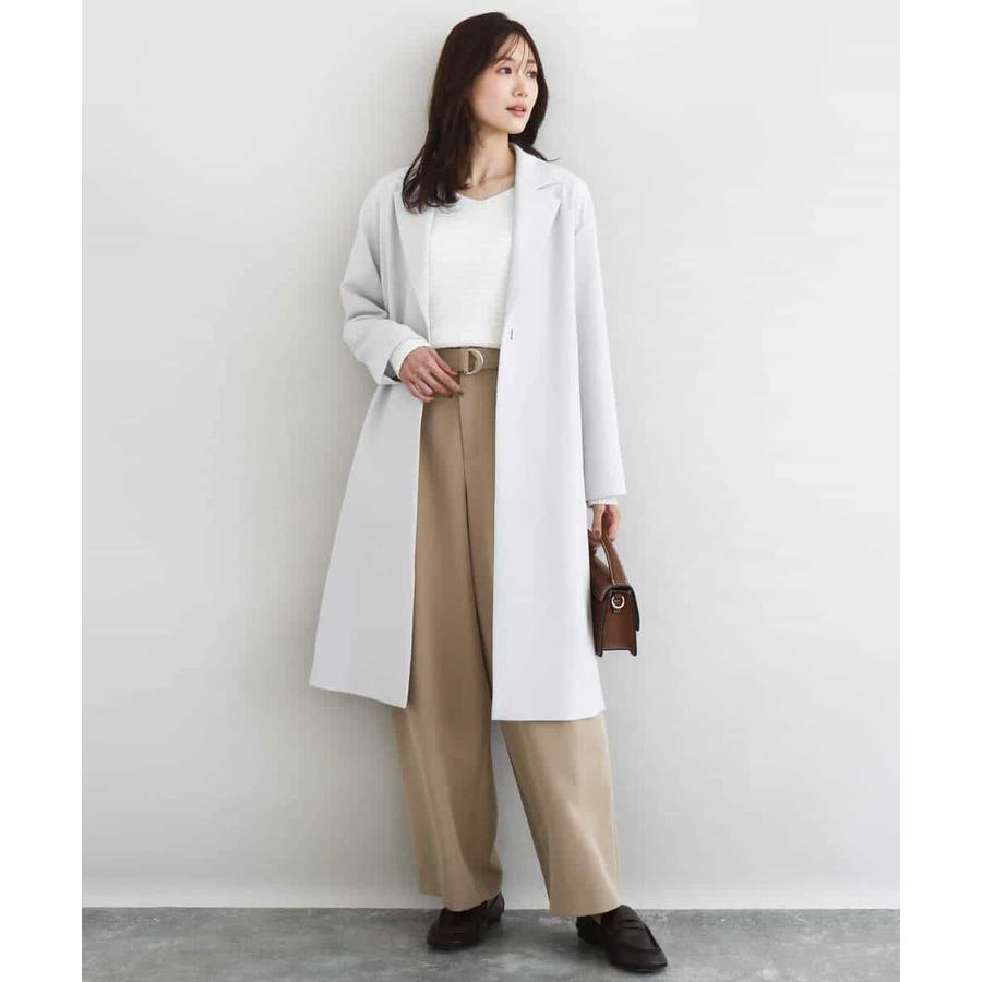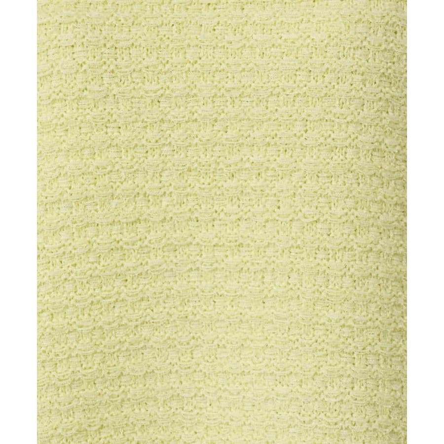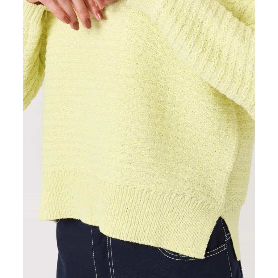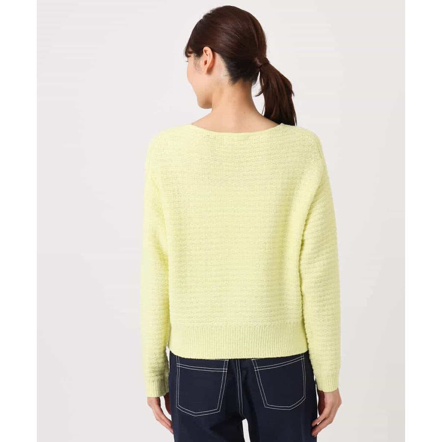 とても発色の良い鮮やかなライトイエローの色味。個人的には写真で見るよりもより鮮やかで色がやや濃い印象を受けました。春らしい明るい色はコーデの主役に映えること間違いなし。素材も暖かみのある素材ではないですが、ツイーディーでふくらみ感があり、見た目以上にしっかりと肉感を感じました。着丈はやや短めで、ボトムにインせずにラクチンに切れるのも嬉しい。袖や身頃も割とコンパクトなデザインですっきりと着こなせました。