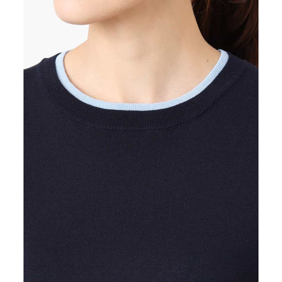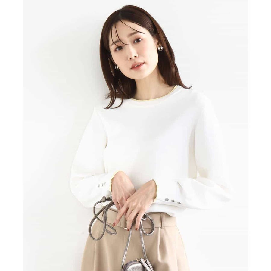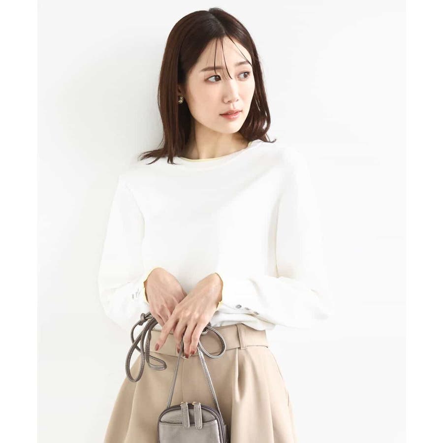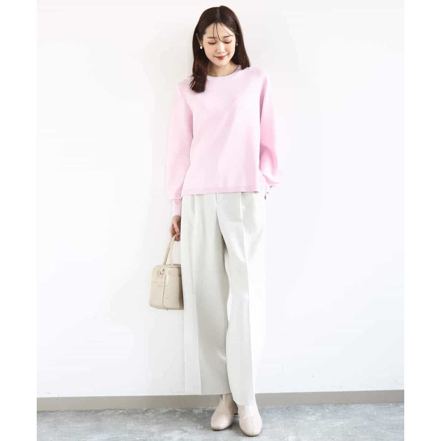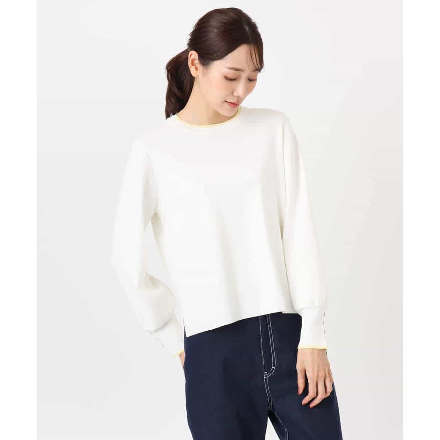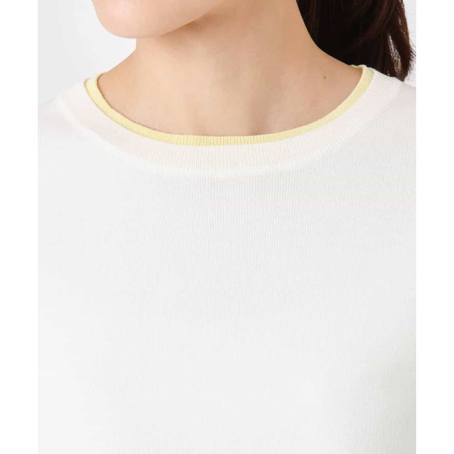 さらりとしたややシャリ味のあるような肌触りのニットで、暖かみやふくらみ感もなく、秋冬春と3シーズンで使いやすい素材感です。シンプルなデザインながら、衿元と袖口の配色ラインがさりげないポイントとしてコーデに映えてくれます。着丈は腰骨がしっかり隠れる程度の長さで長すぎるということもなく、ボトムにインしなくてもラクに着こなせる丈感でした。裾にスリットが入っているので、ウエストインしたい気分のときにも嬉しいデザインです。ホワイトは真っ白というよりもオフホワイトに近い色味なので顔馴染みも良く着こなせました。透け感がある、という感じではありませんが、ホワイトは黒いインナーなどは見えてしまいますので、淡い色のインナーがおすすめです。