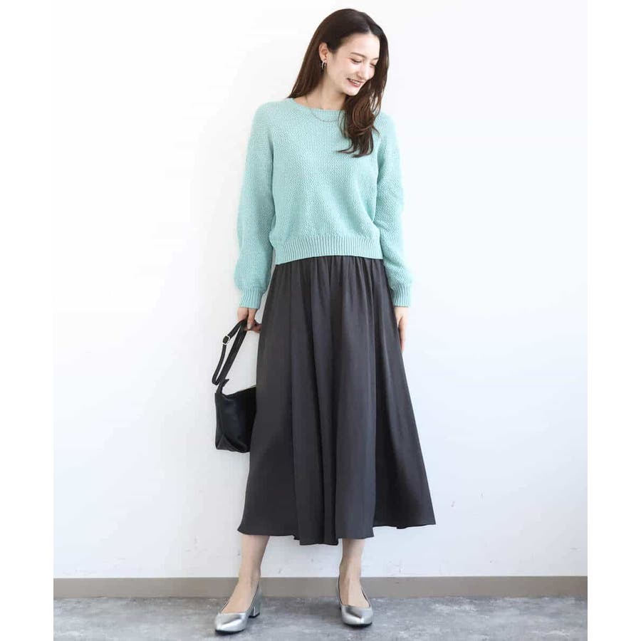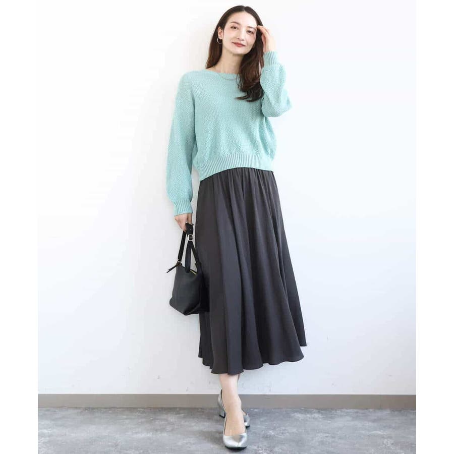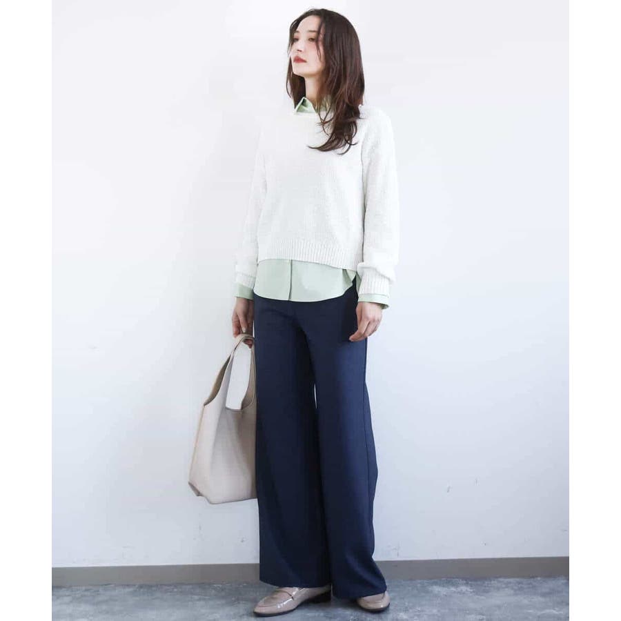 表面感のある編地がポイントの、大人かわいいカラーニット。編地がしっかりしているので暖かく、肌寒い時期にも活躍してくれそうです。首元の開きは控えめで、鎖骨が見えすぎないのも安心ポイント。 着丈は長すぎず、全体的にややコンパクトな作りなので、すっきり着られました。 ボリュームのあるボトムともバランスが取りやすく、コーデに取り入れやすい1枚だと思います◎