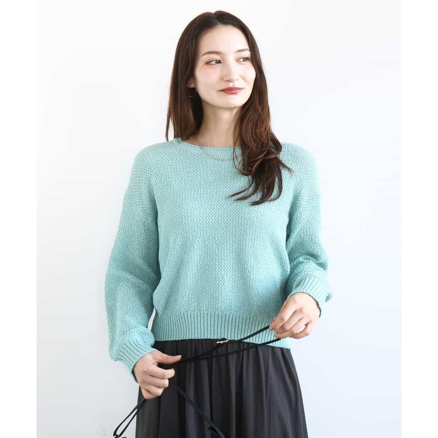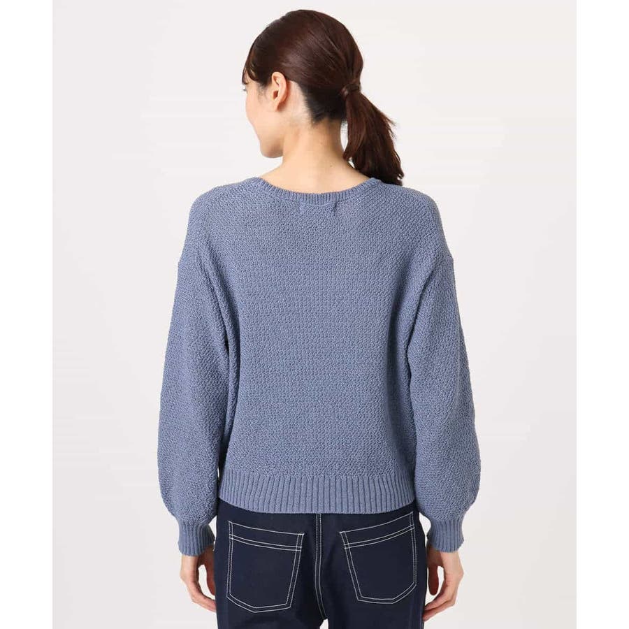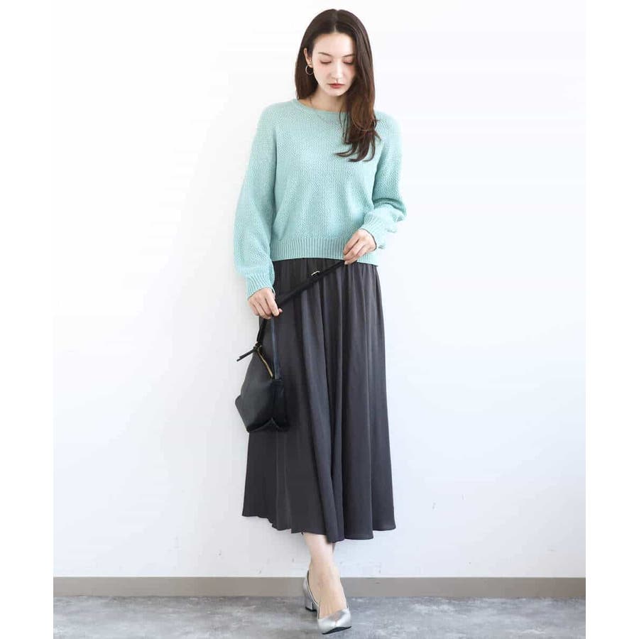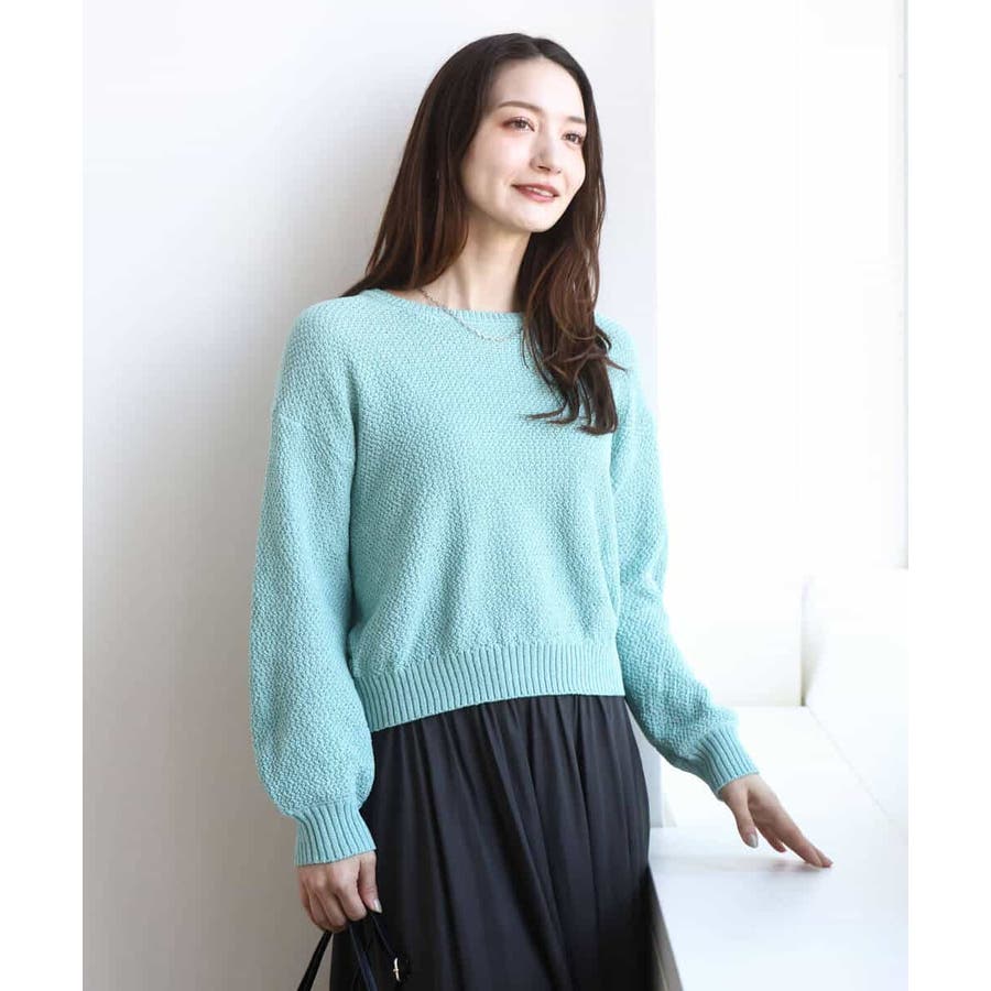 バランスの取りやすい短めの丈感と、袖口のボリュームがやわらかな印象のニットプルオーバー。身頃はコンパクトですっきりと着こなしやすい。