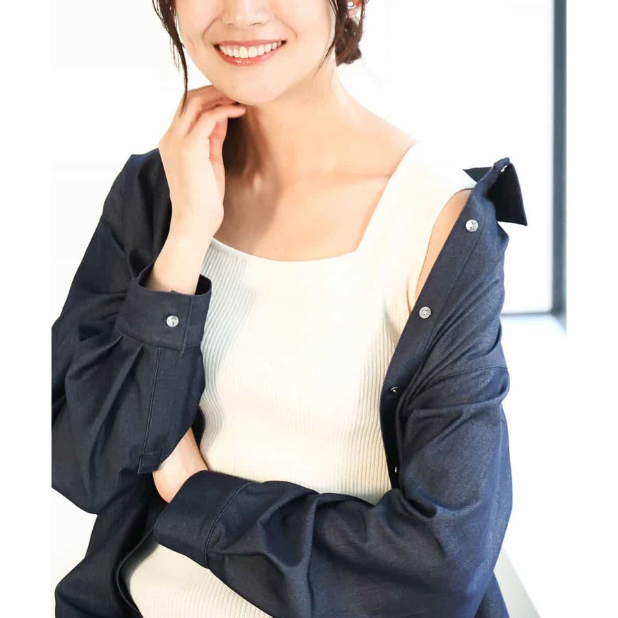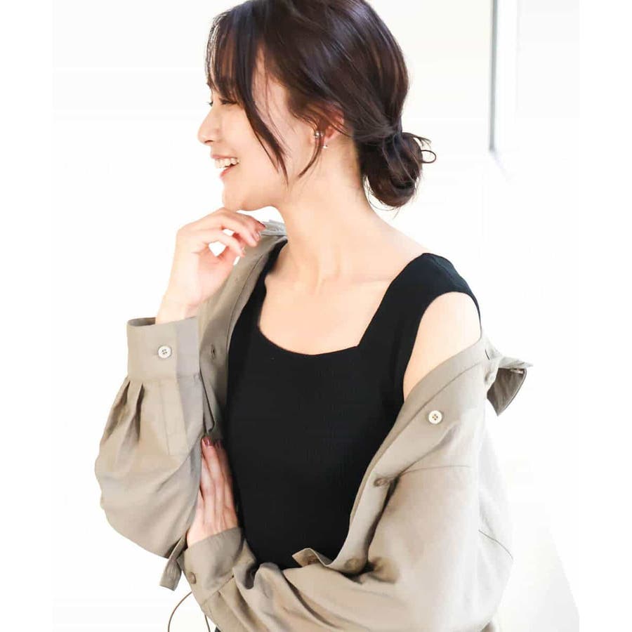 リブニットなので伸縮性があり、程よく体にフィットするので胸元が開きにくく、かがんだ時も安心です。しっかり目の生地なので、インナー感が少なく、見せるタンクトップとして活用できます。