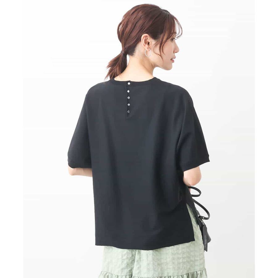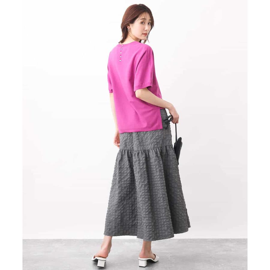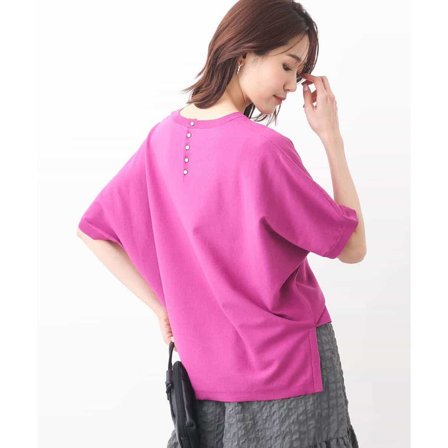 ストレスフリーのリラックスシルエットが大人なムードなニット。ボトムのウエストにインができるように脇スリットを入れたデザインに。後ろ衿ぐりにはメタル釦を並べてアクセントに。
