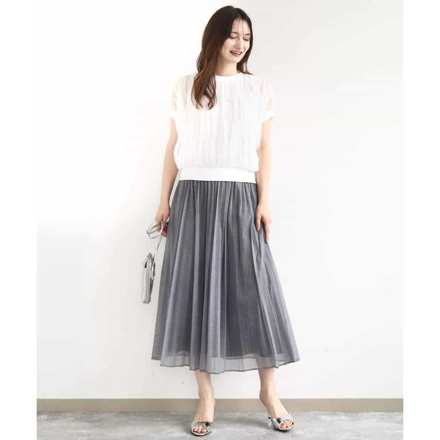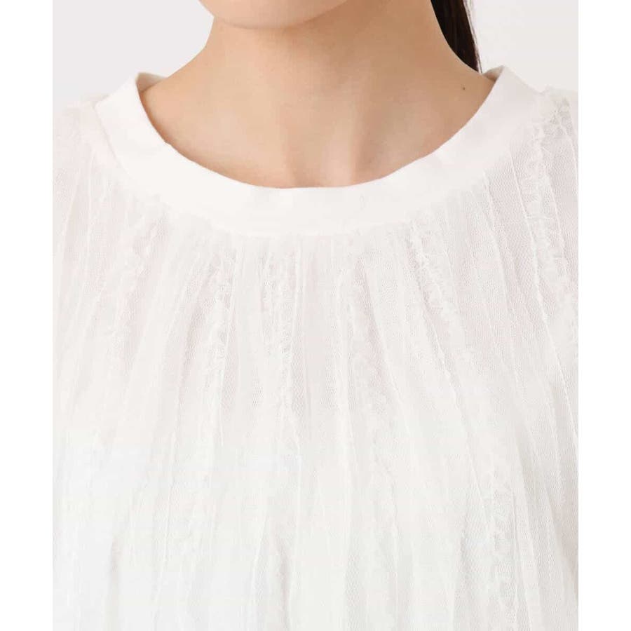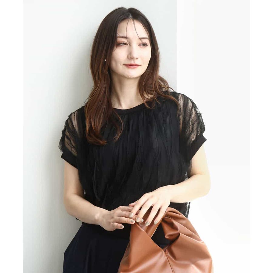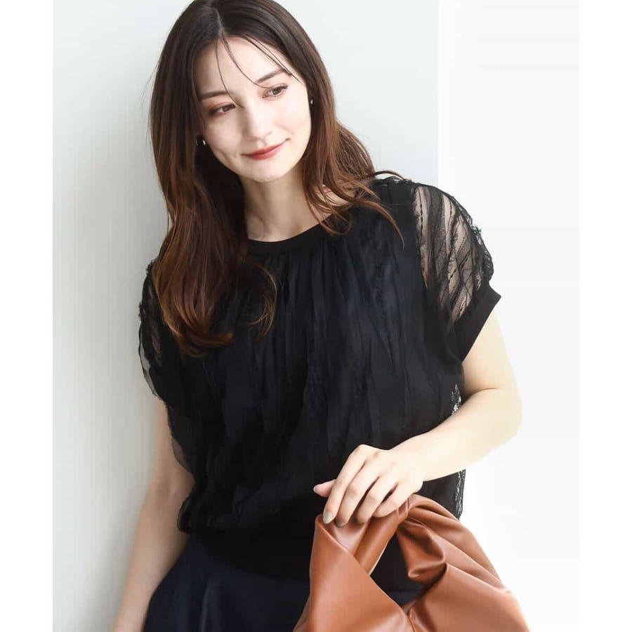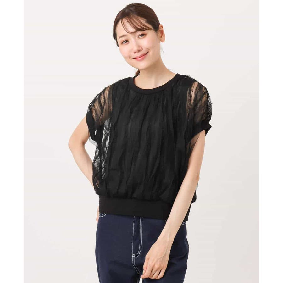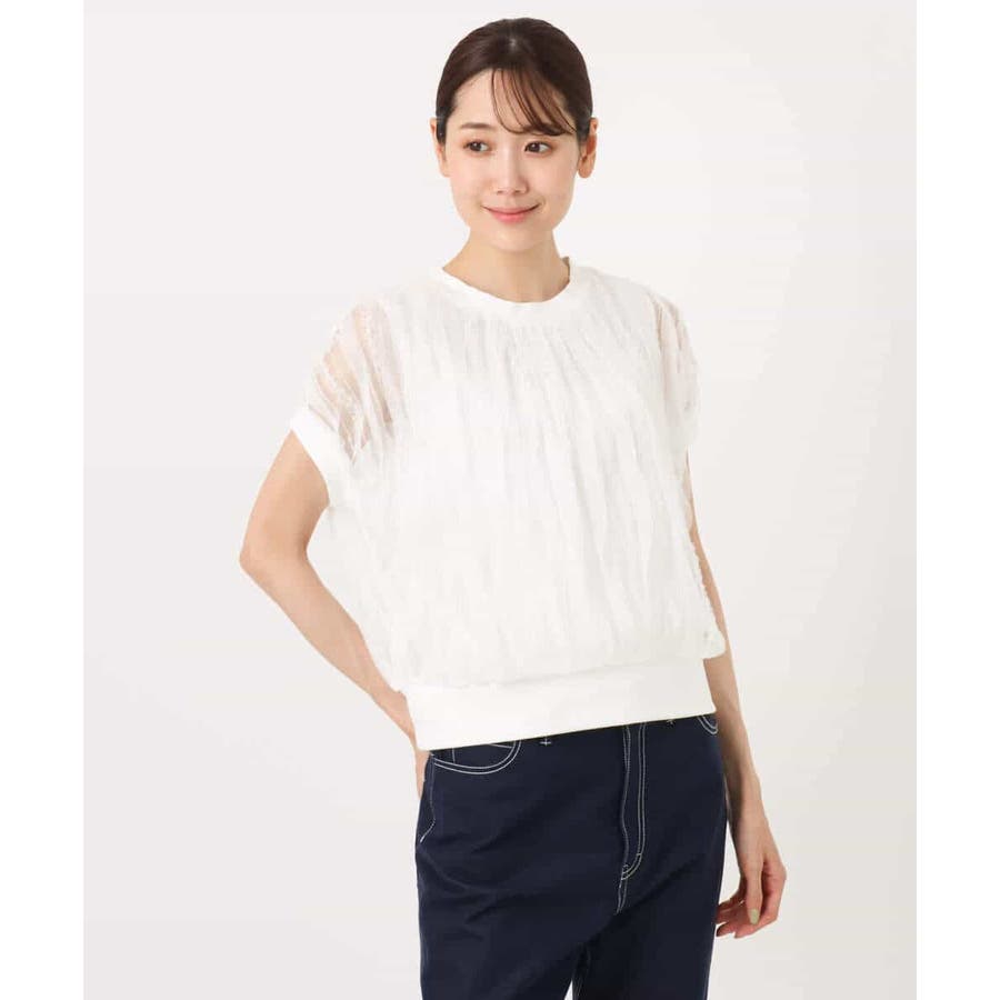 トレンドのチュール素材のプルオーバーです。透かしのスリーブが大人可愛い印です。表面感のあるチュールは柔らかで着心地がとても良いです。タンクトップ型のインナーを縫い合わせてあるので一枚着しやすいのも嬉しいですね。コンパクトなのでワイドパンツやスカートとの相性がとても良いです。
