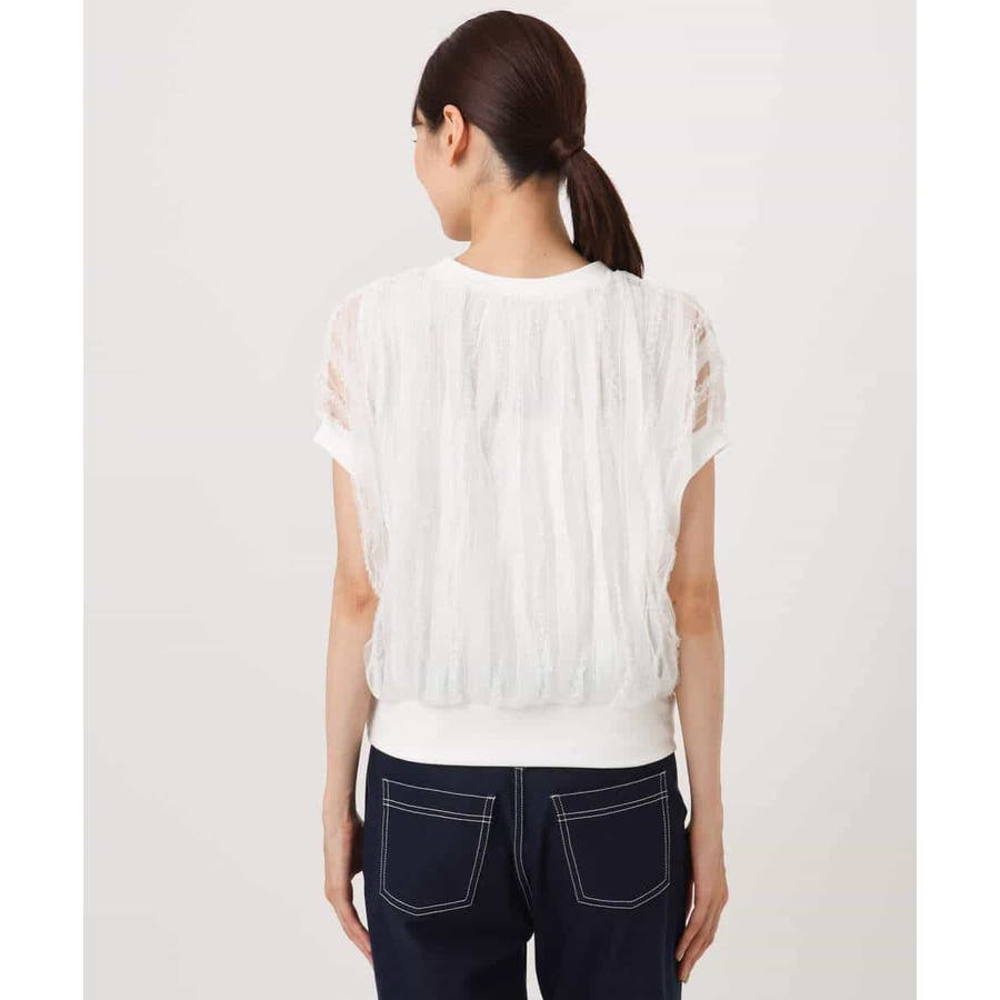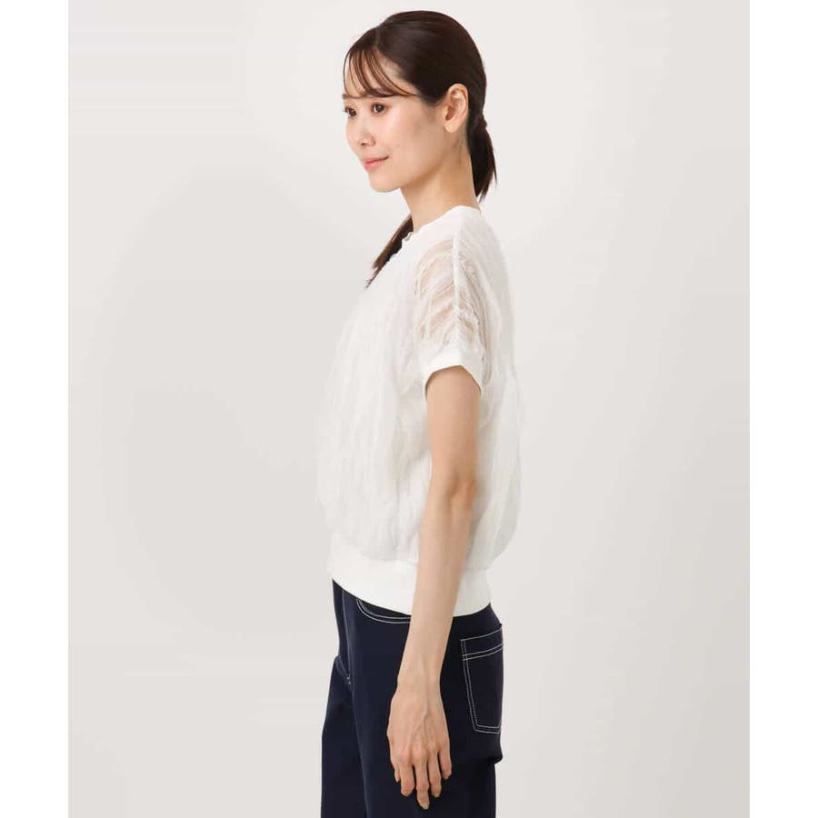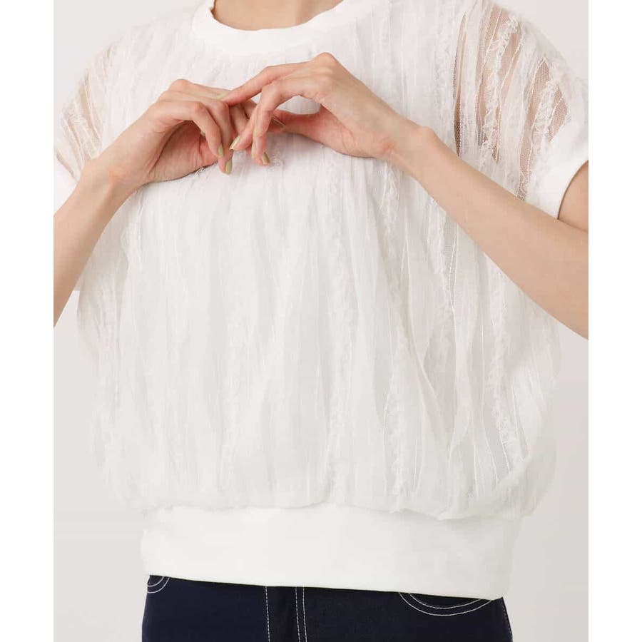 チュールテープの意匠感が見た目にも可愛いニットプルオーバー。裾や袖口をリブ素材で切り替えたフレンチスリーブデザインでコンパクトな丈バランスです。