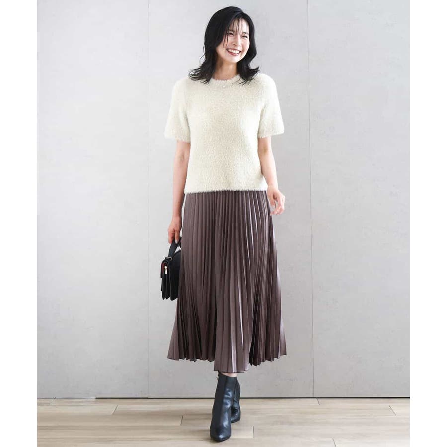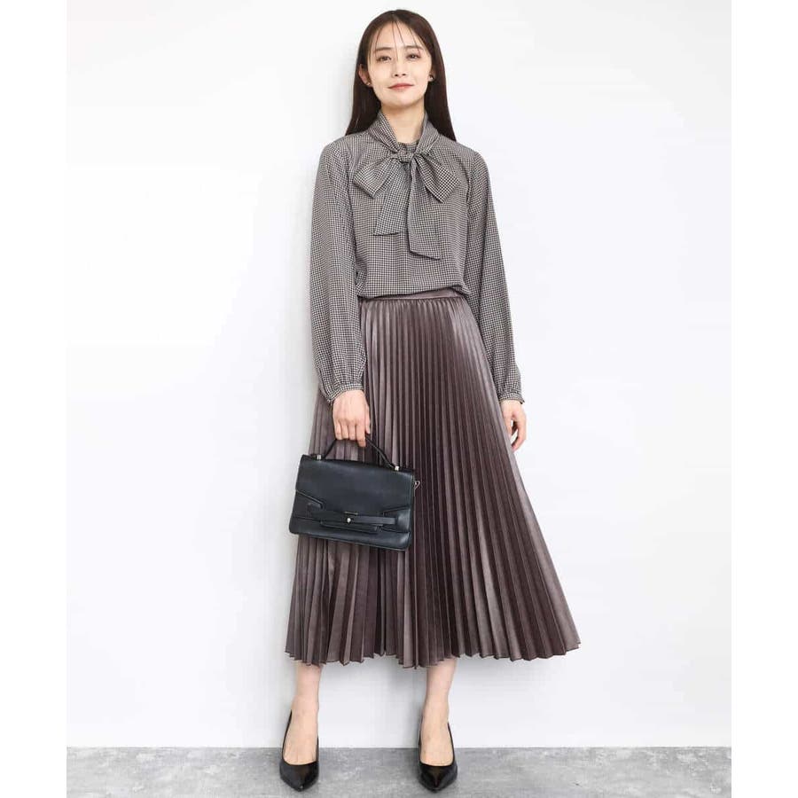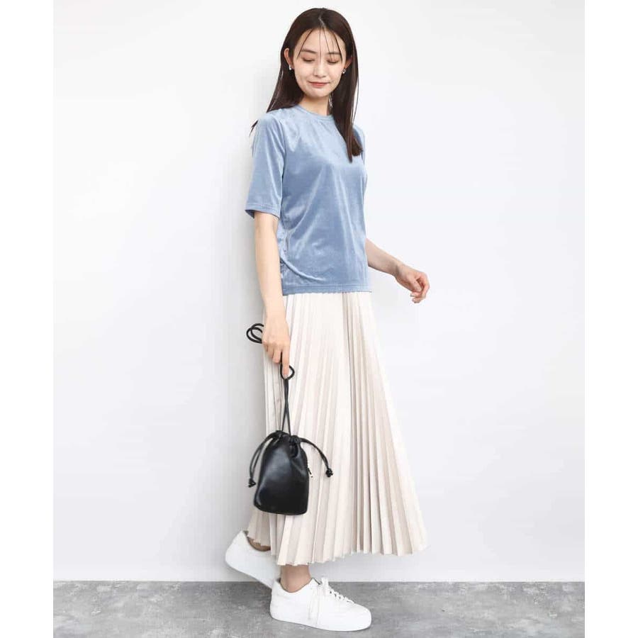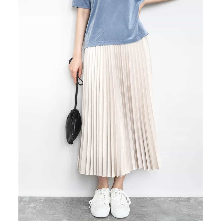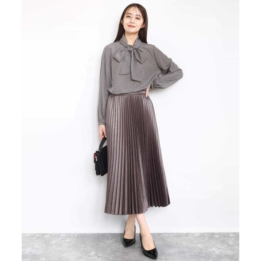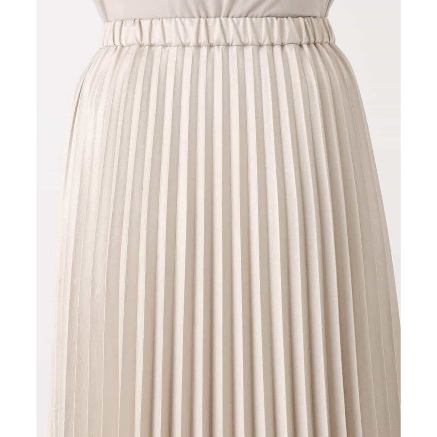 太幅と細幅が組み合わさった動きのあるプリーツがデザインポイントのスカート。軽い素材で動きに合わせて揺れるシルエットが女性らしい印象です。ウエストはバッグゴム仕様なので、様々な体型の方にフィットします。