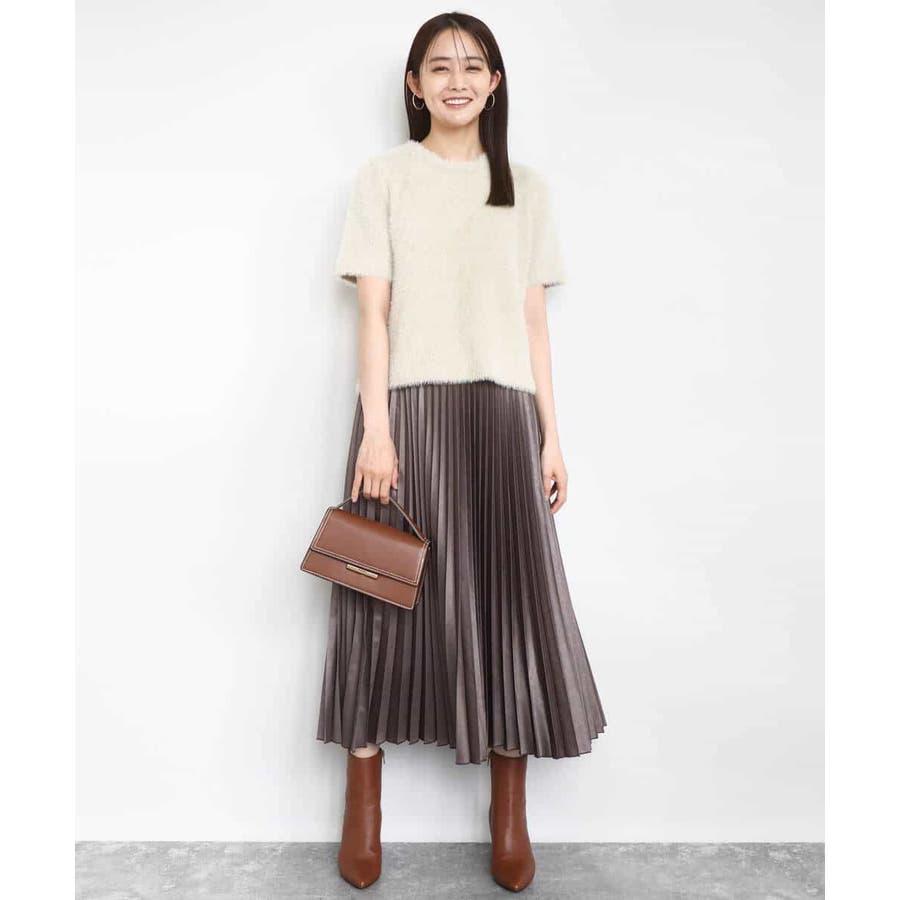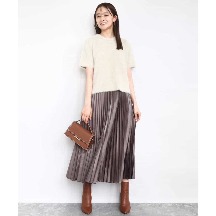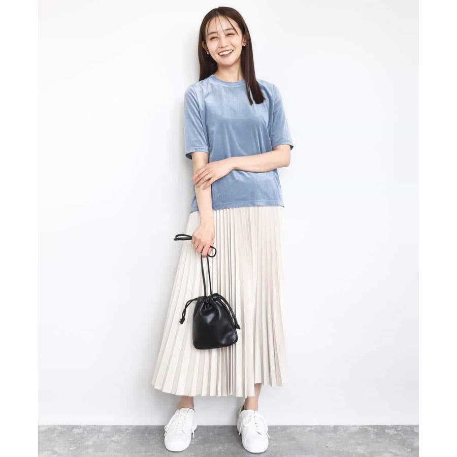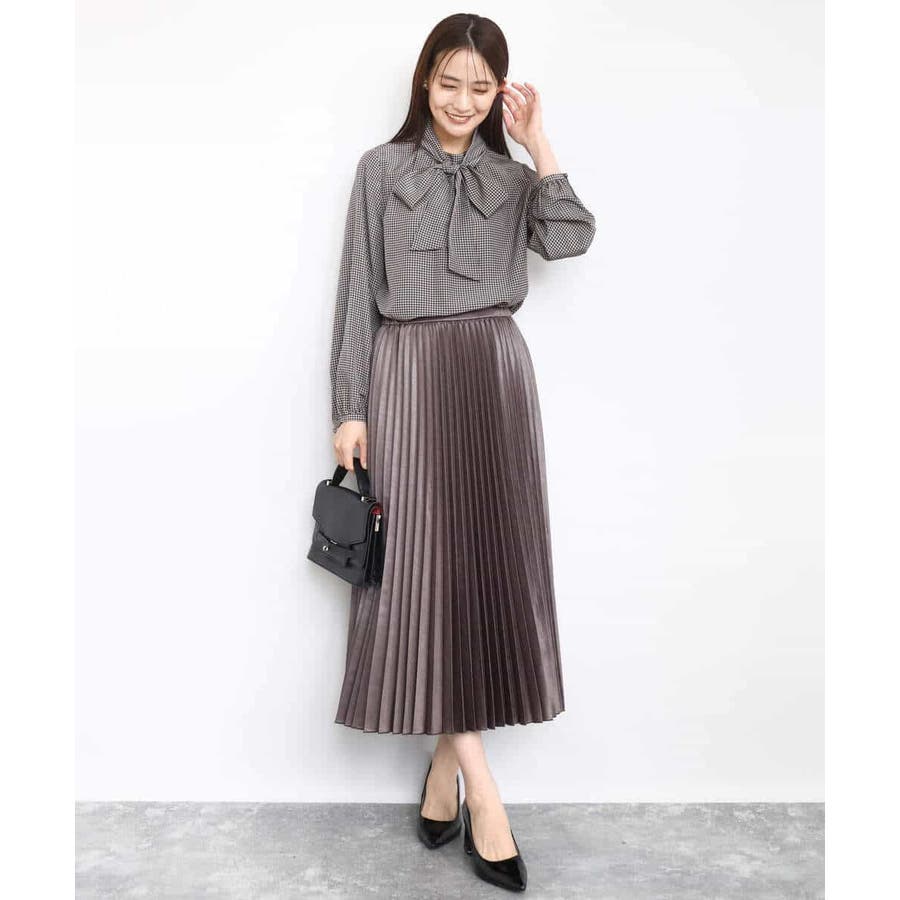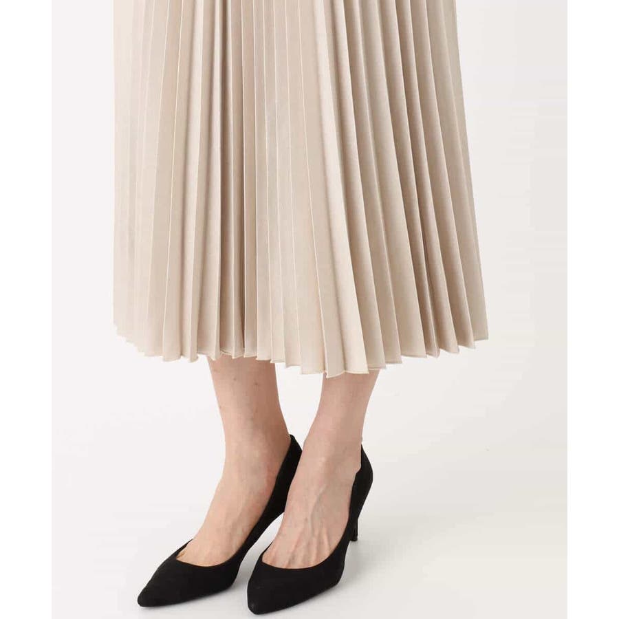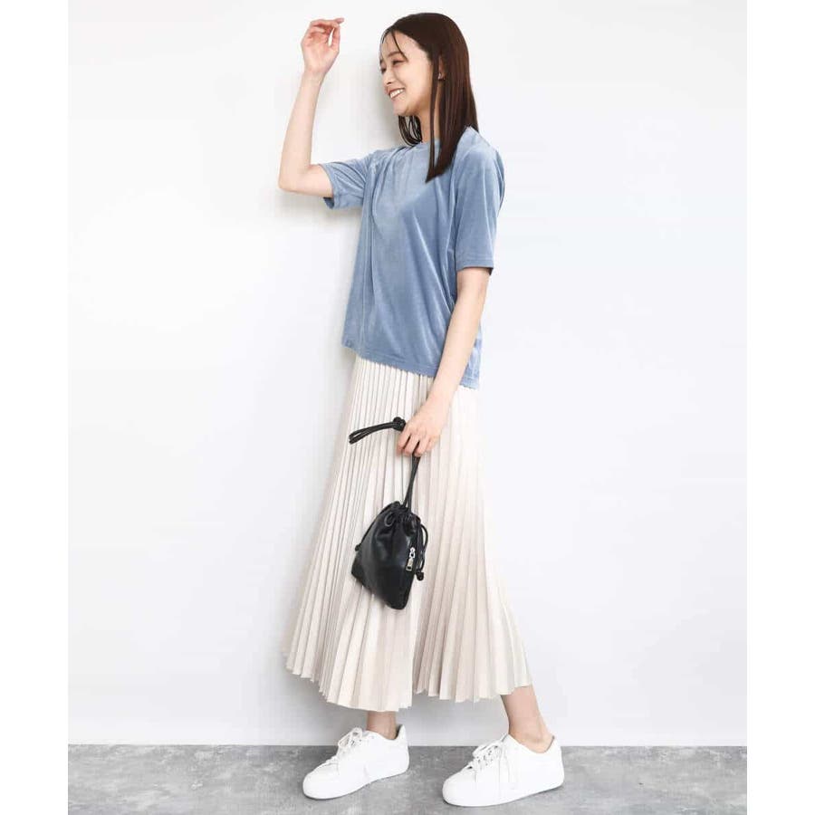 太幅と細幅が組み合わさった動きのあるプリーツがデザインポイントのスカート。軽い素材で動きに合わせて揺れるシルエットが女性らしい印象です。ウエストはバッグゴム仕様なので、様々な体型の方にフィットします。