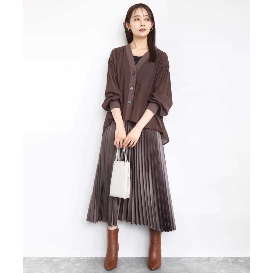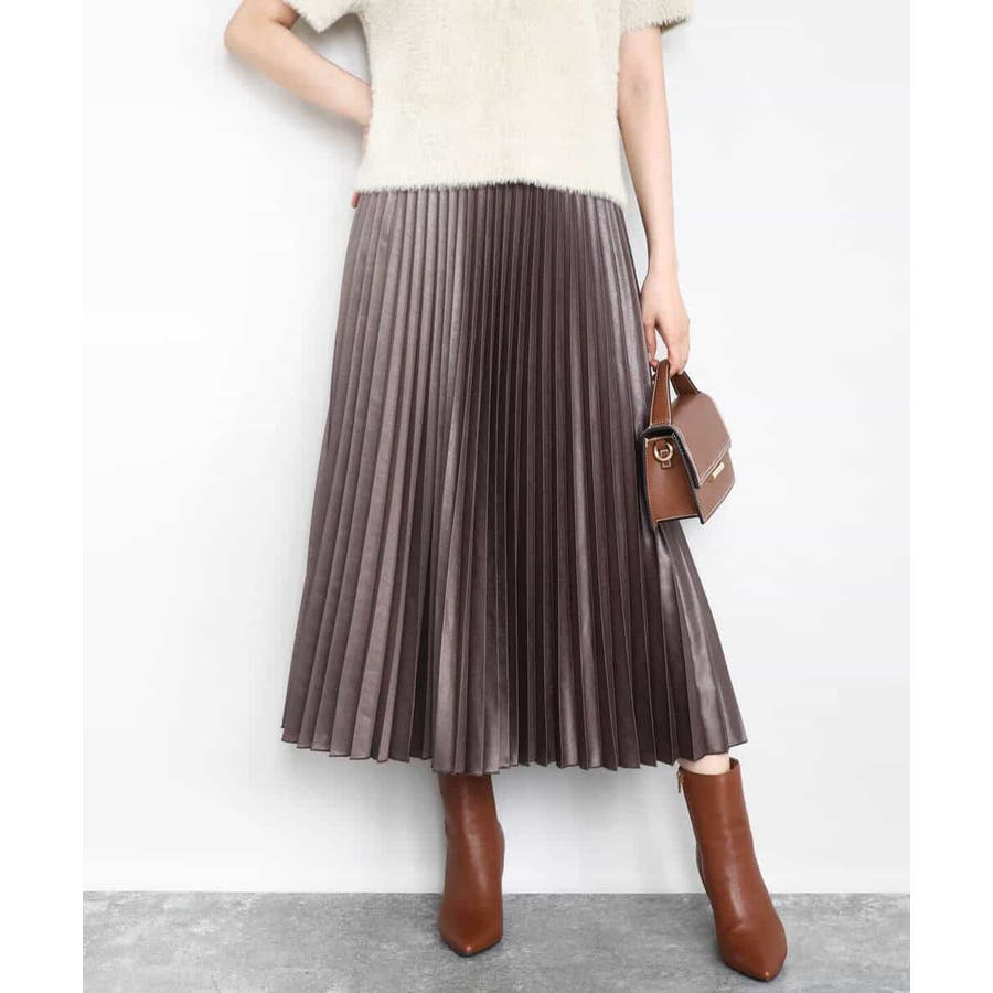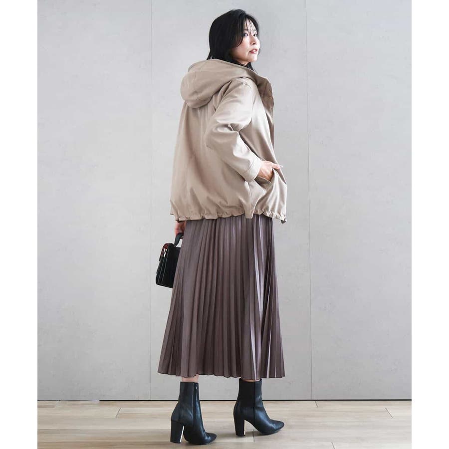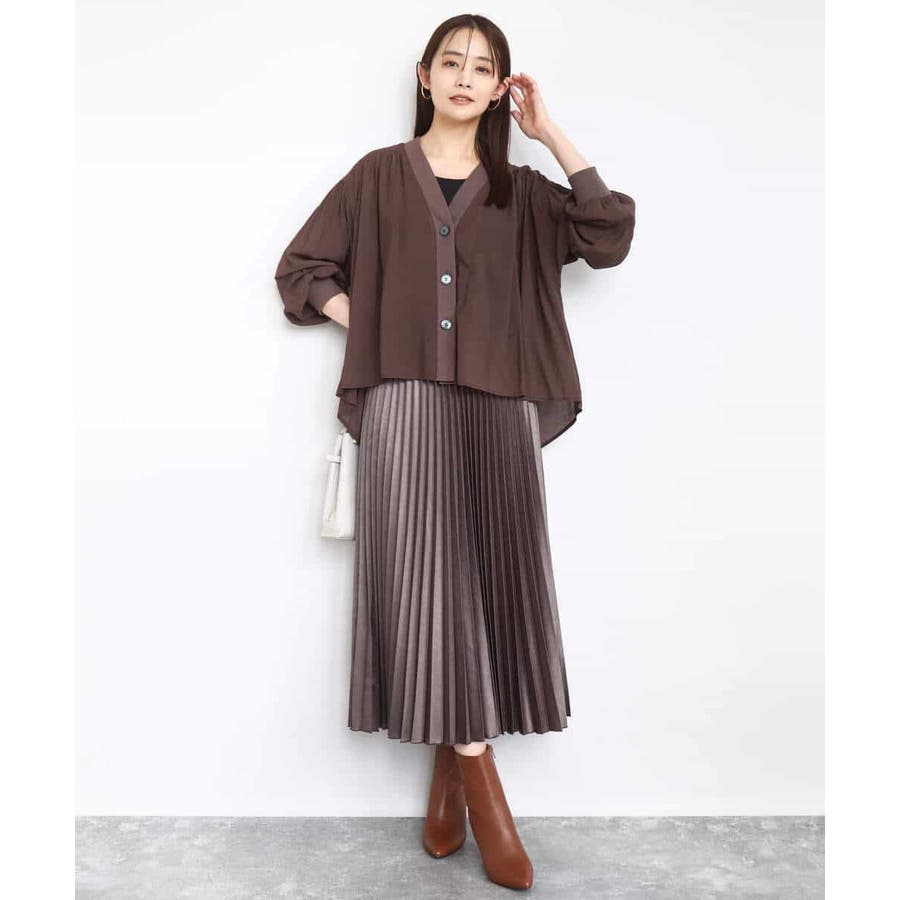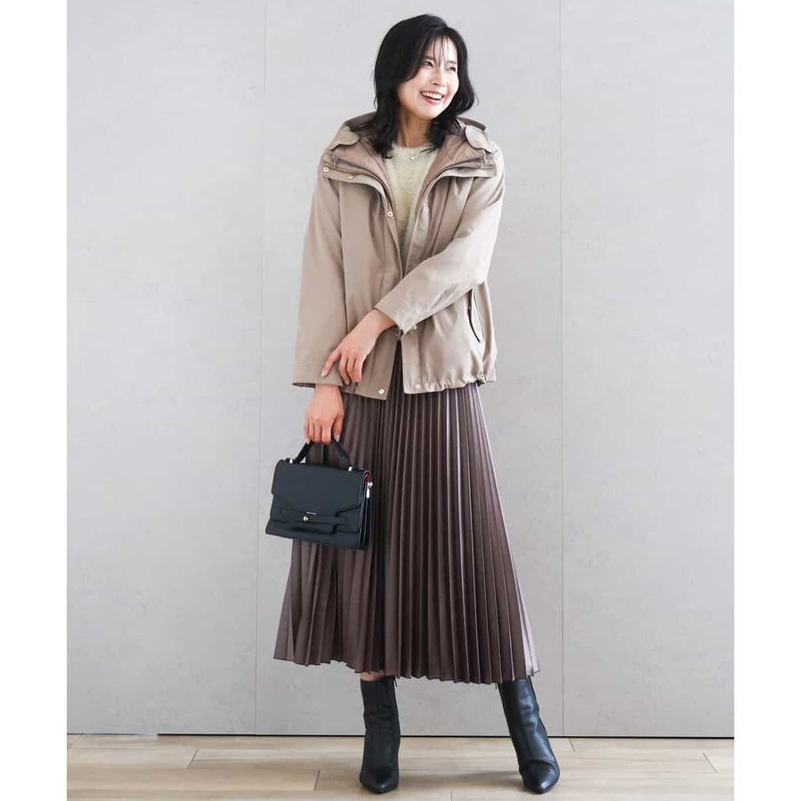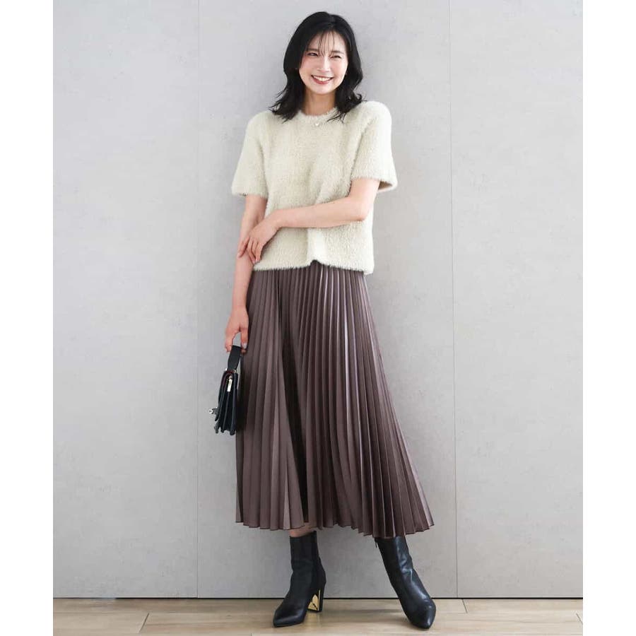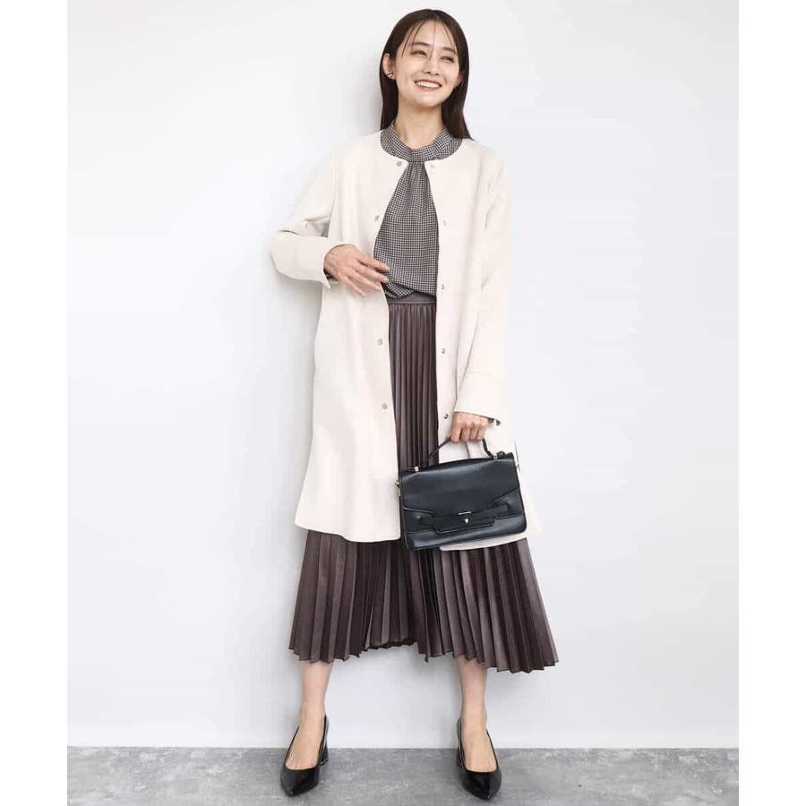 レザー調の素材を使用。レザーライクな表面ですが、ポリエステル100の合繊素材でとても軽くエアリーな印象の素材にプリーツ加工を施しました。高級感のある微光沢と軽さがポイントで、ロングシーズンで着用可能。