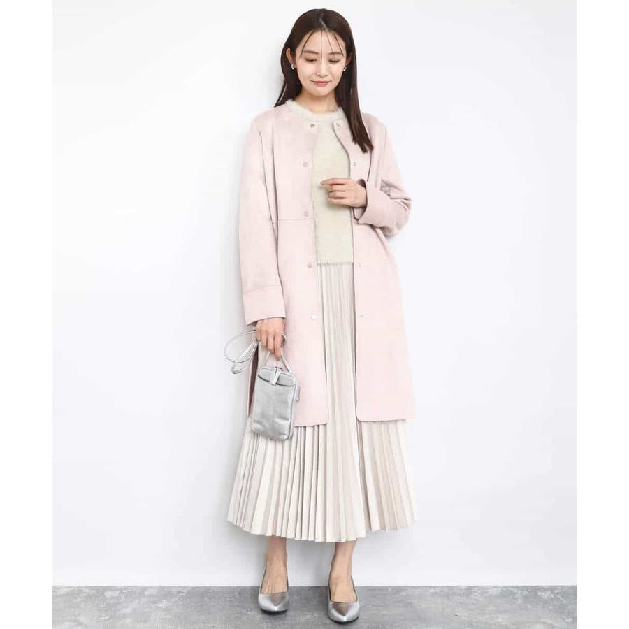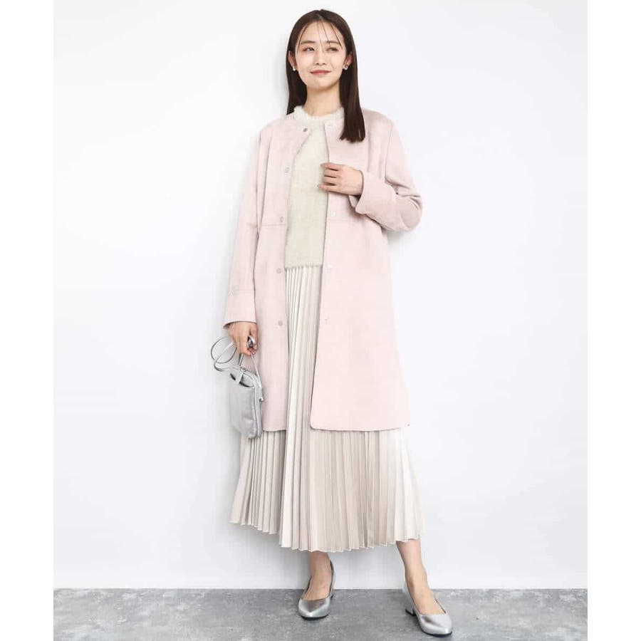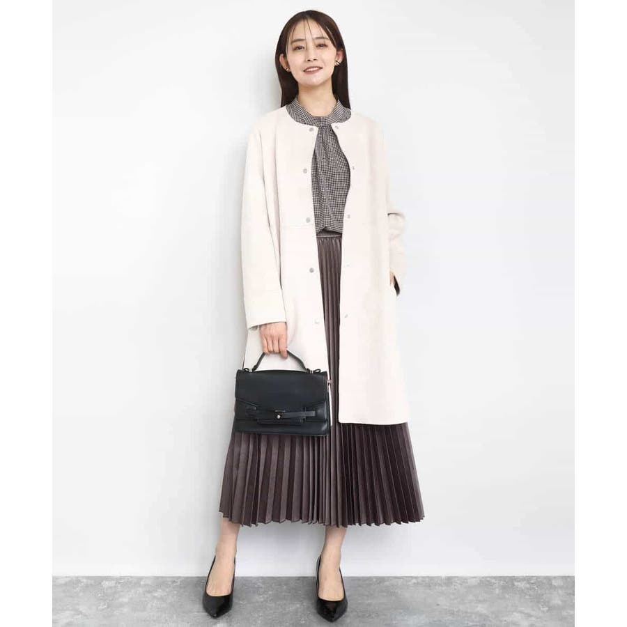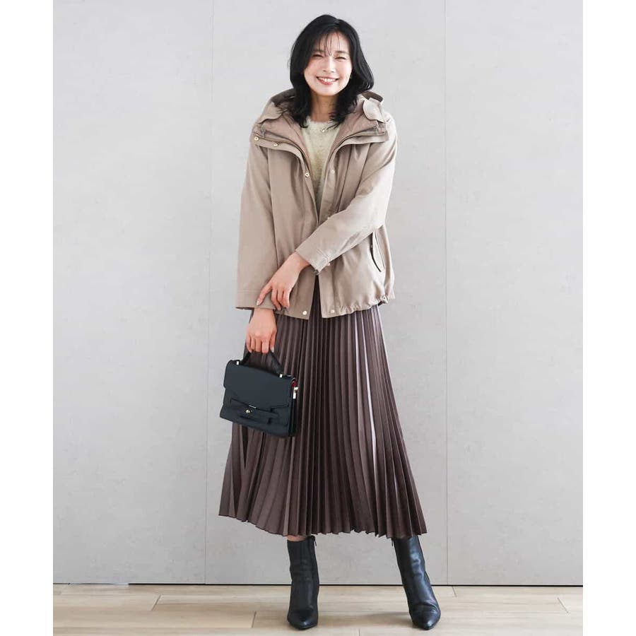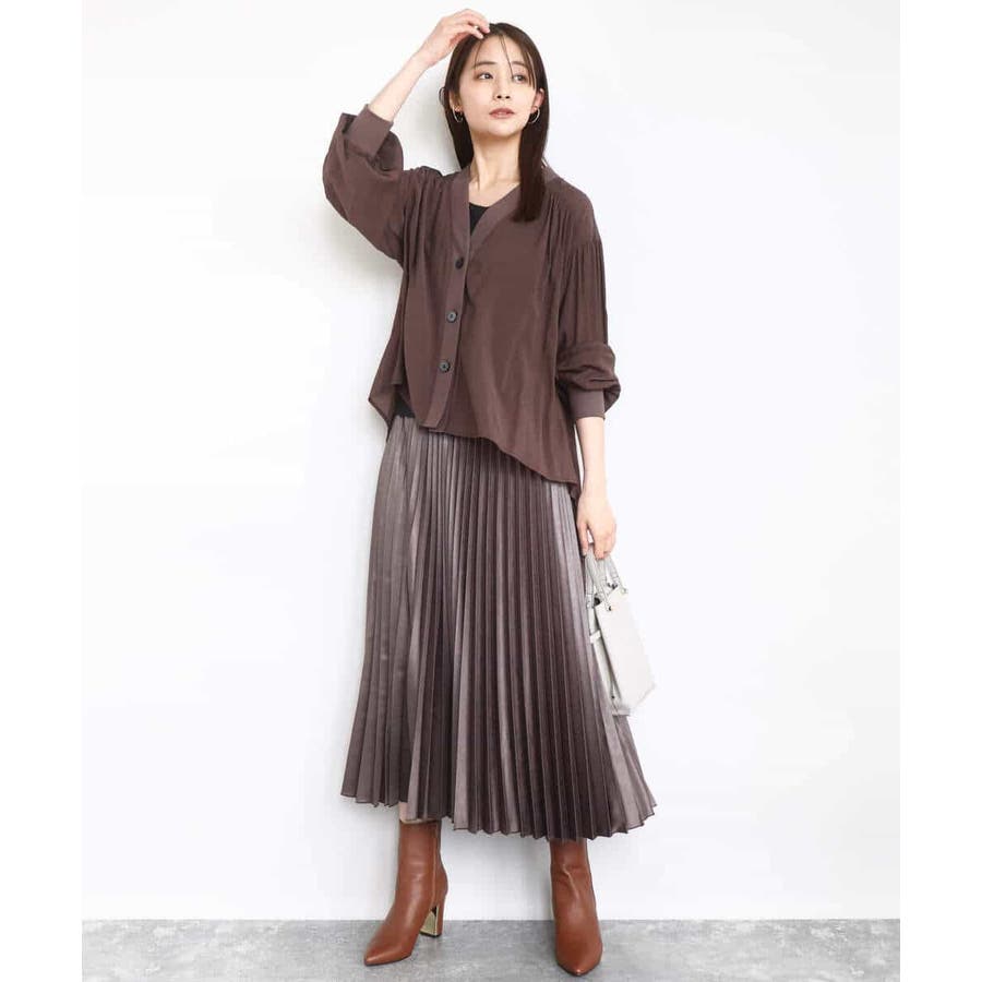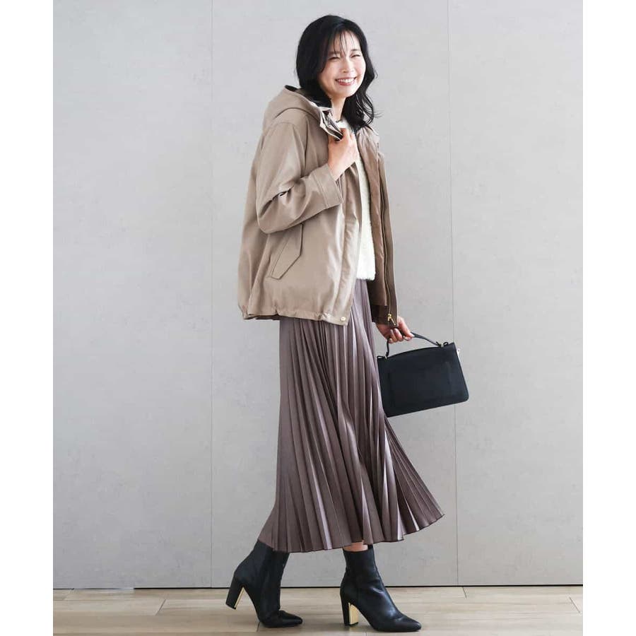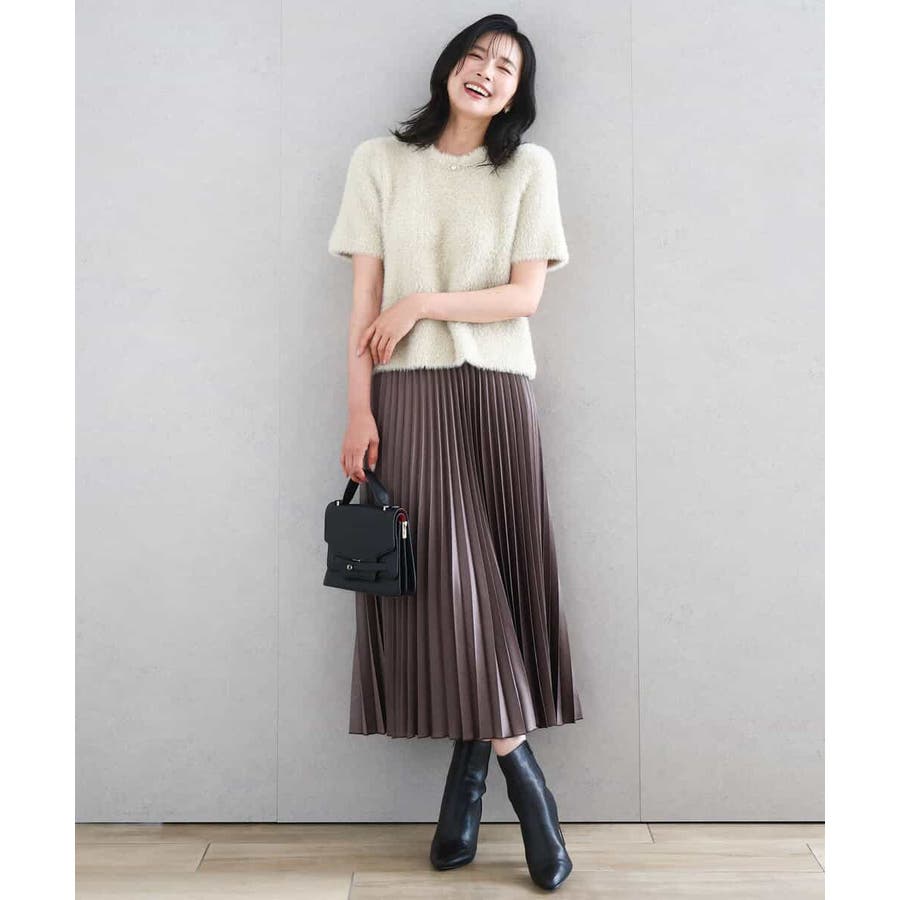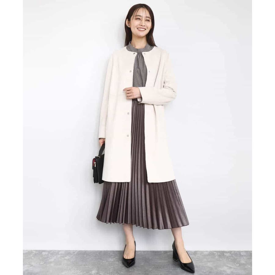 レザー調の素材を使用。レザーライクな表面ですが、ポリエステル100の合繊素材でとても軽くエアリーな印象の素材にプリーツ加工を施しました。高級感のある微光沢と軽さがポイントで、ロングシーズンで着用可能。