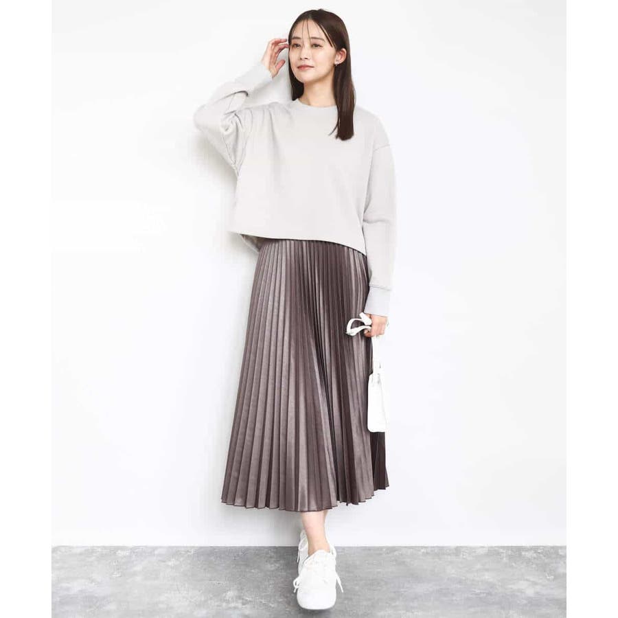 着こなし次第でカジュアルにもきれいにも着こなせるスカートは使い勝手の良さが魅力的。程よい光沢感は、Tシャツ合わせでも大人っぽさをプラスしてくれます。正面ウエストはゴムではなくすっきりとしたデザインなので、トップスをインしてきれいめコーデもハマります。