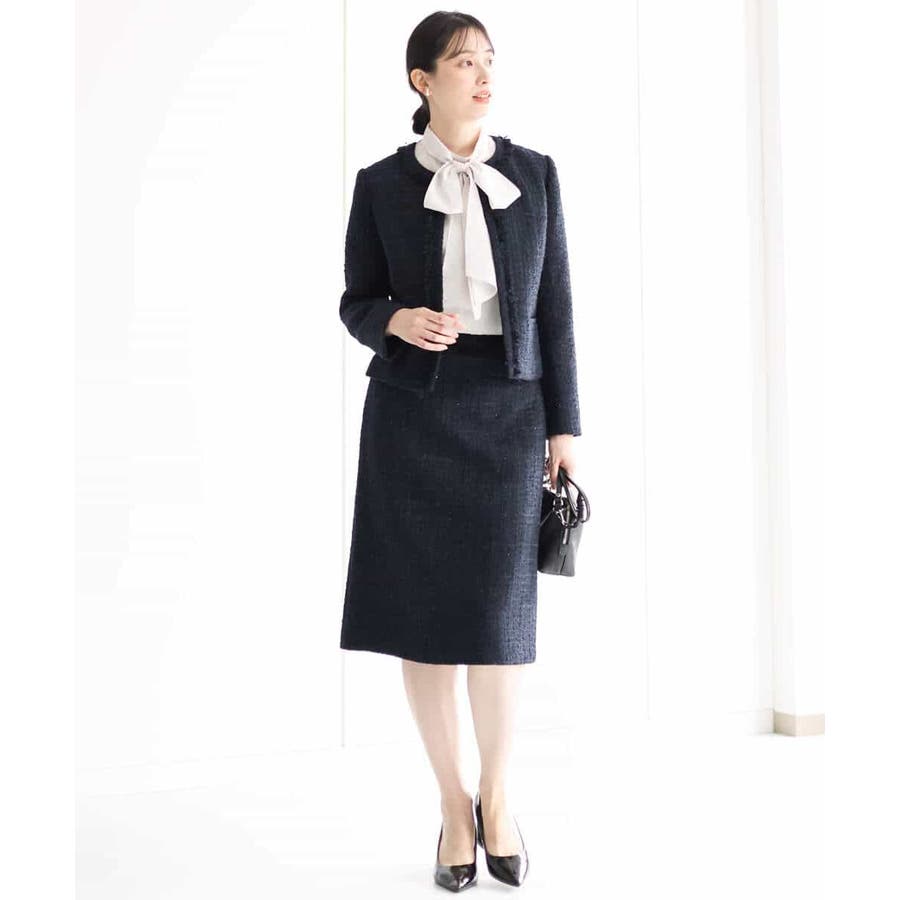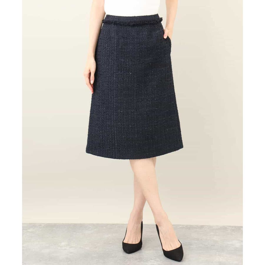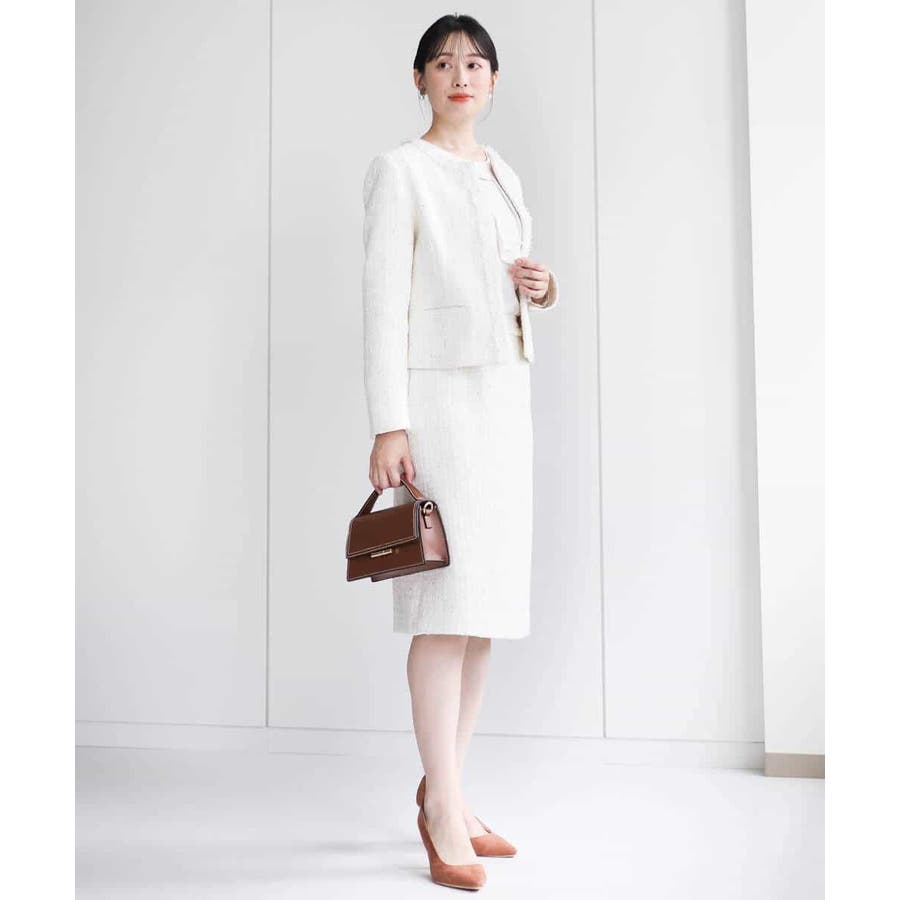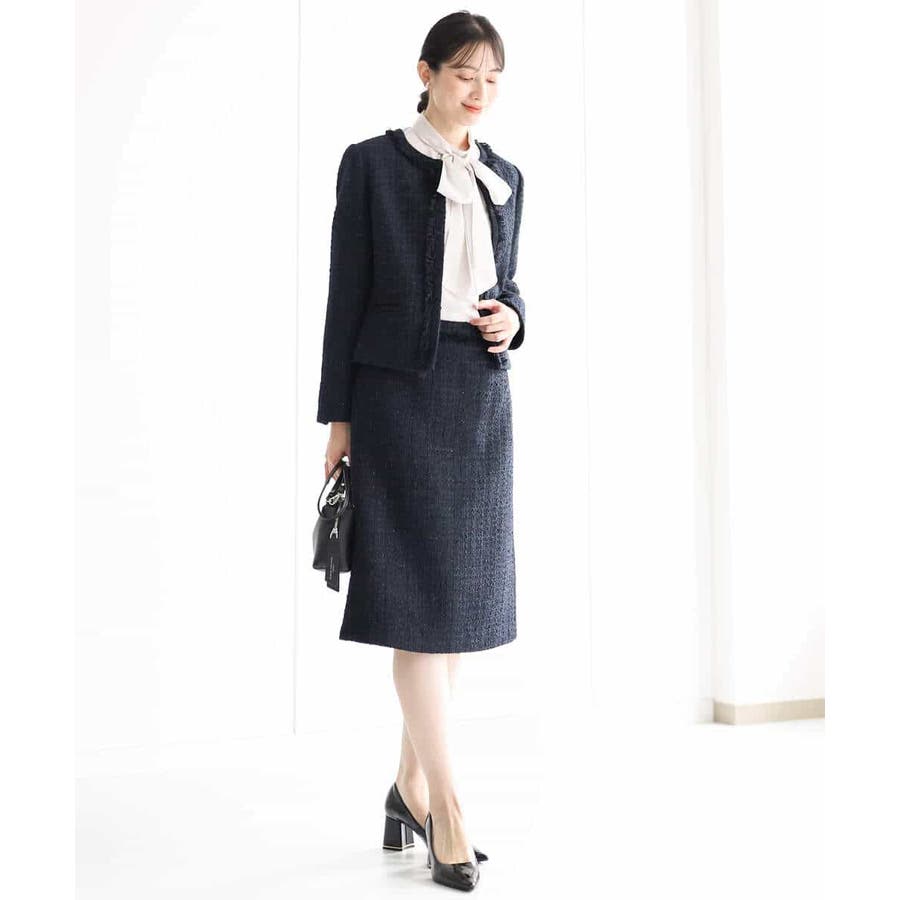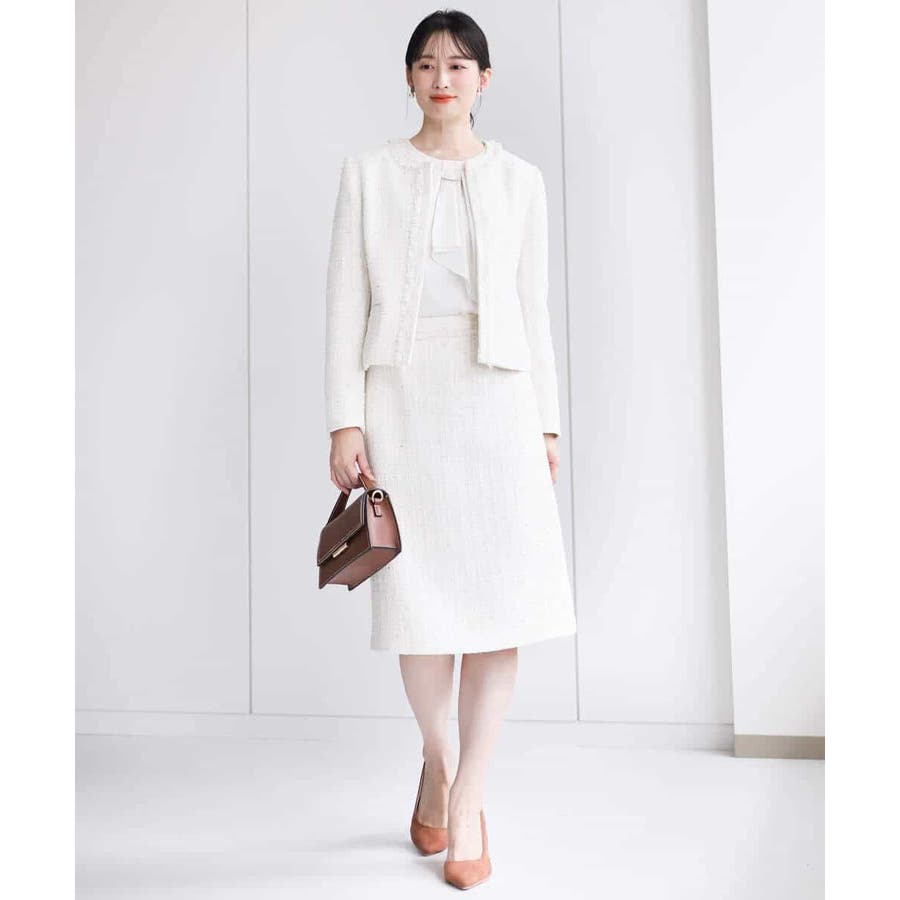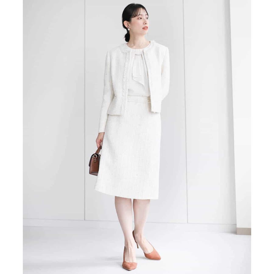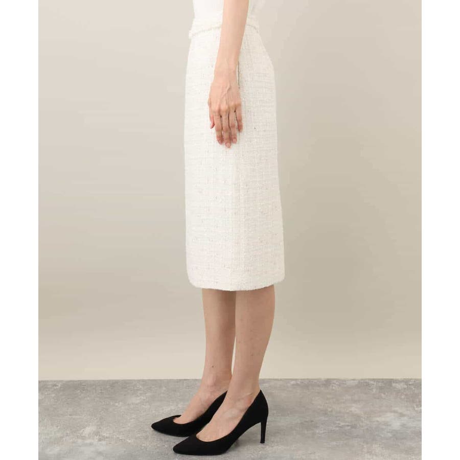 体のラインを拾わない、タイトすぎないややフレアシルエットに仕上げたツイードスカート。対のジャケットとバランスを取りやすい丈に仕上げました。椅子に座った時にも安心できる丈感で、セレモニーシーンなど式典の再にも安心して着用いただけます。