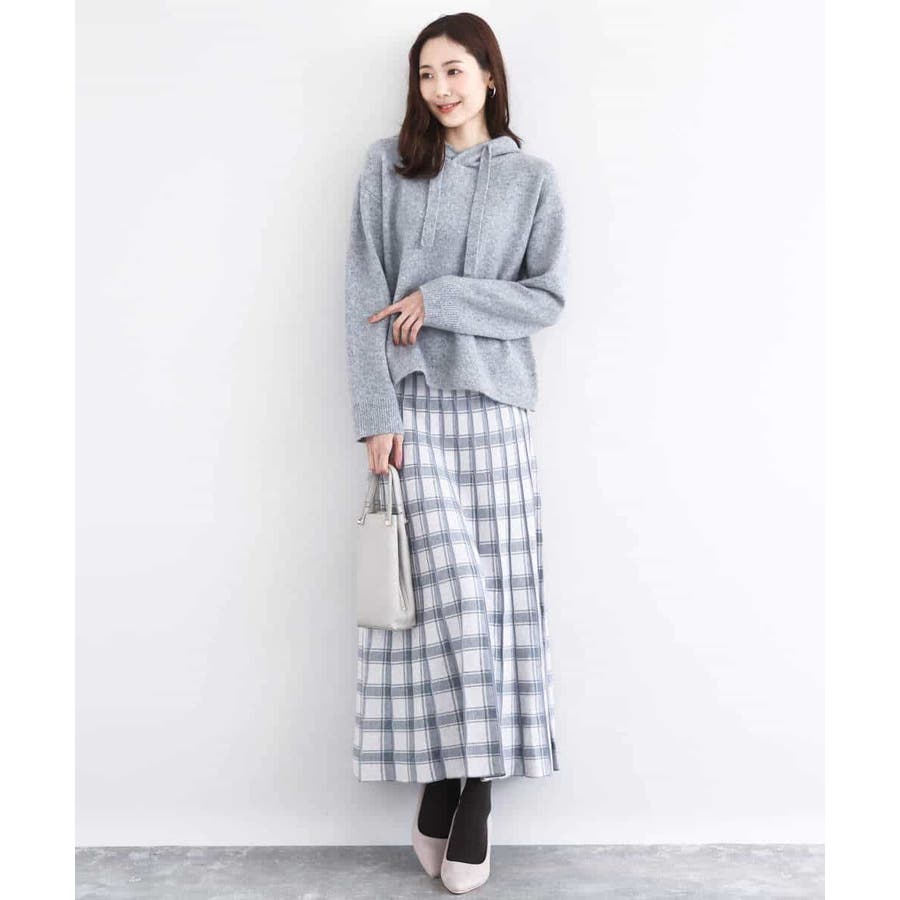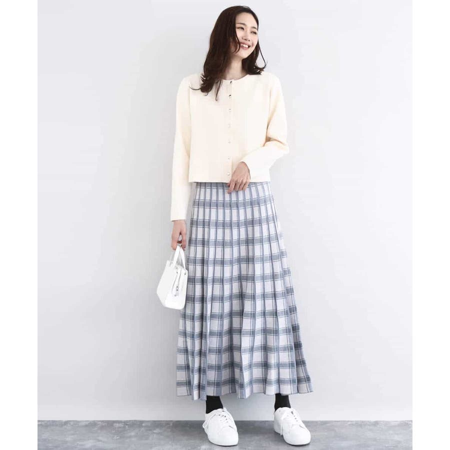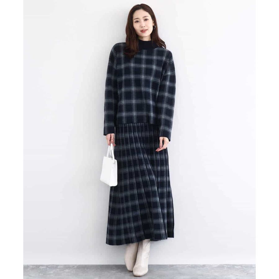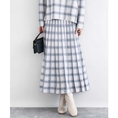 ニットのチェックプリーツスカート。腰回りがタイトになりすぎないよう、ふんわりと広がるシルエットにこだわりました。これ一枚でコーデが映える主役級スカートです。