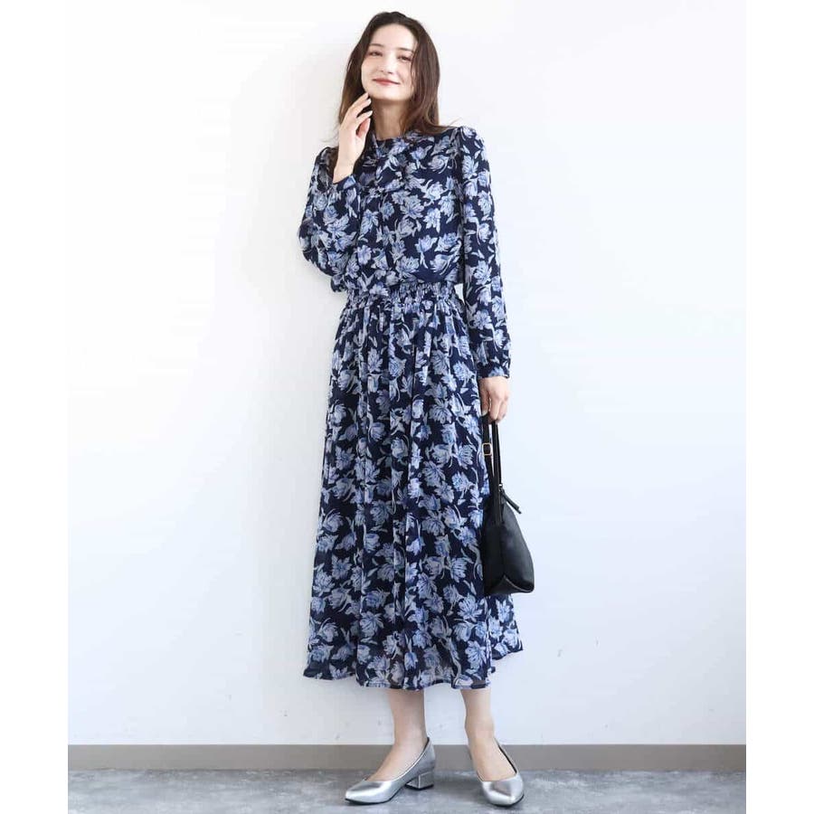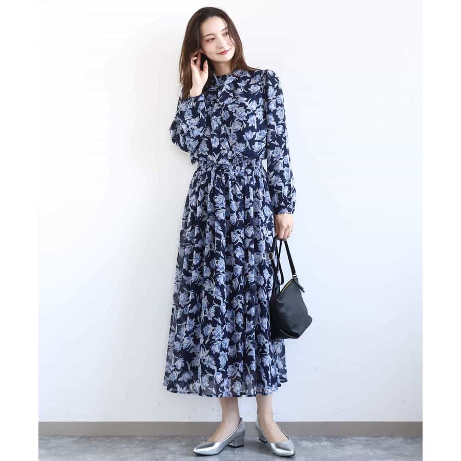 大胆な花柄プリントが目を引く、シフォンスカート。ブルーベースのカラーが春らしく、動くたびに揺れるシフォン素材が軽やかな印象です。広がりすぎず、ストンと落ちるシルエットなので、着ぶくれせずスタイルアップして見えました。ウエストはゴム仕様で、穿き心地もラク。ストレス感なく着られます。着丈は152cmの私で、くるぶし丈くらいの長さでした。