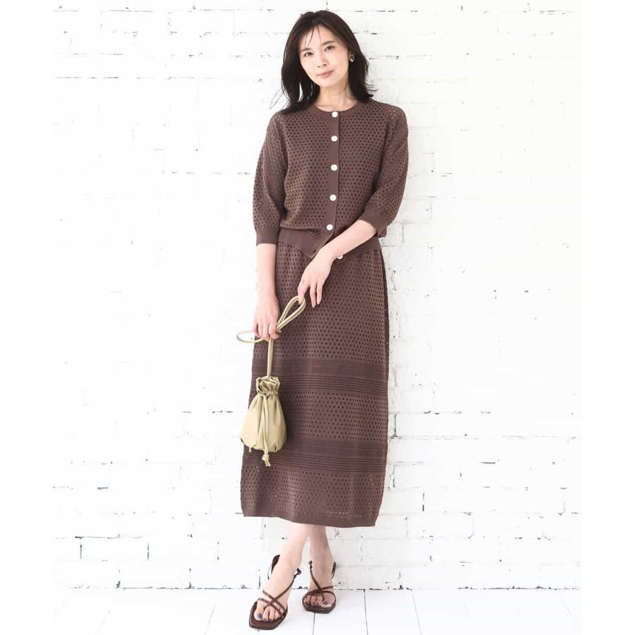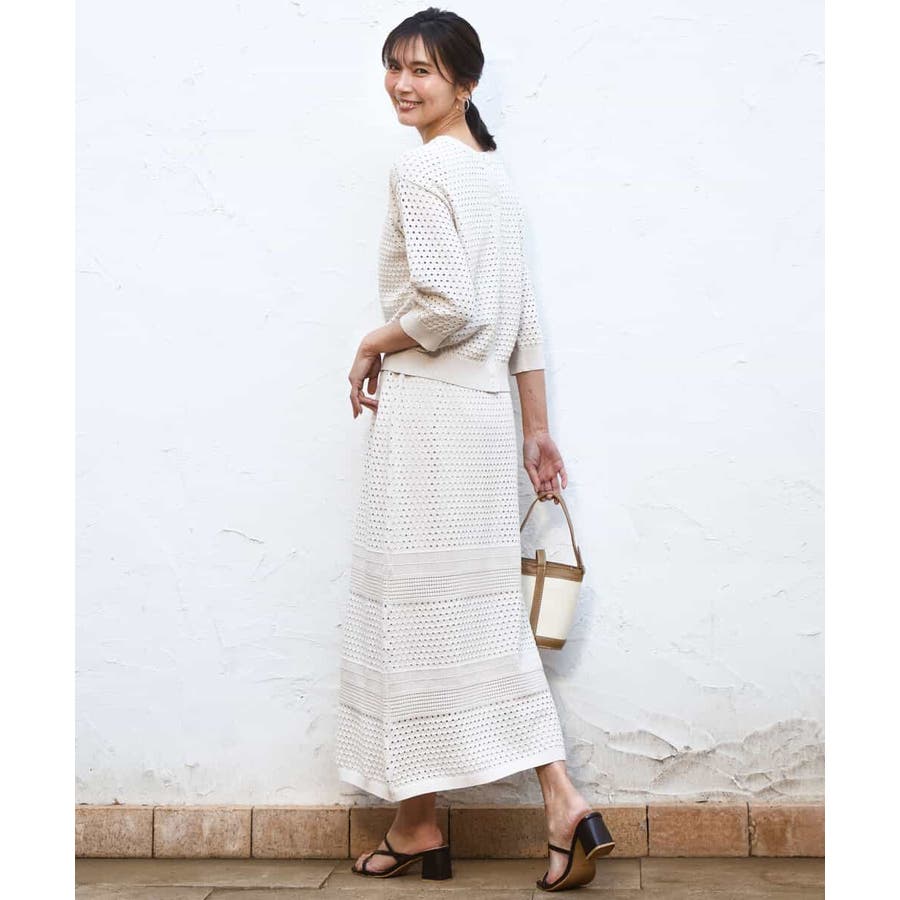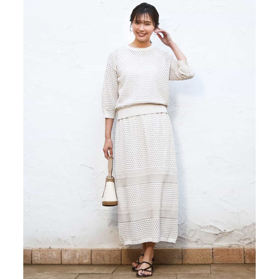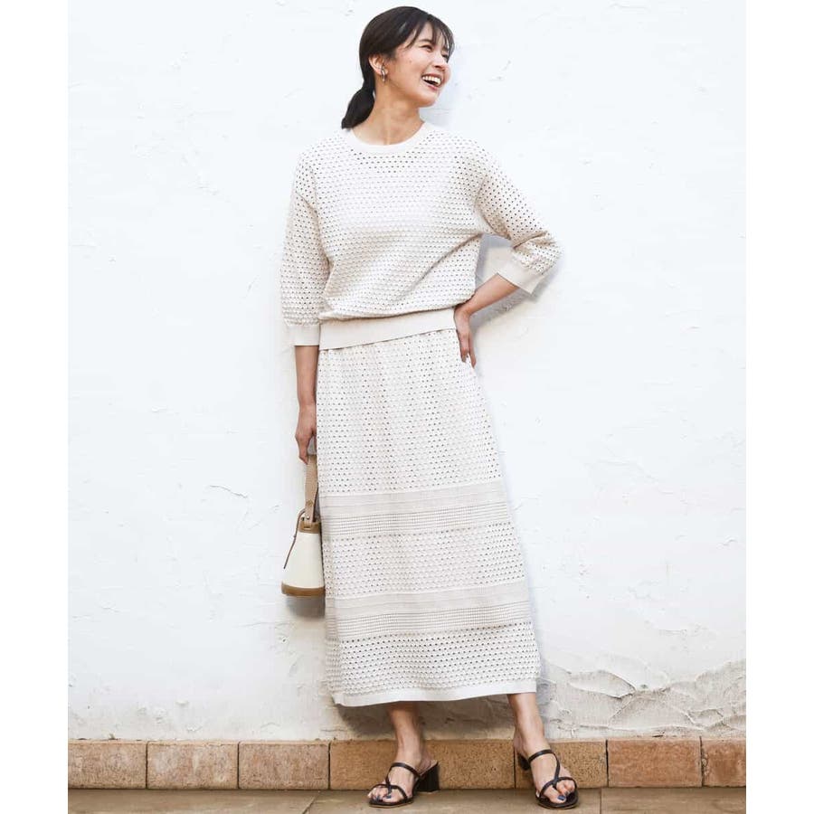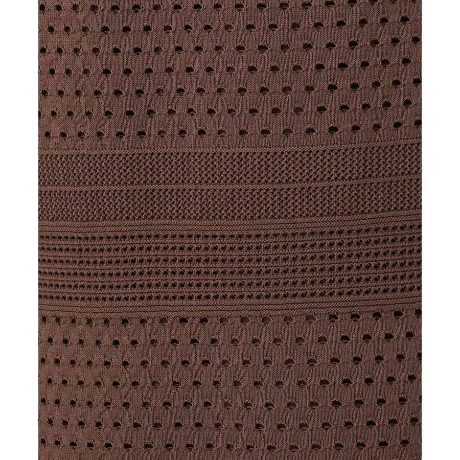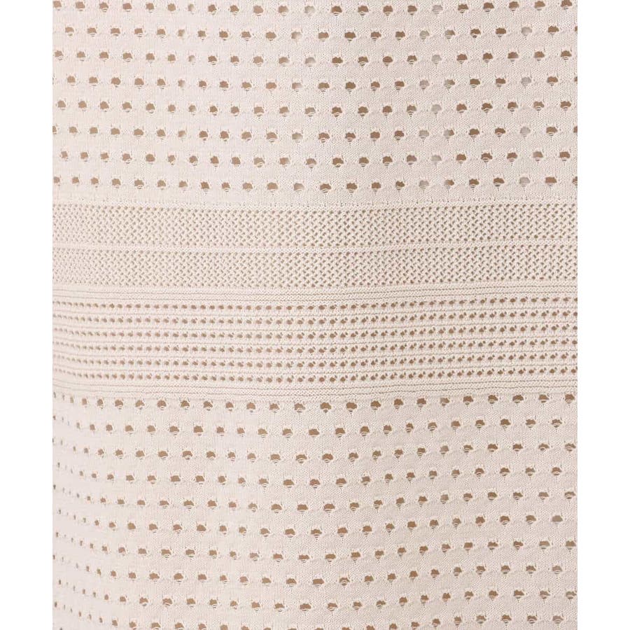 ドット風のアイレット編地、ボーダー状にクロシェ風のメッシュ柄を入れ、一枚で着映えるデザインに。ボディラインを拾いにくく、裾に向かって少しだけ広がるすっきりとしたシルエットです。