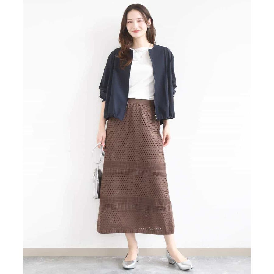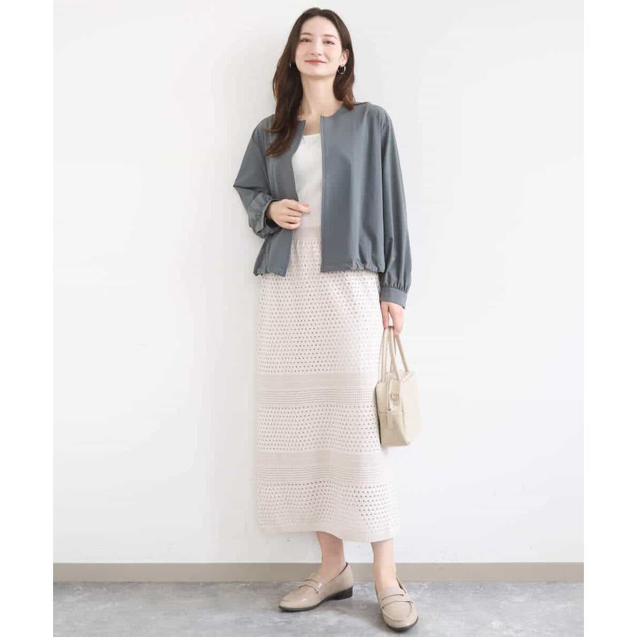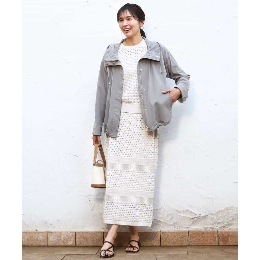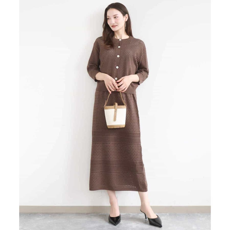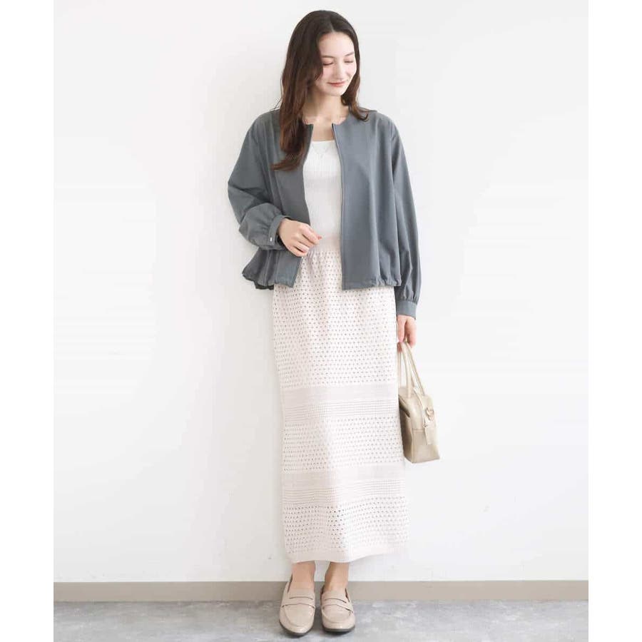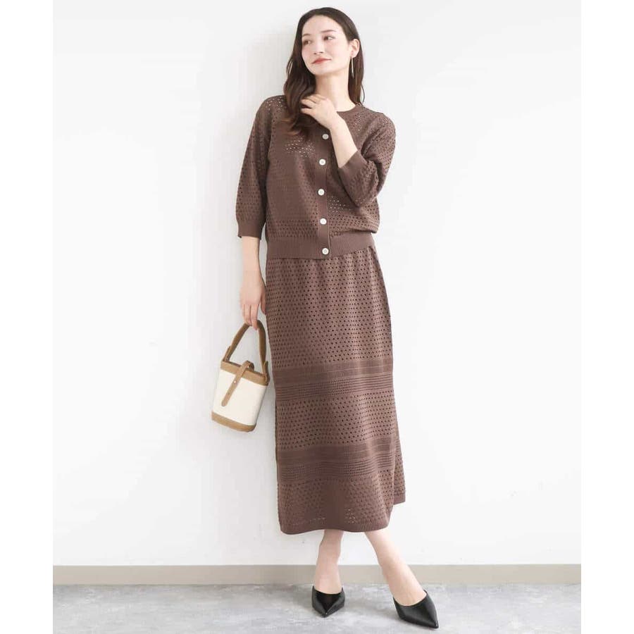 ドット風のアイレット編地、ボーダー状にクロシェ風のメッシュ柄を入れ、一枚で着映えるデザインに。ボディラインを拾いにくく、裾に向かって少しだけ広がるすっきりとしたシルエットです。