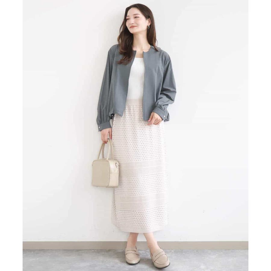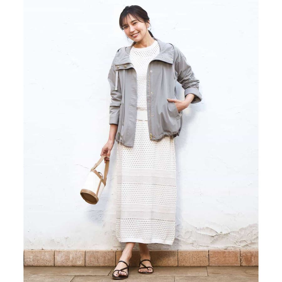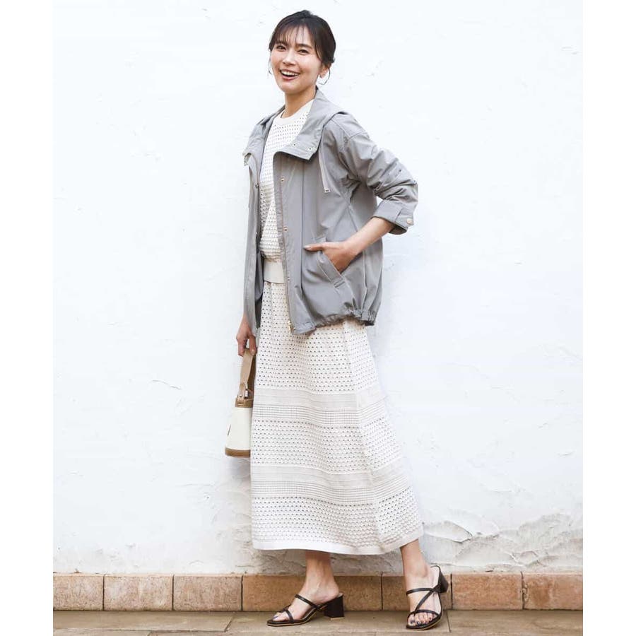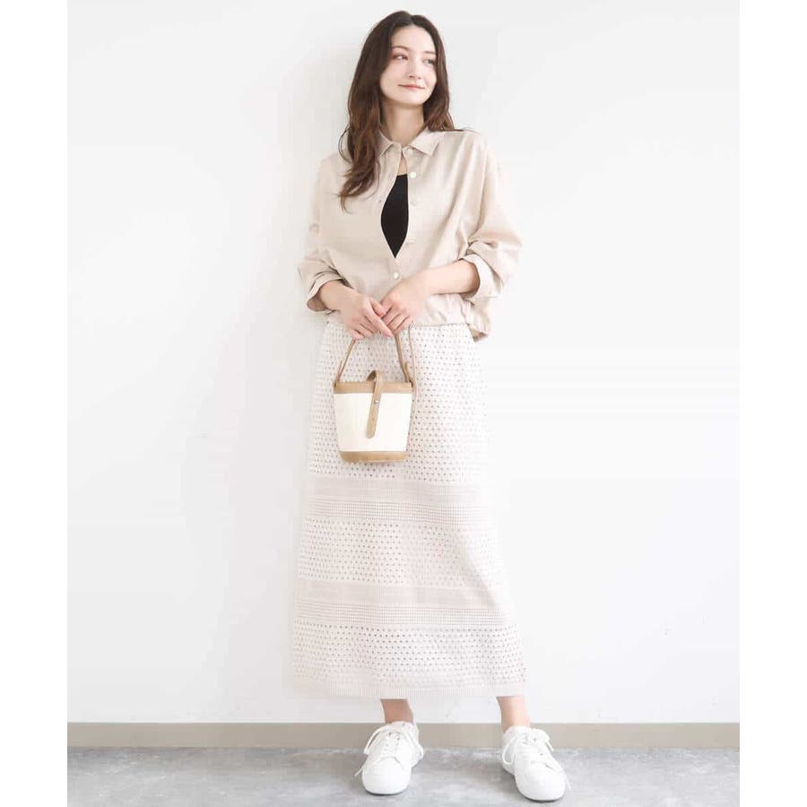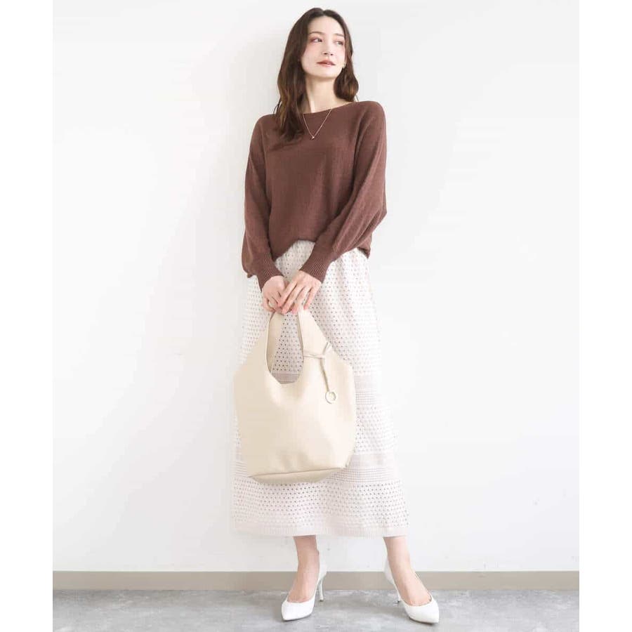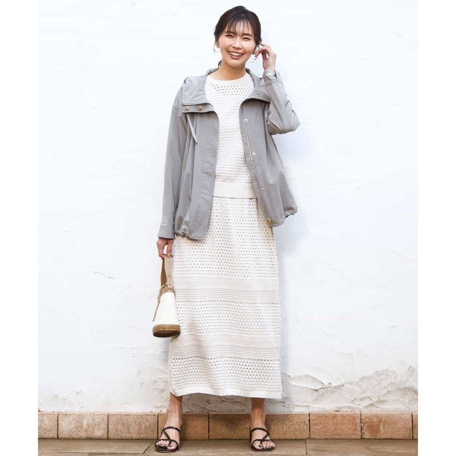 ドット風のアイレット編地、ボーダー状にクロシェ風のメッシュ柄を入れ、一枚で着映えるデザインに。ボディラインを拾いにくく、裾に向かって少しだけ広がるすっきりとしたシルエットです。