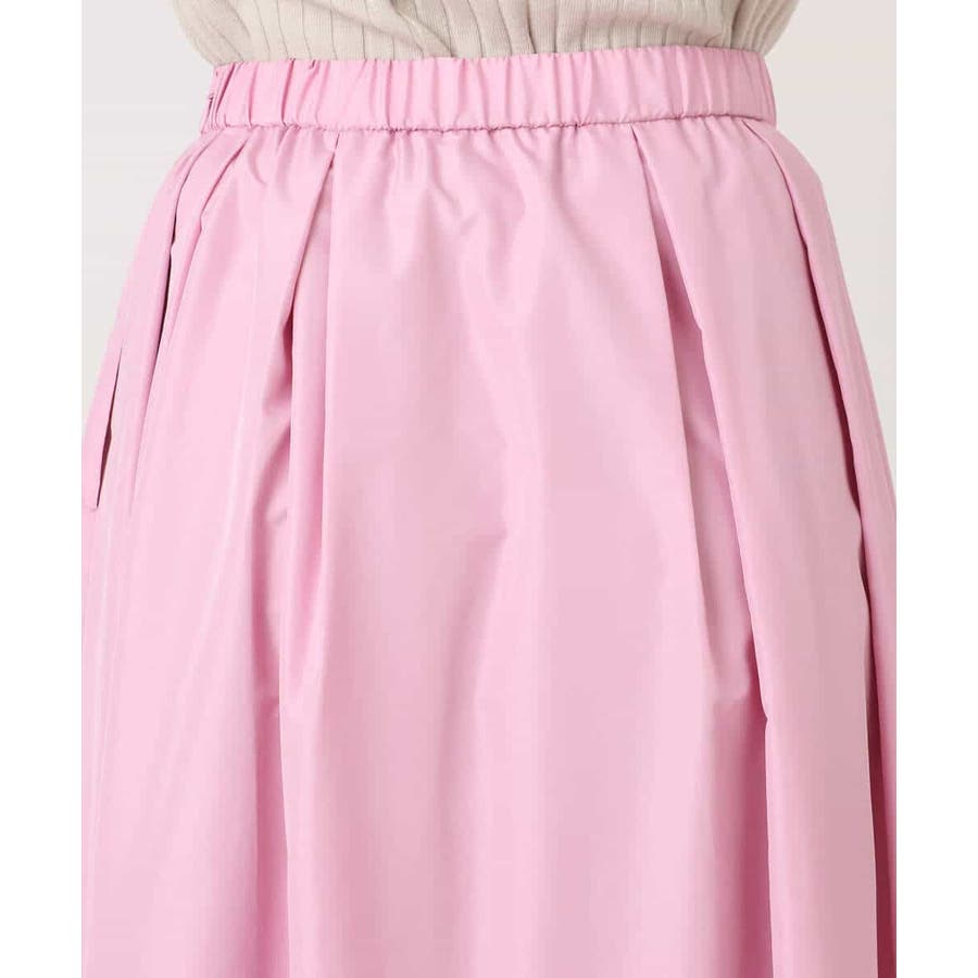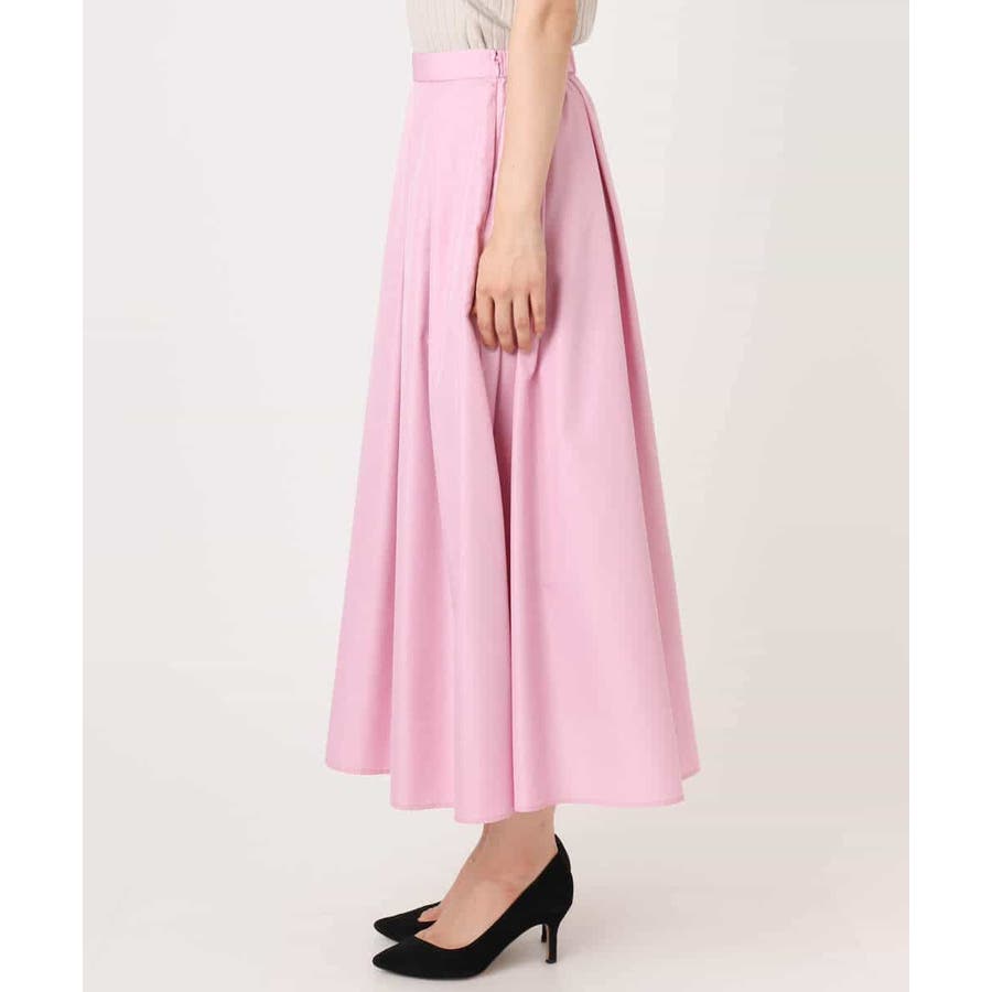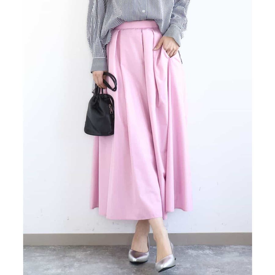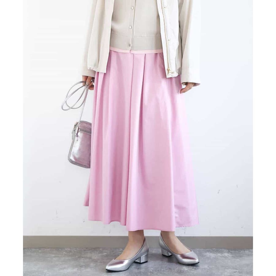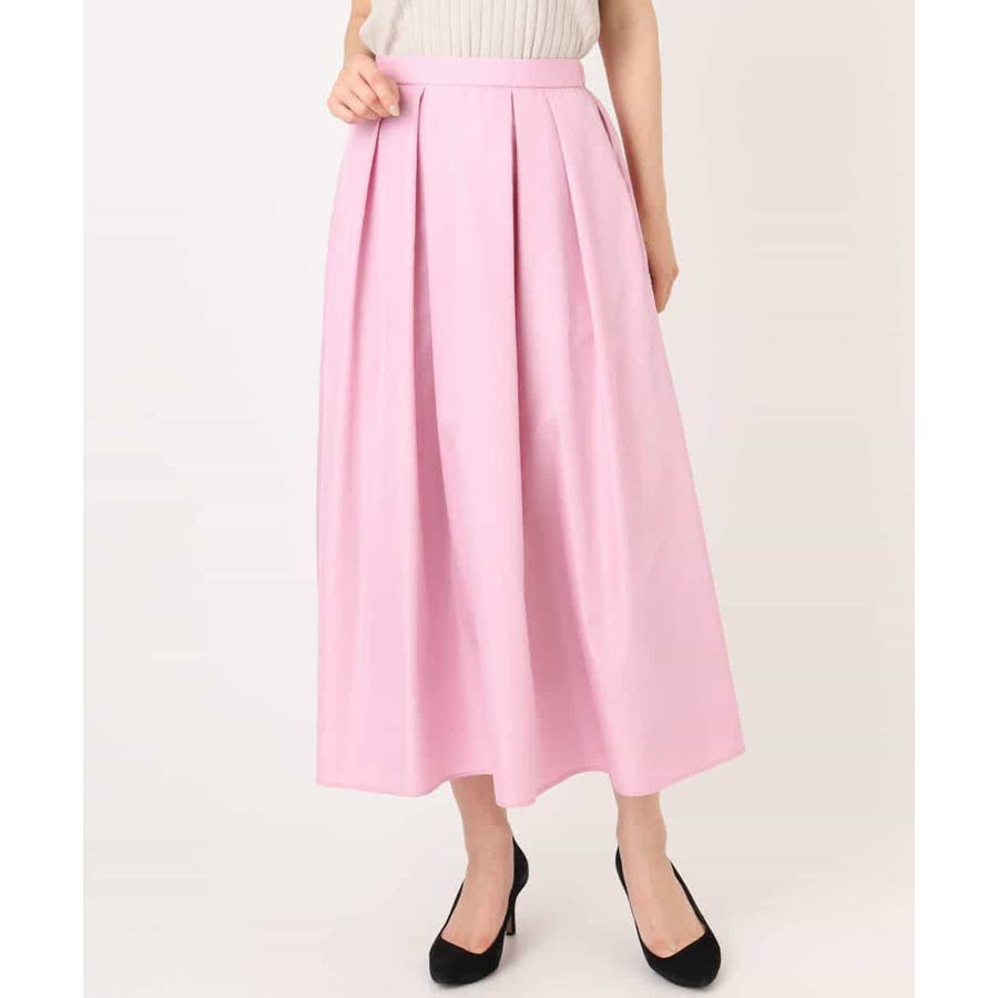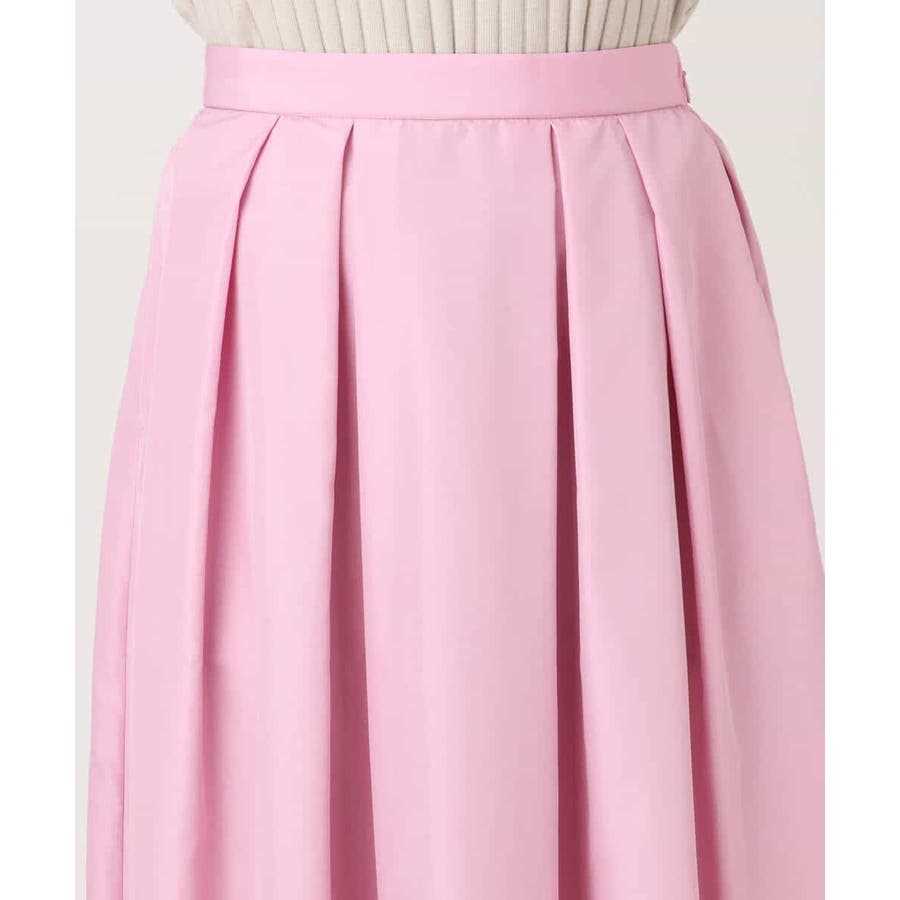 ぱっと目をひく青みピンクの色合いがきれいなタックフレアスカート。ウエストから裾にかけてきれいに広がるシルエットが大人の可愛らしさを表現。