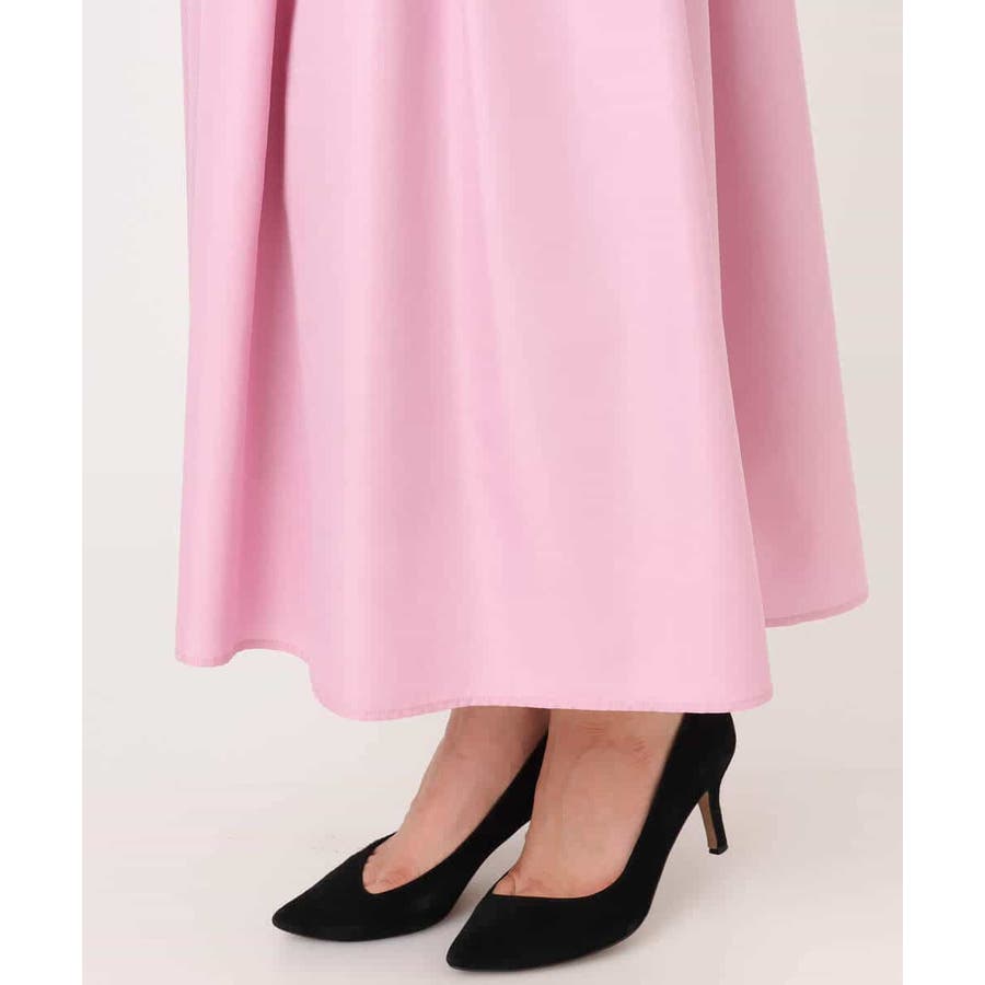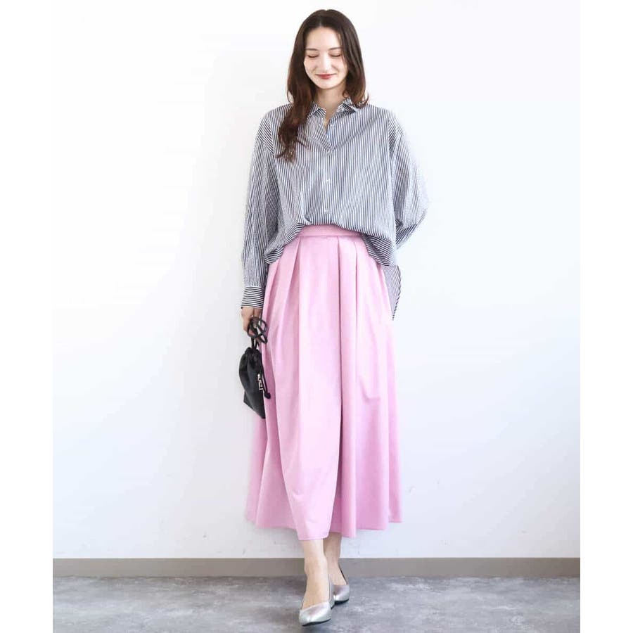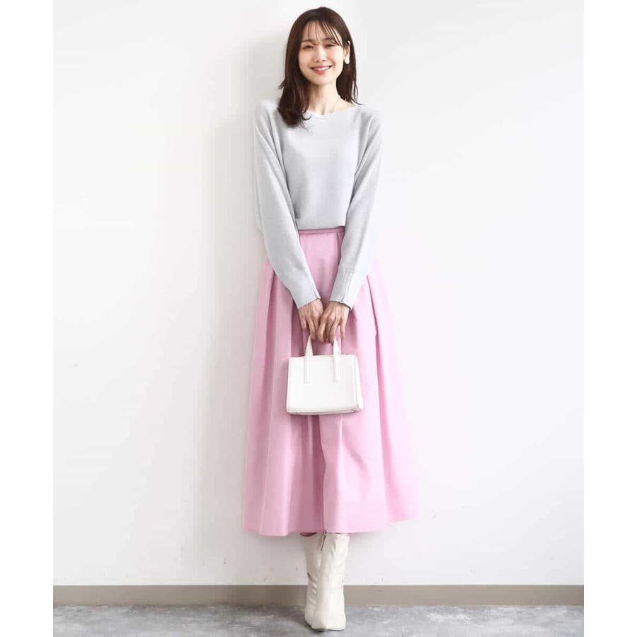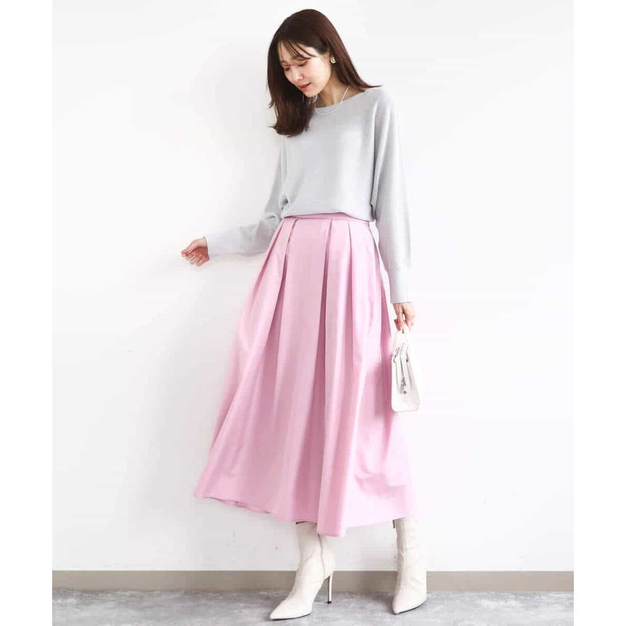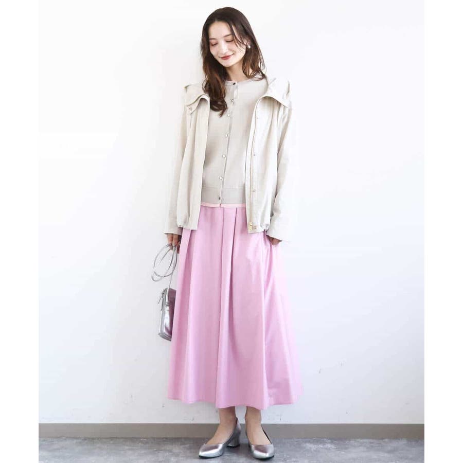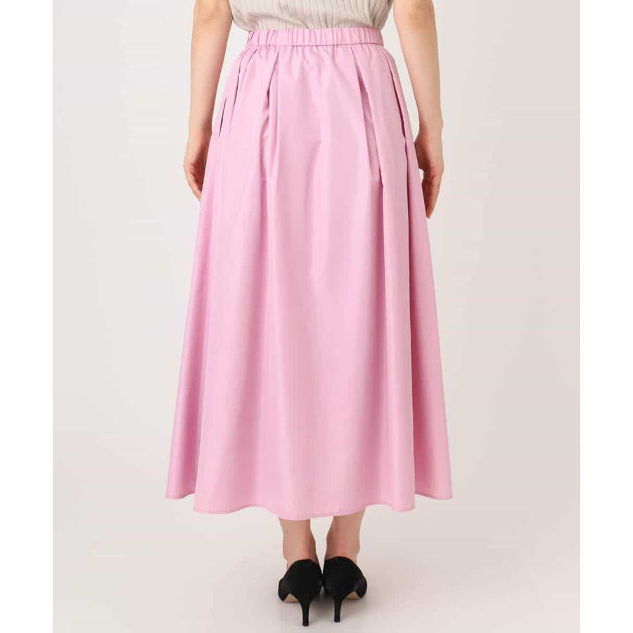 ぱっと目をひく青みピンクの色合いがきれいなタックフレアスカート。ウエストから裾にかけてきれいに広がるシルエットが大人の可愛らしさを表現。