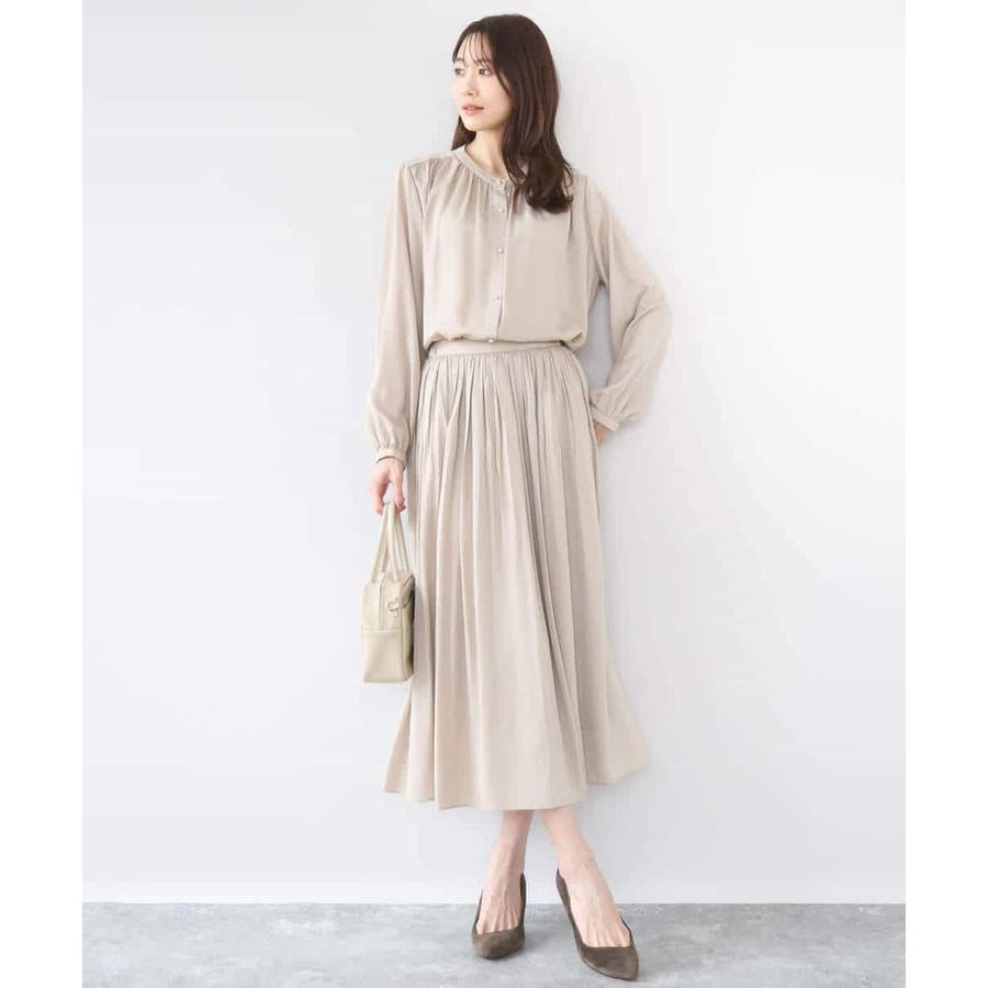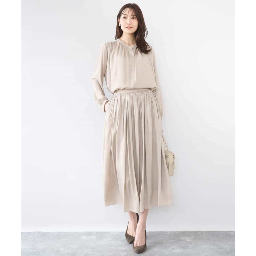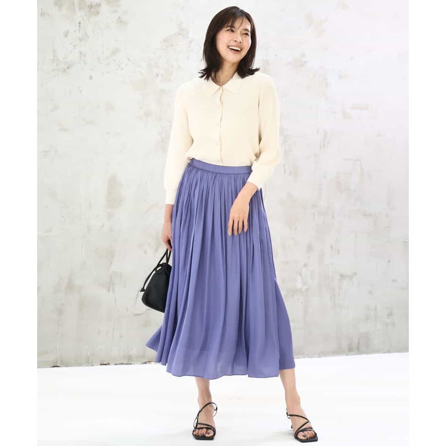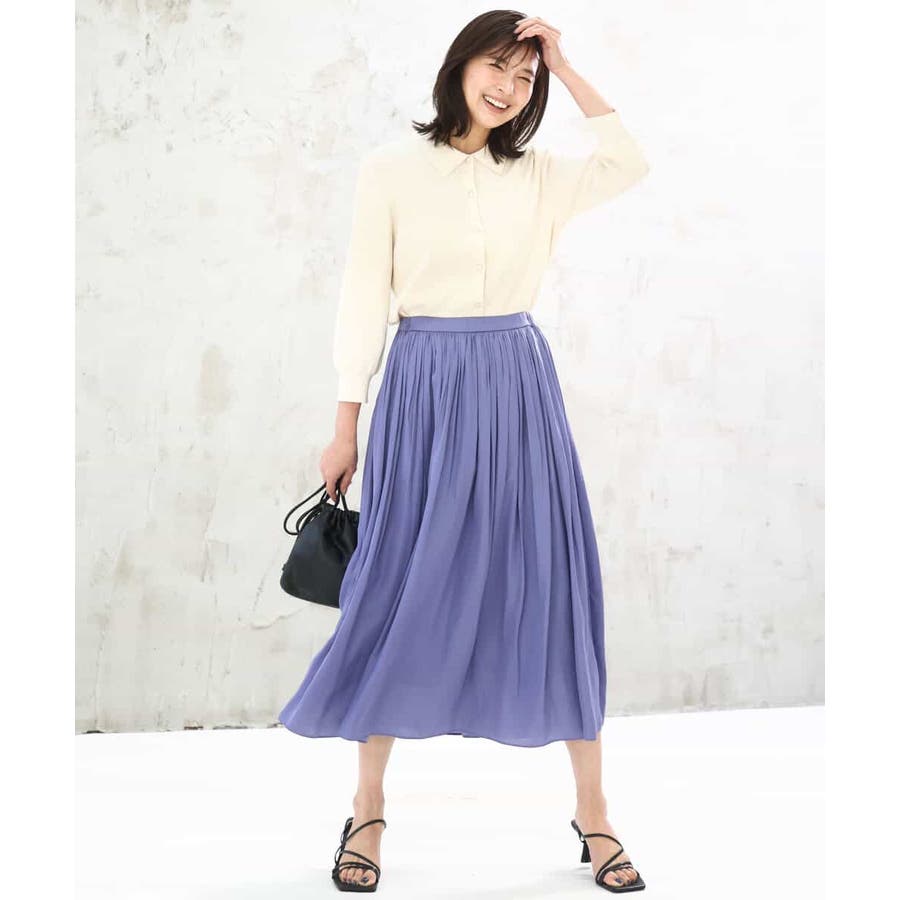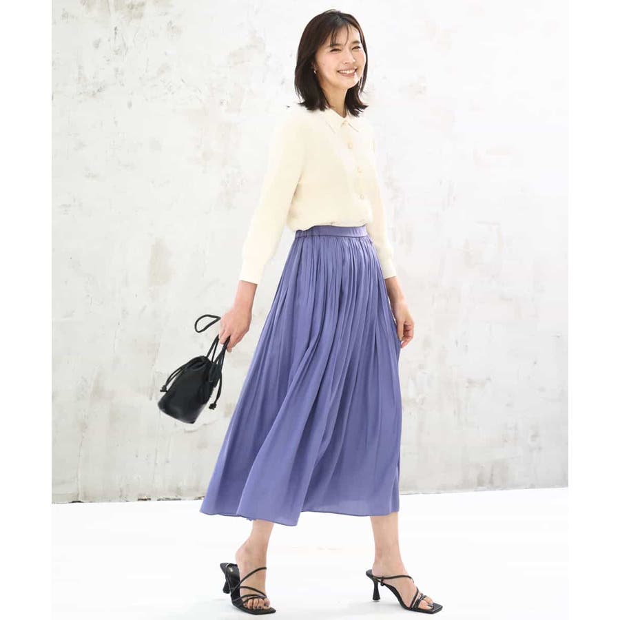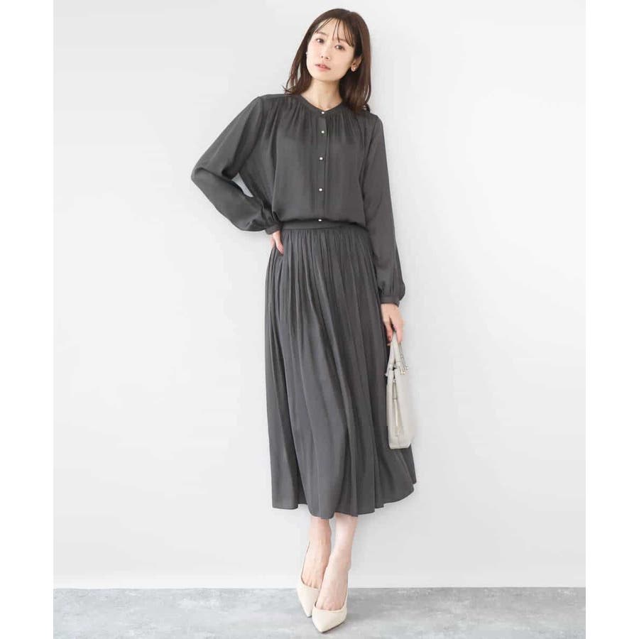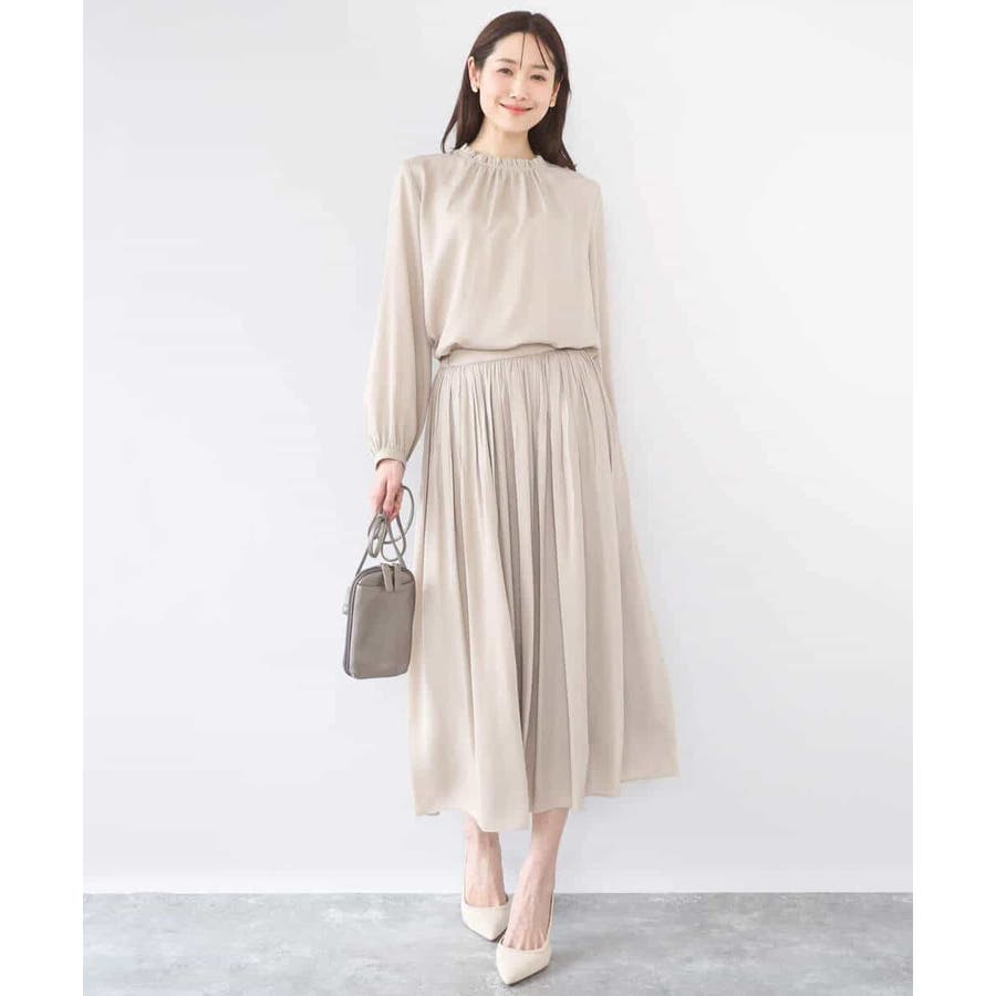 きれいな落ち感とさらりとした素材感にカジュアルすぎないきちんと見えのサテン素材を使用。ワッシャー消しプリーツ加工を入れ軽さのある素材は3シーズン長く着回し可能。UVカット機能付き素材です。