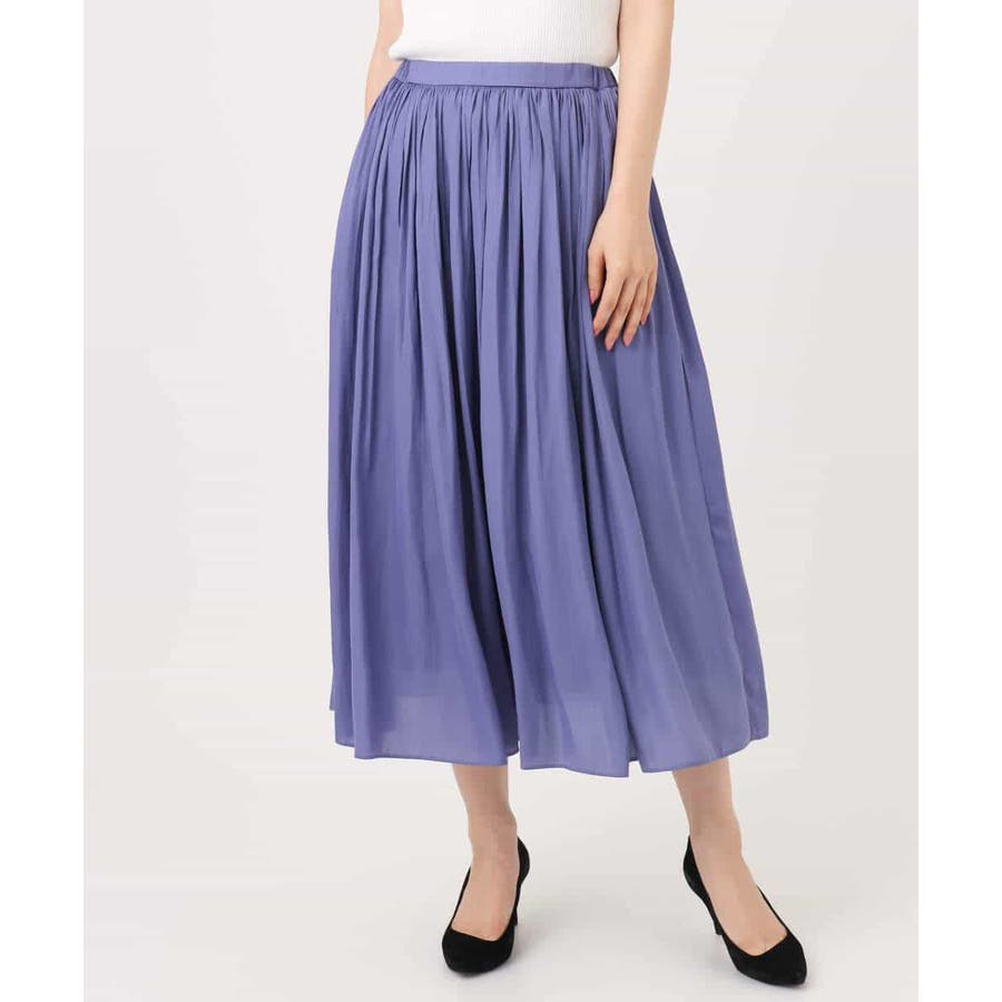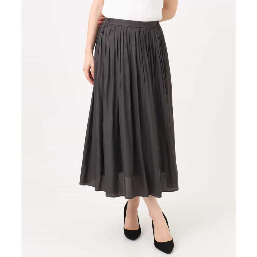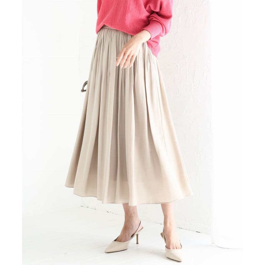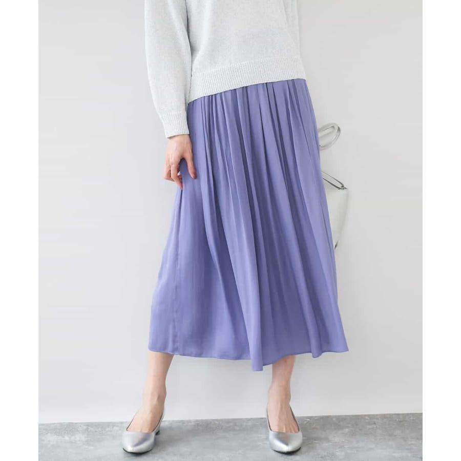 落ち感の良い素材を活かした消しプリーツ加工のスカート。、腰周りをすっきりとさせながらも、裾にかけてプリーツを消しているのできれいなAラインシルエットが実現。フロントはゴムを寄せていないベルトデザインなので、トップスをインしたときにもカジュアルすぎず程よいきちんと感があります。