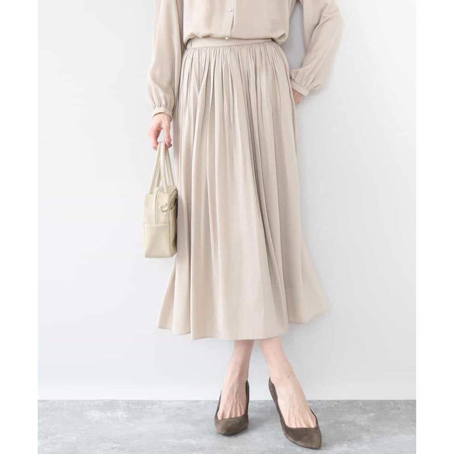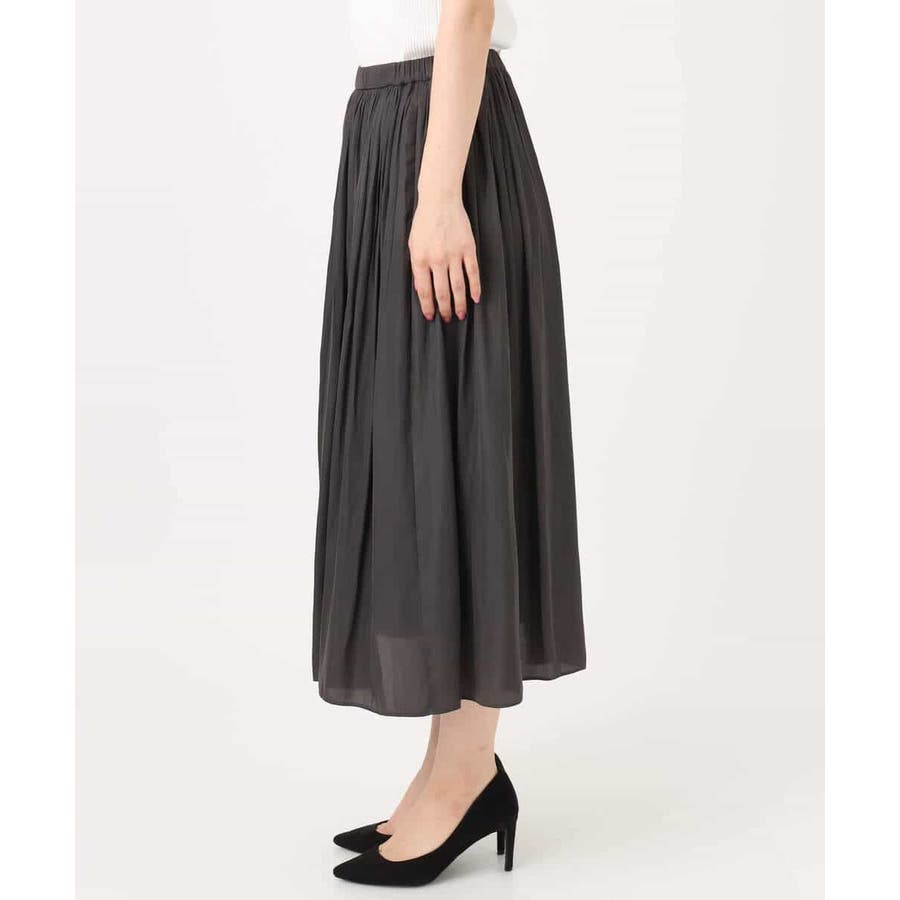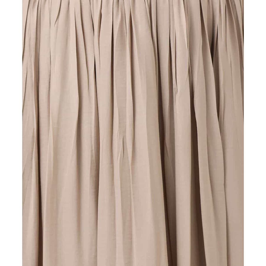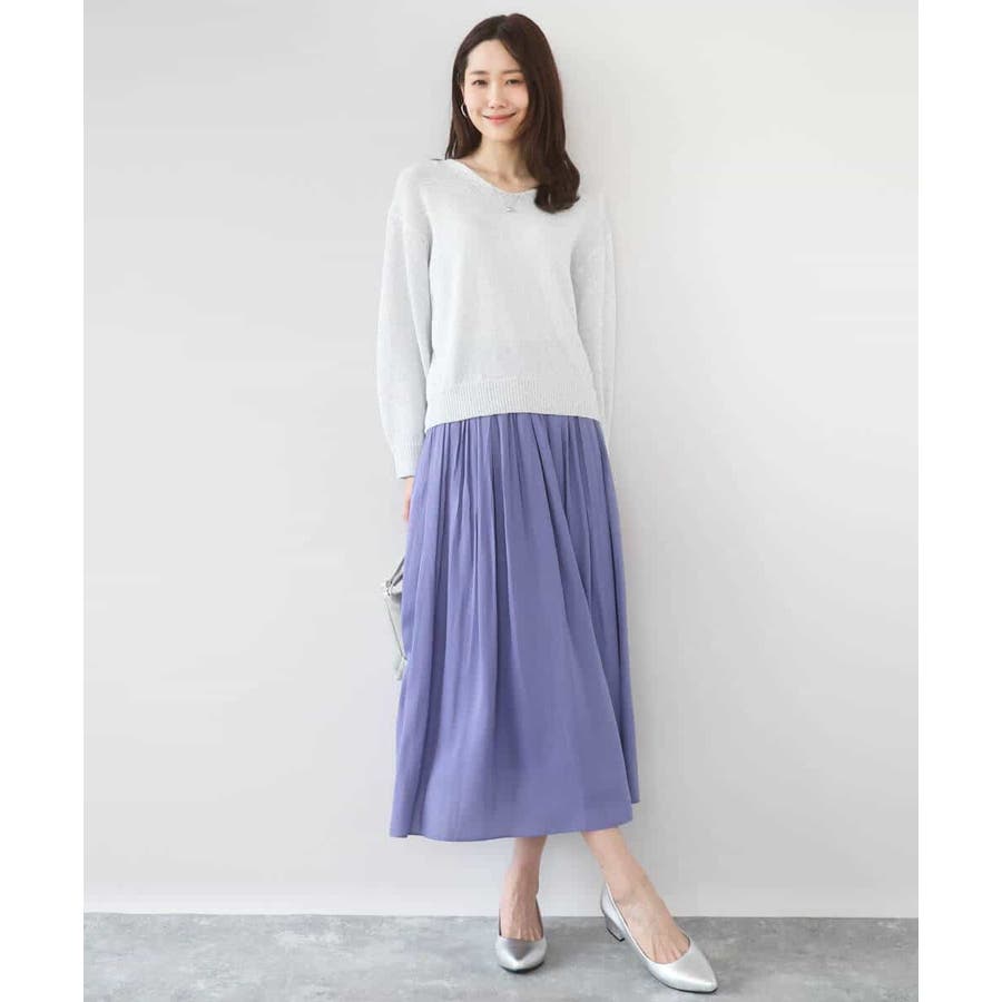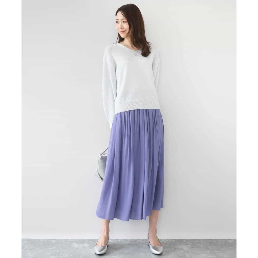 落ち感の良い素材を活かした消しプリーツ加工のスカート。、腰周りをすっきりとさせながらも、裾にかけてプリーツを消しているのできれいなAラインシルエットが実現。フロントはゴムを寄せていないベルトデザインなので、トップスをインしたときにもカジュアルすぎず程よいきちんと感があります。