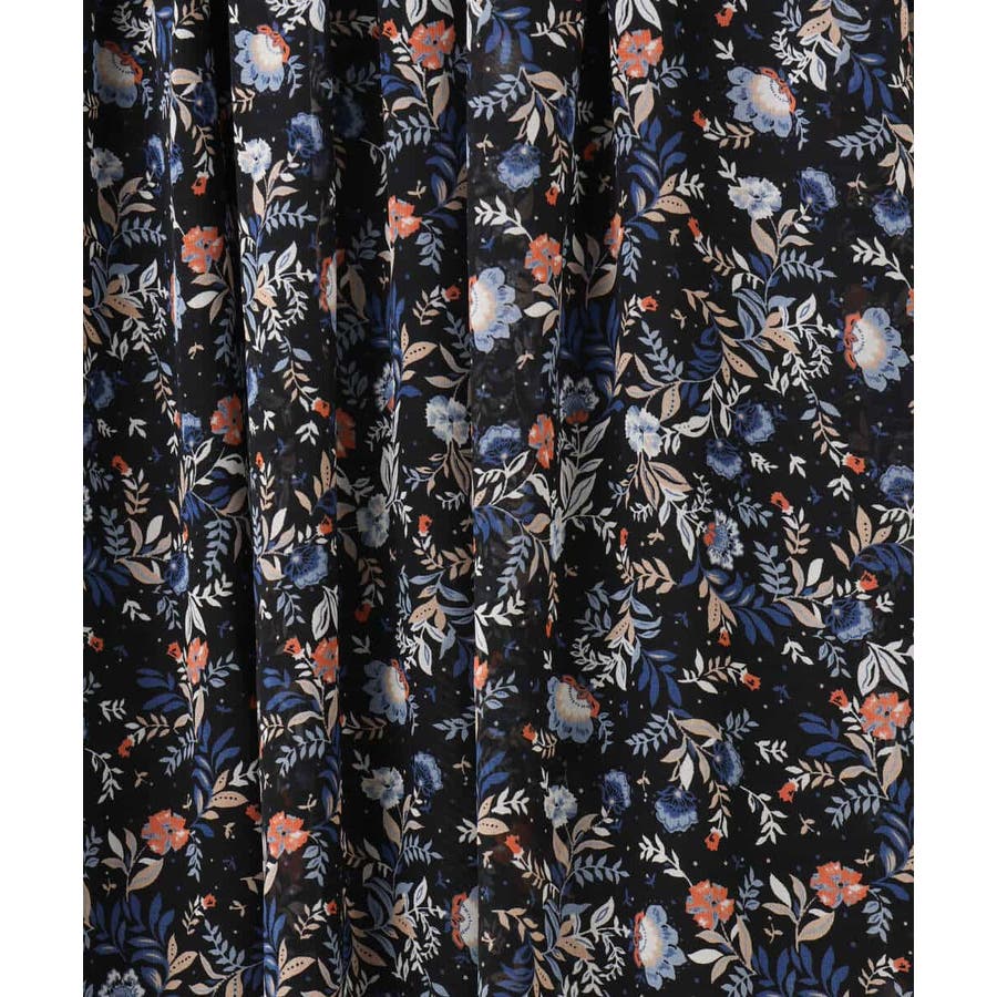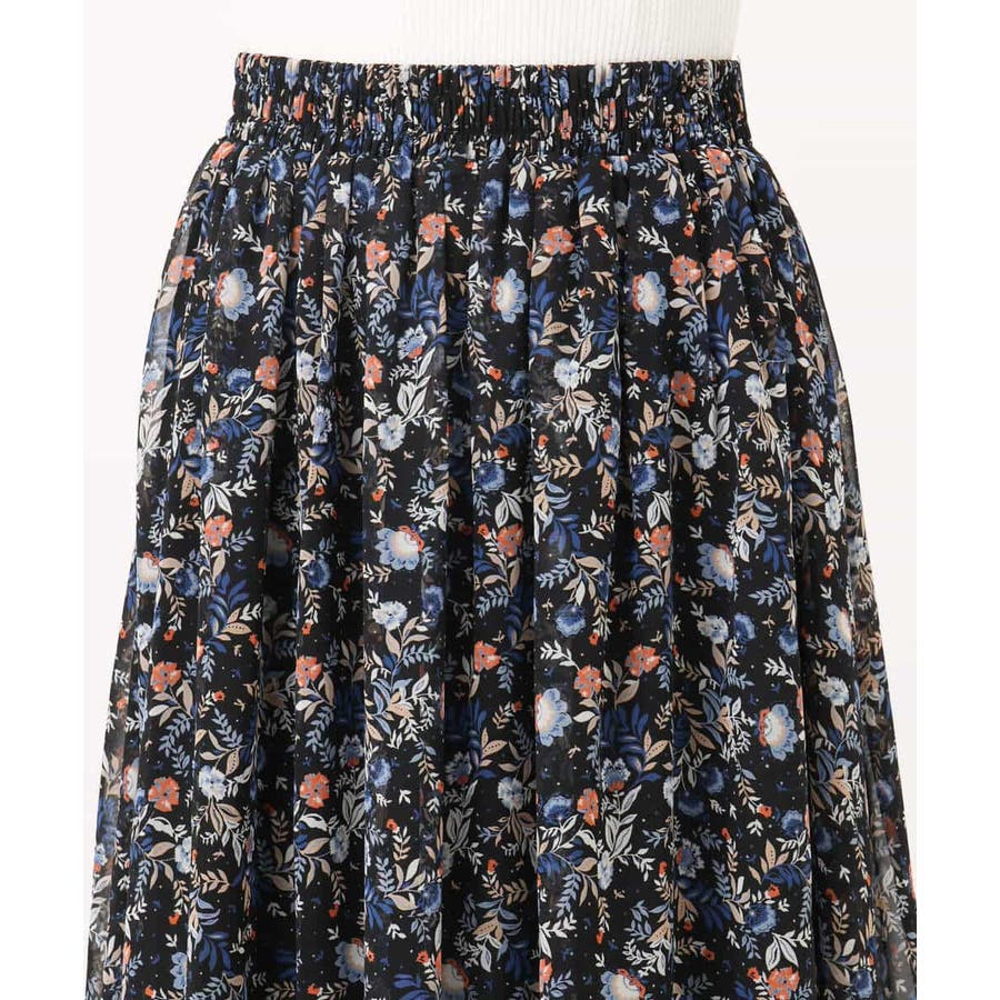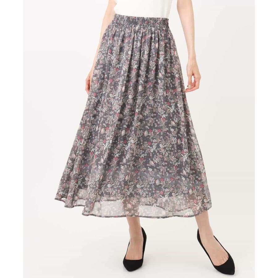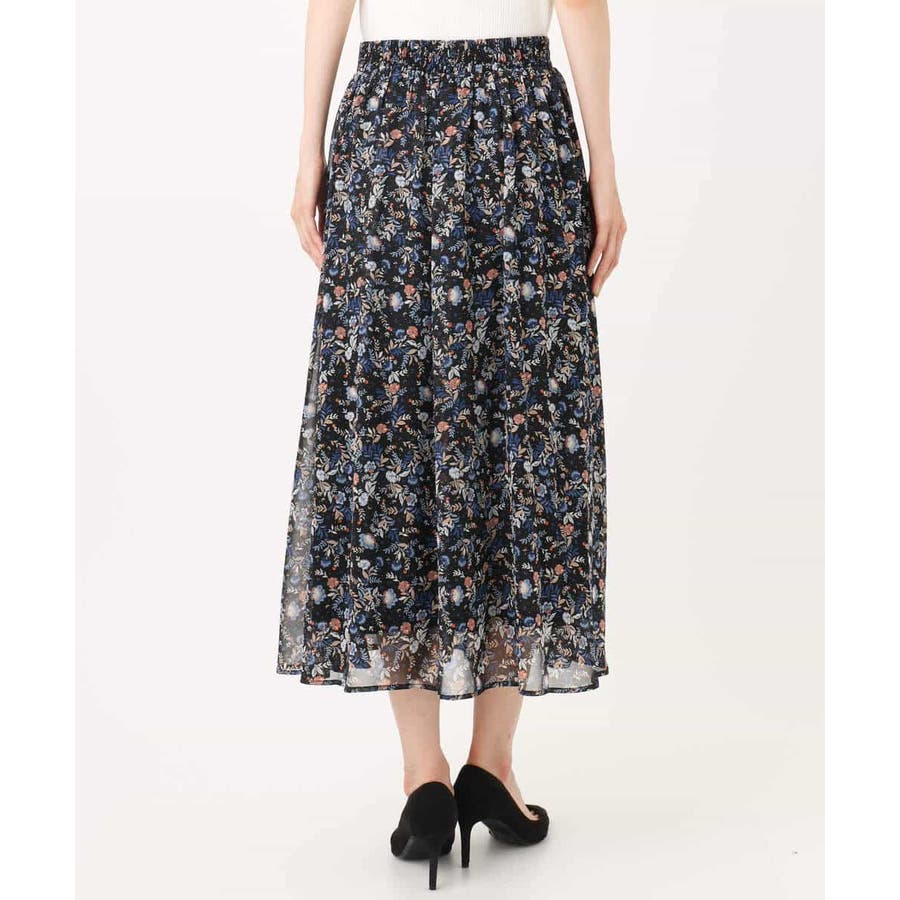 小さめのドットや繊細なリーフフラワーが散りばめられたプリントのシフォンスカート。多色使いですが、大人っぽい色合いでシックに着こなせます。落ち感がある素材は広がりすぎないので甘くなりすぎず、ウエストゴムでストレスフリーな着心地も嬉しい。