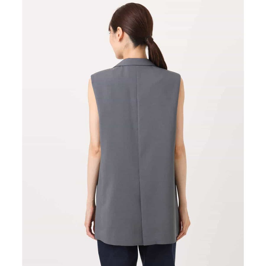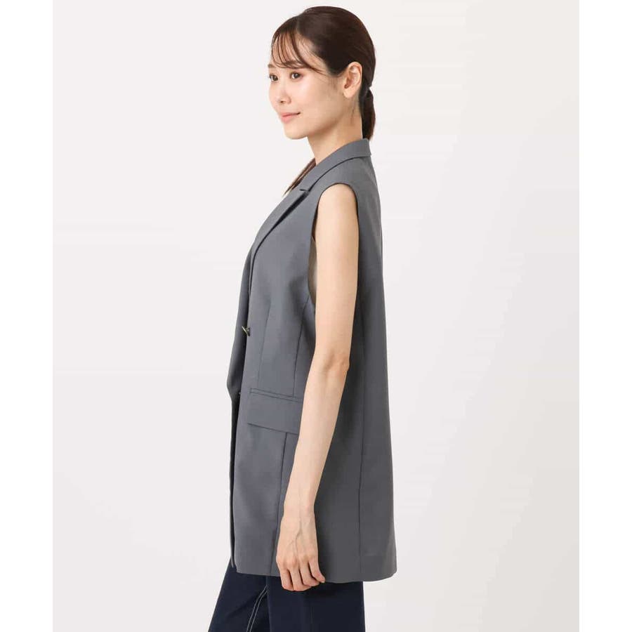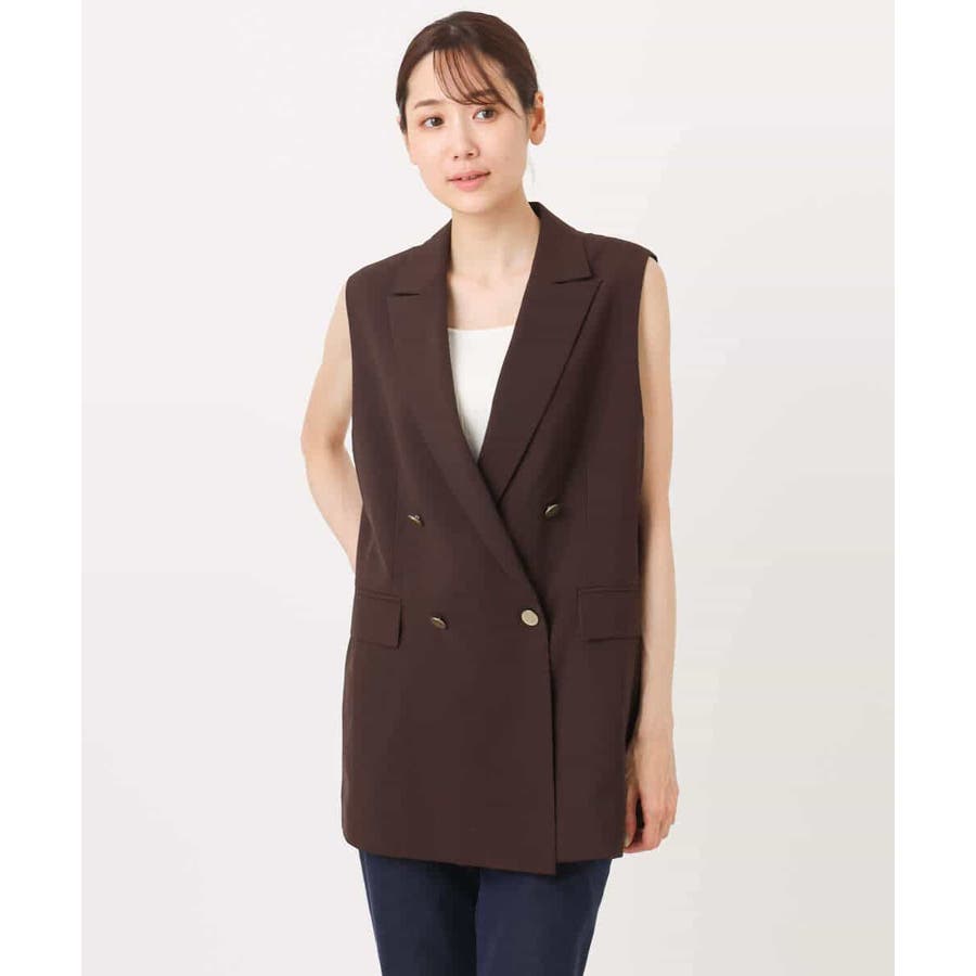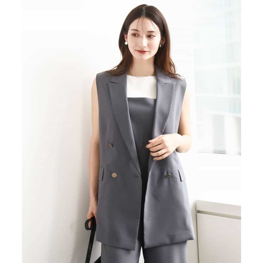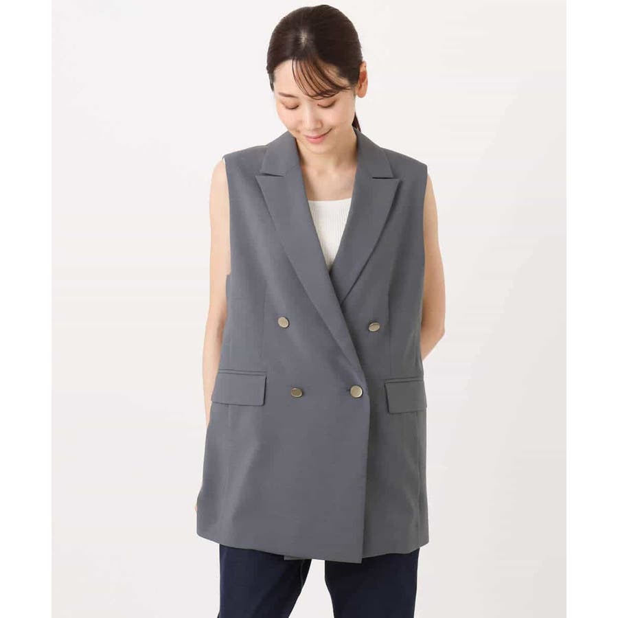 肩が大きく見えにくいような女性らしいパターンで仕上げたジレ。ゆったりとしながらもすっきりとしたシルエットに仕立てたトレンド感のあるダブルブレストデザインが特徴。長めの丈感で気になるヒップ周りもカバーしてくれます。