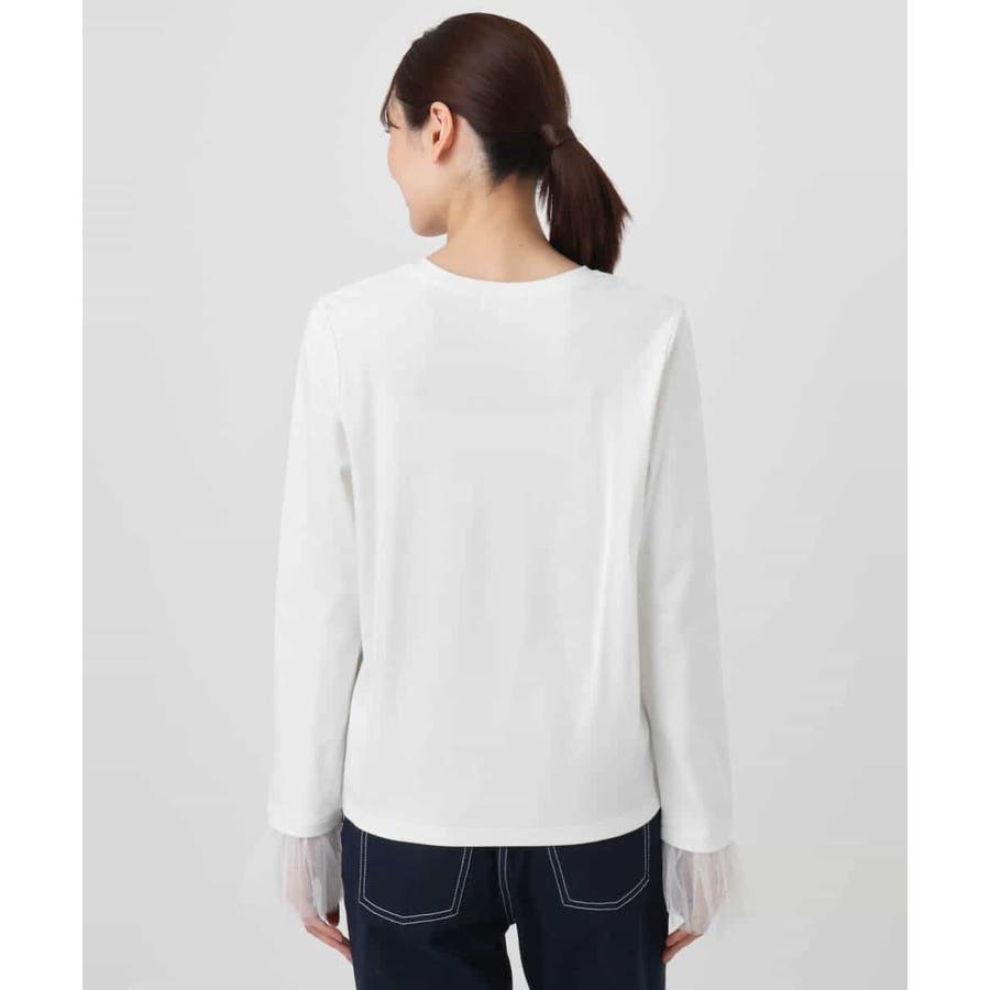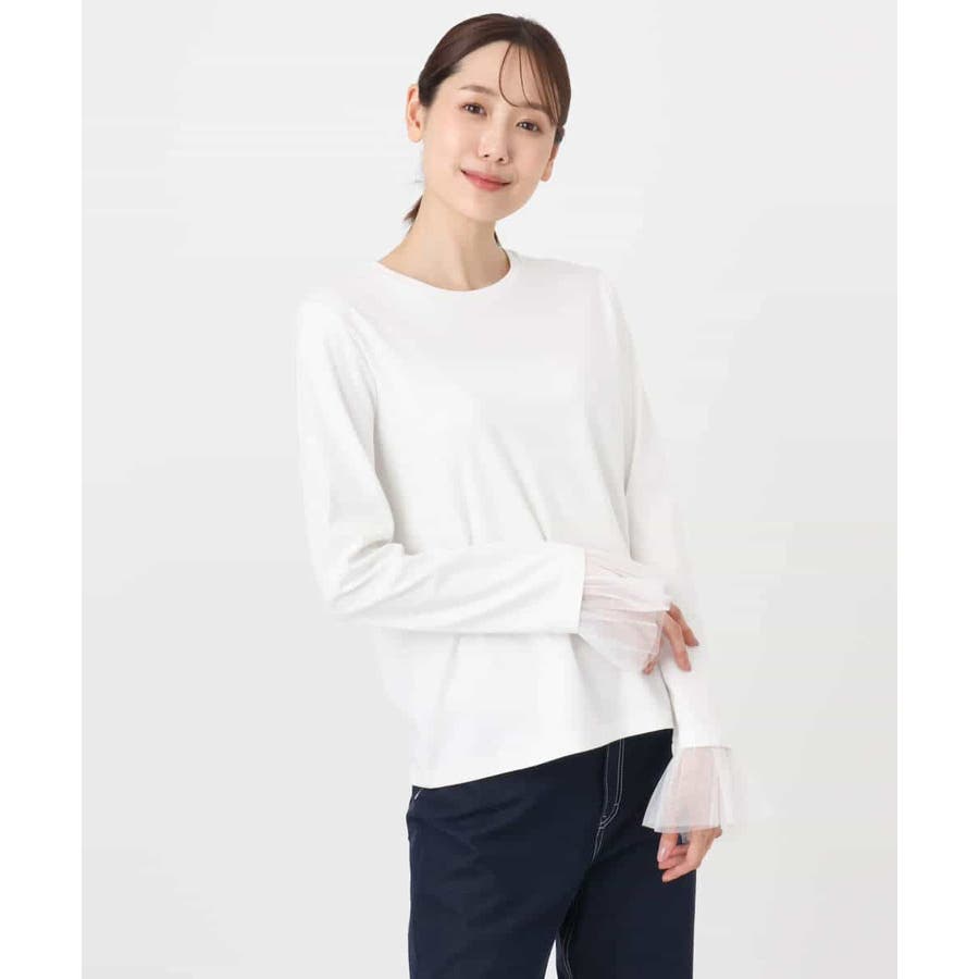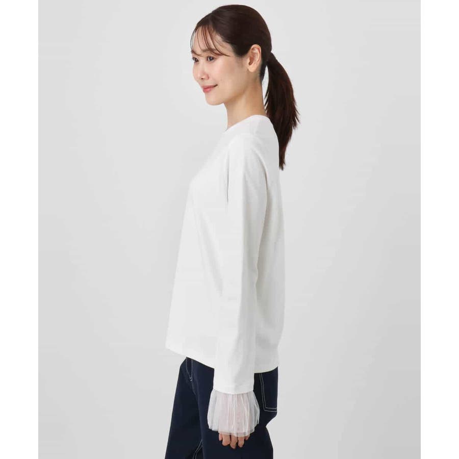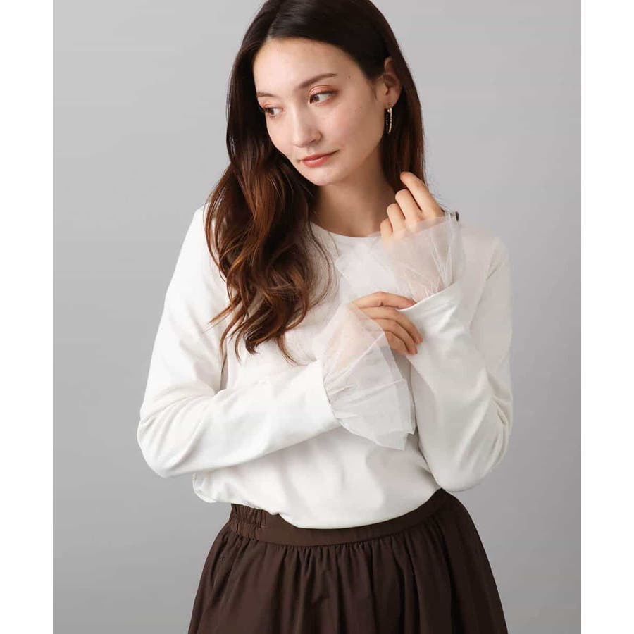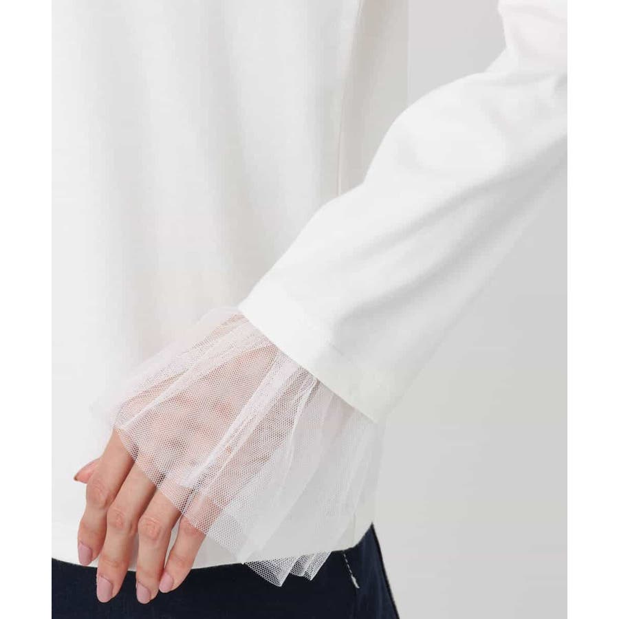 袖口を二枚仕立てのチュール素材で切替えたインナーカットソー。トップスと重ねて楽しむレイヤードアイテムです。