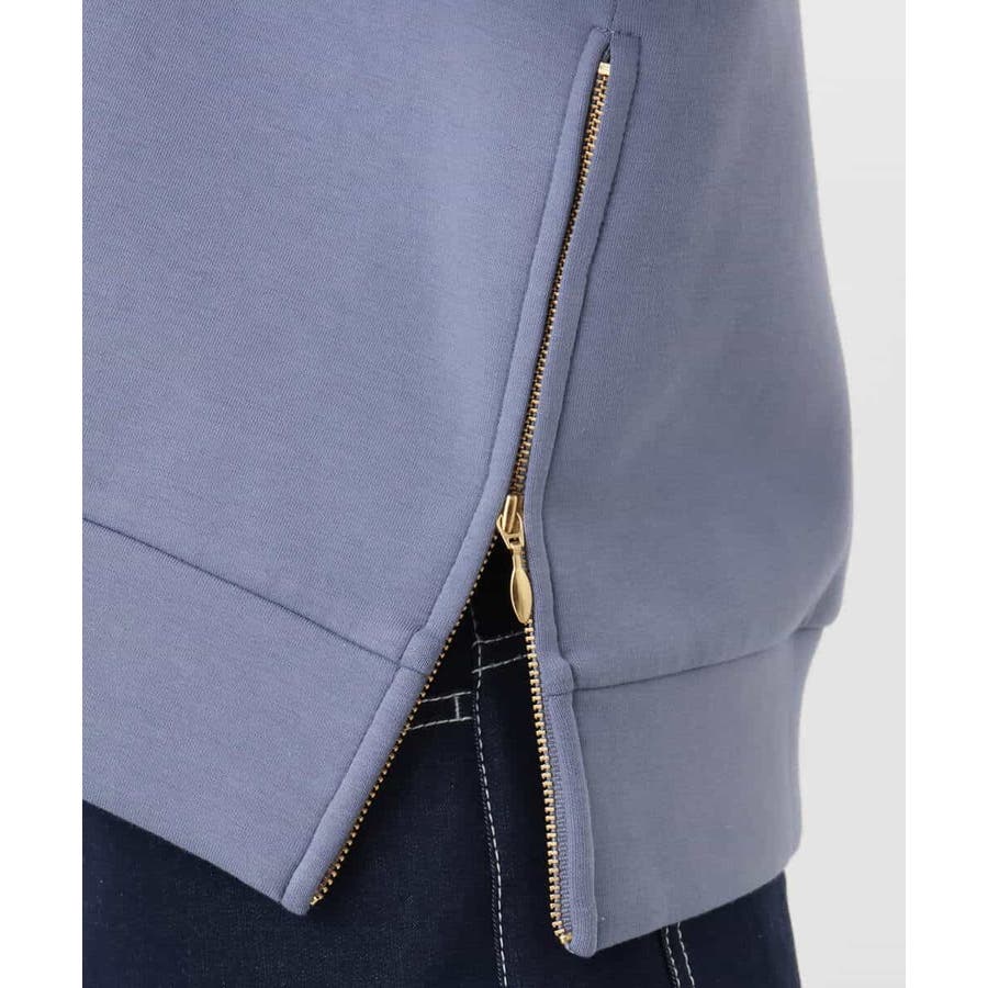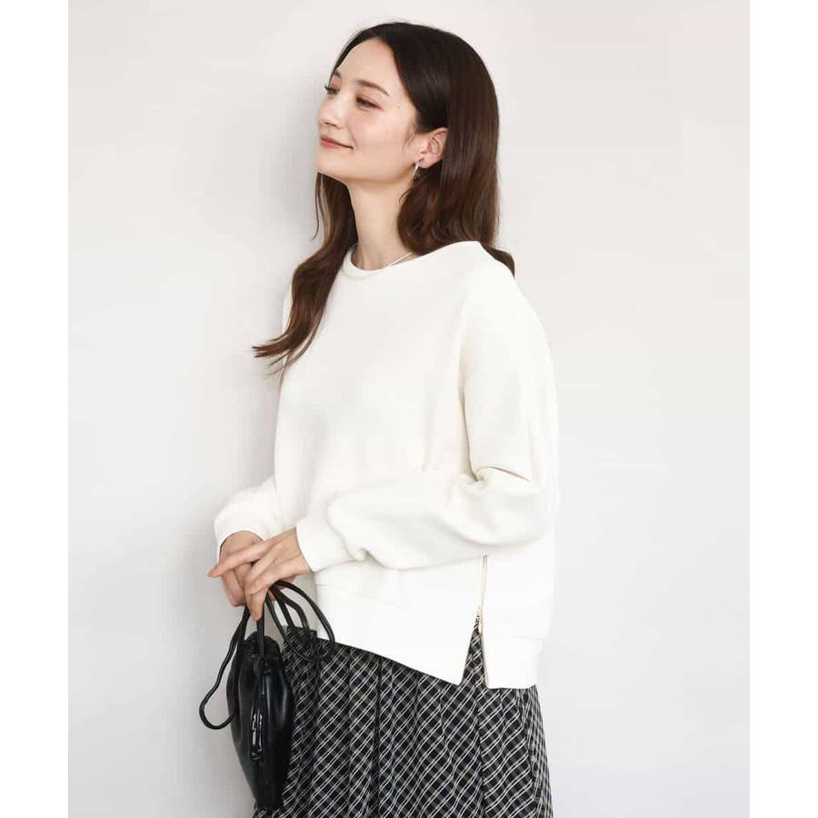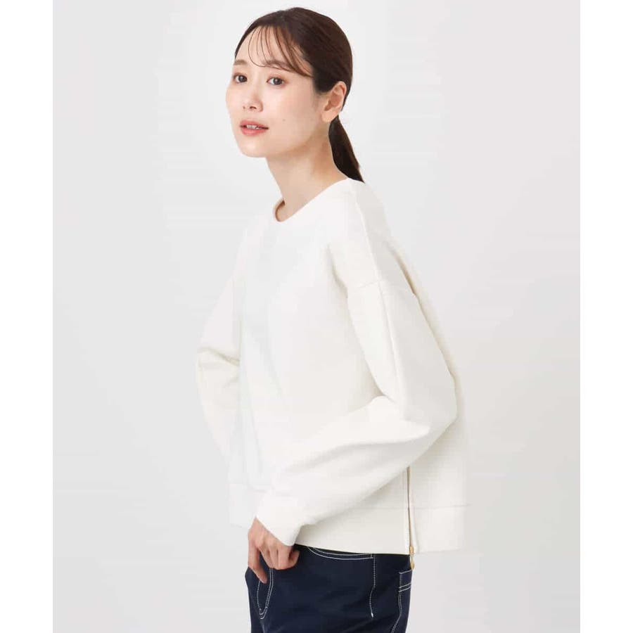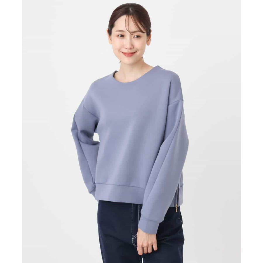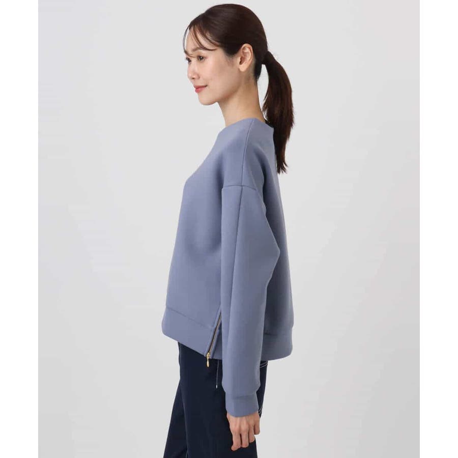 きれいめ素材と衿ぐりの見返し仕様でカジュアル過ぎない仕上がりのプルオーバー。袖にも切替えでカーブを付け、丸みのあるシルエットになっています。左脇の金属ファスナーもデザインポイント。
