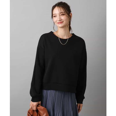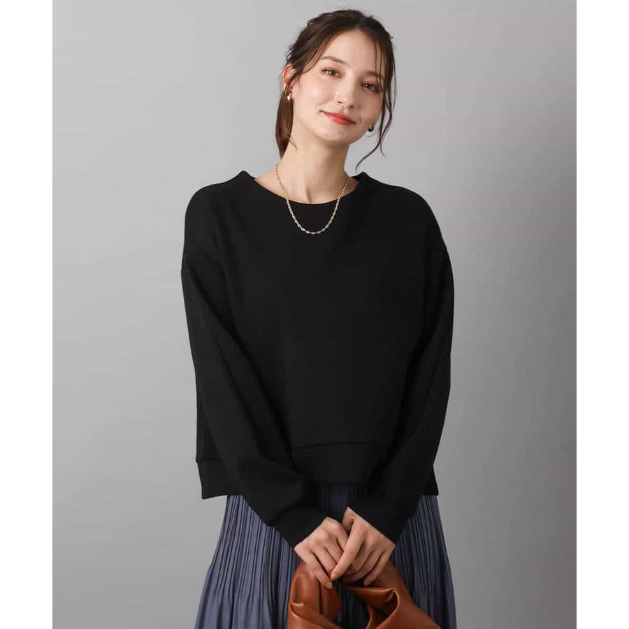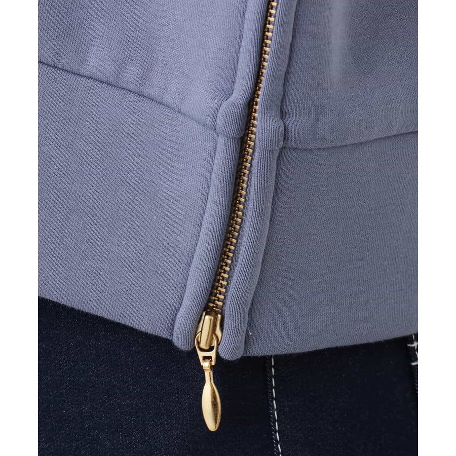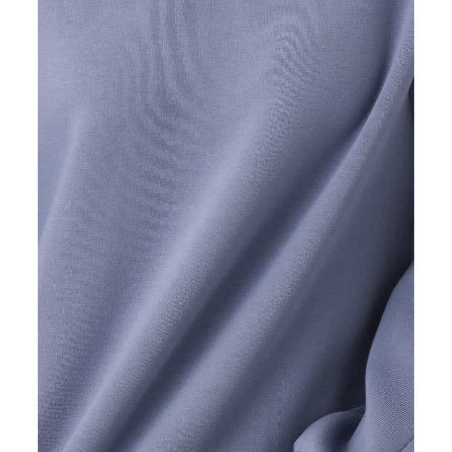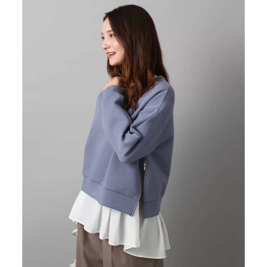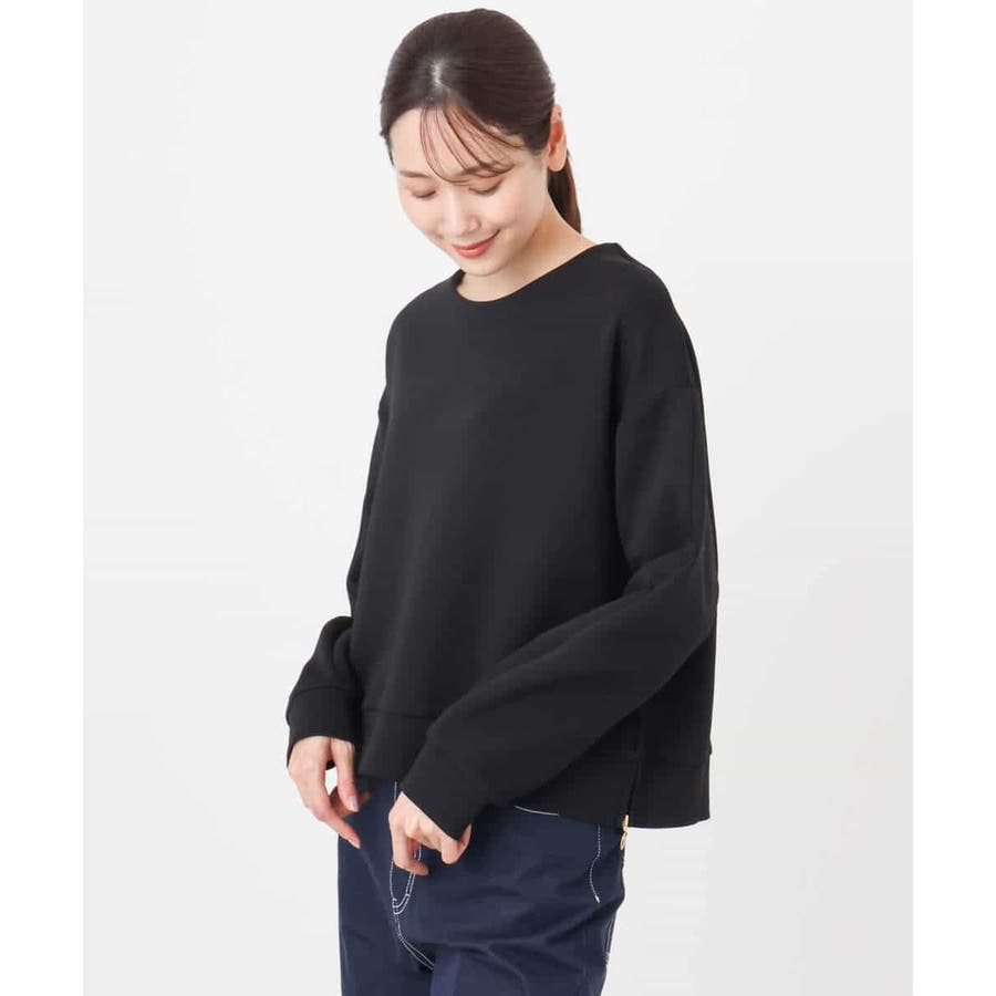 きれいめ素材と衿ぐりの見返し仕様でカジュアル過ぎない仕上がりのプルオーバー。袖にも切替えでカーブを付け、丸みのあるシルエットになっています。左脇の金属ファスナーもデザインポイント。