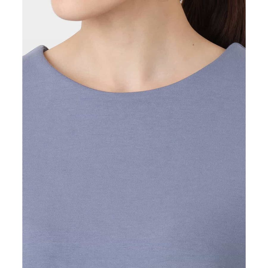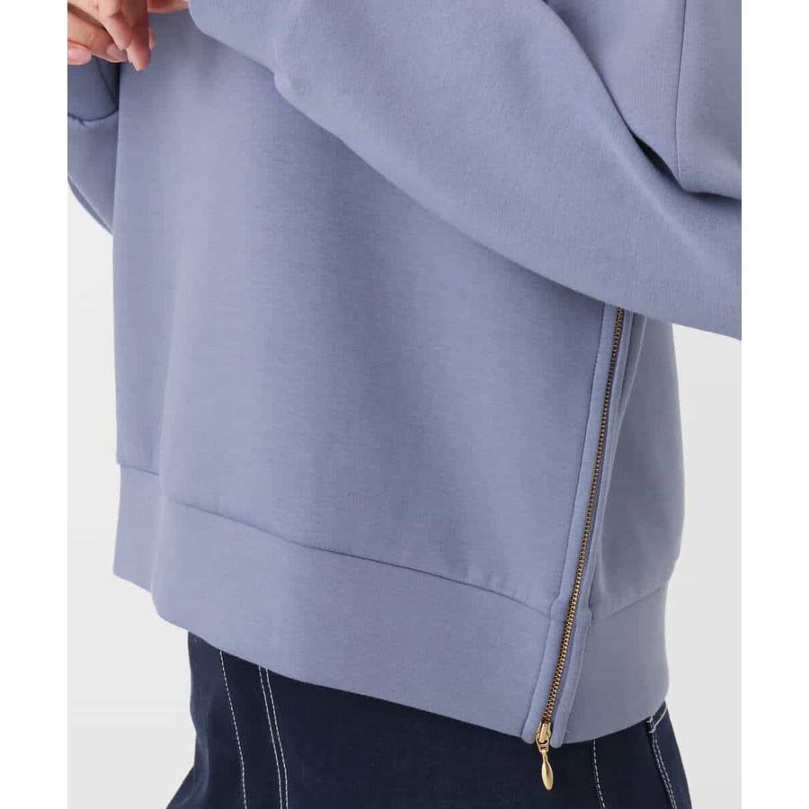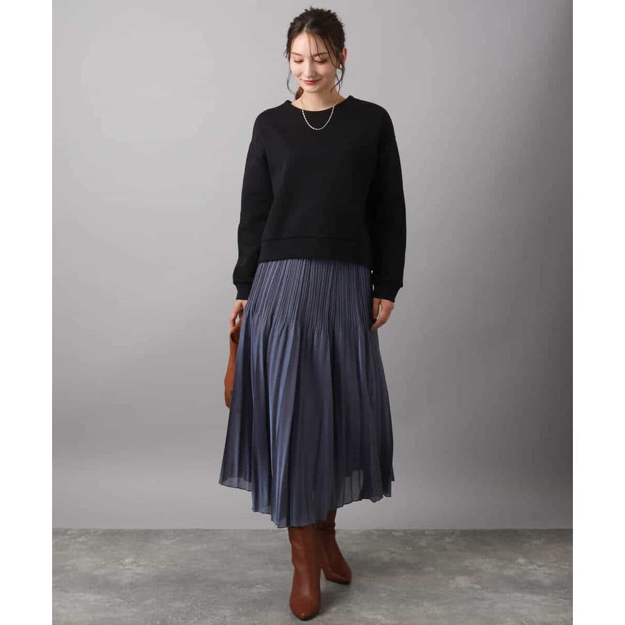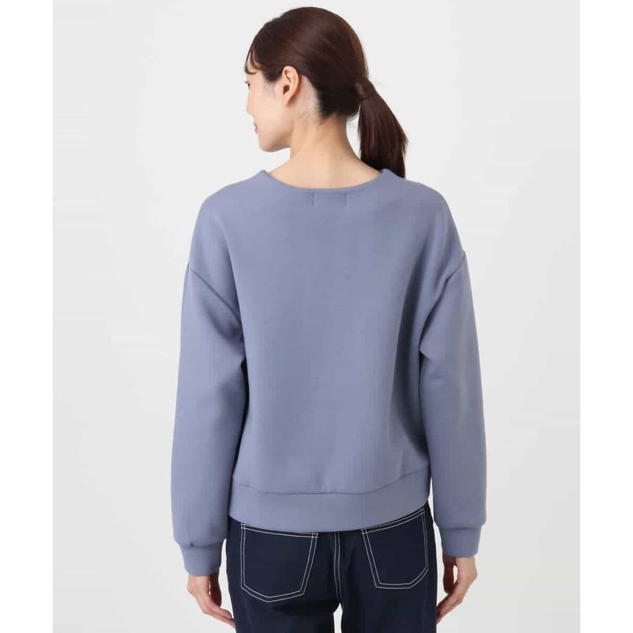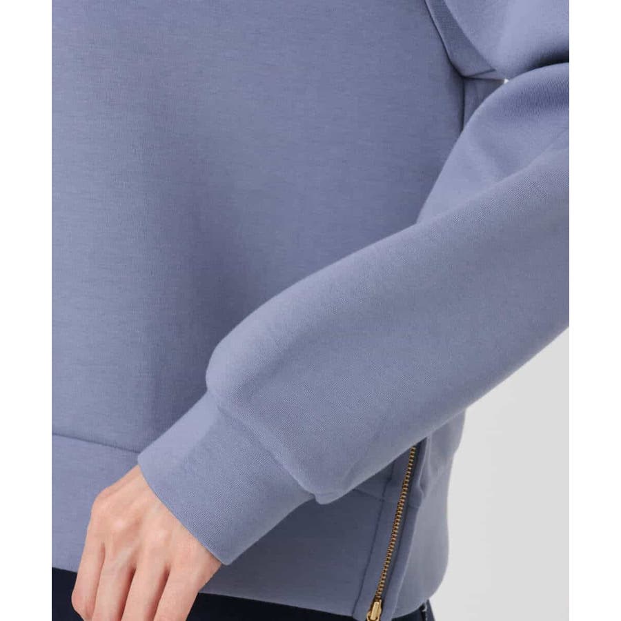 きれいめ素材と衿ぐりの見返し仕様でカジュアル過ぎない仕上がりのプルオーバー。袖にも切替えでカーブを付け、丸みのあるシルエットになっています。左脇の金属ファスナーもデザインポイント。