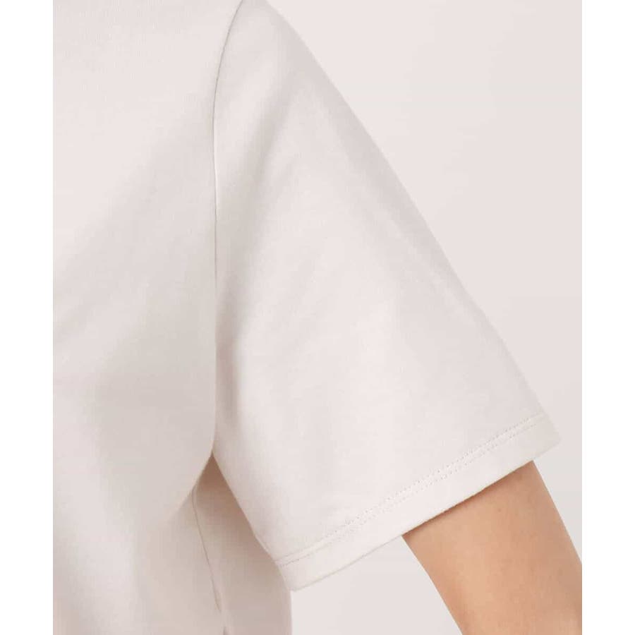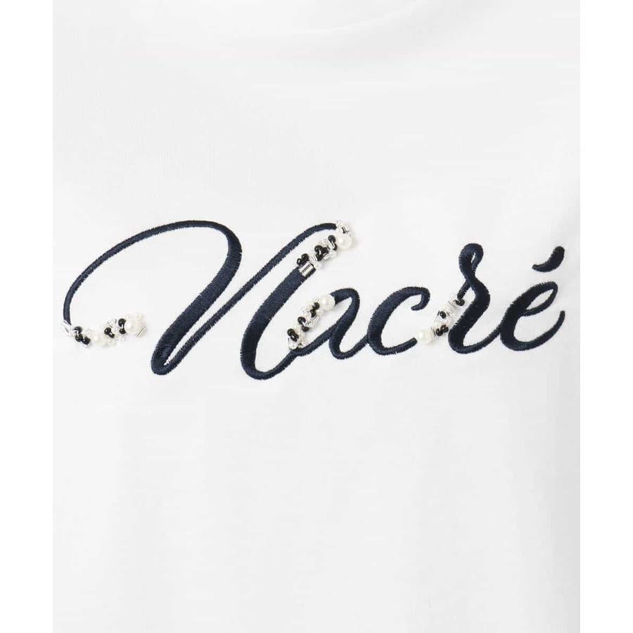 ボディラインを拾いにくく、透けにくい大人のロゴTシャツ。ロゴはビーズを手作業で縫い付けた価値観のある刺繍を施しました。