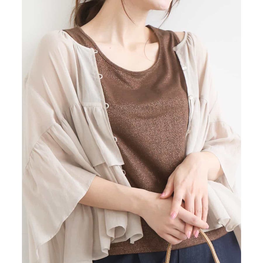 シャツやニット、カーディガンのインナーに一枚入れるだけでコーデのポイントに、トレンド感をプラスしてくれます。細かなラメが上品な印象でおしゃれさがありながら洋服の邪魔にならず、お仕事からお休みの日まで使い勝手の良さも魅力。
