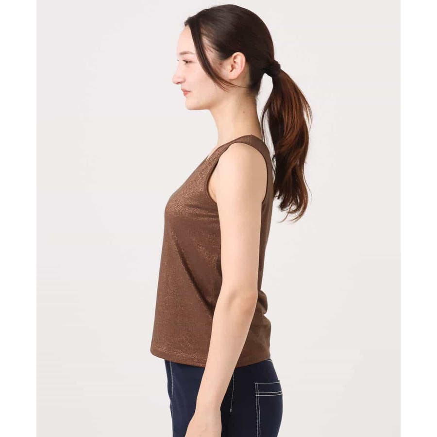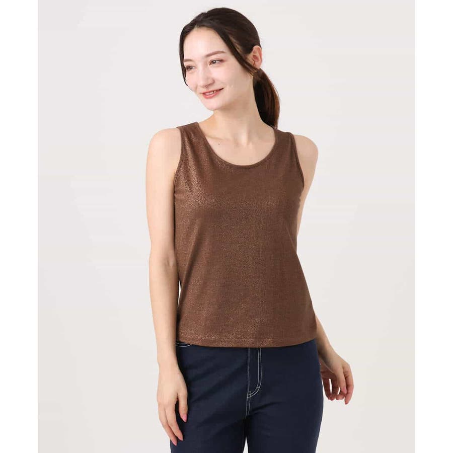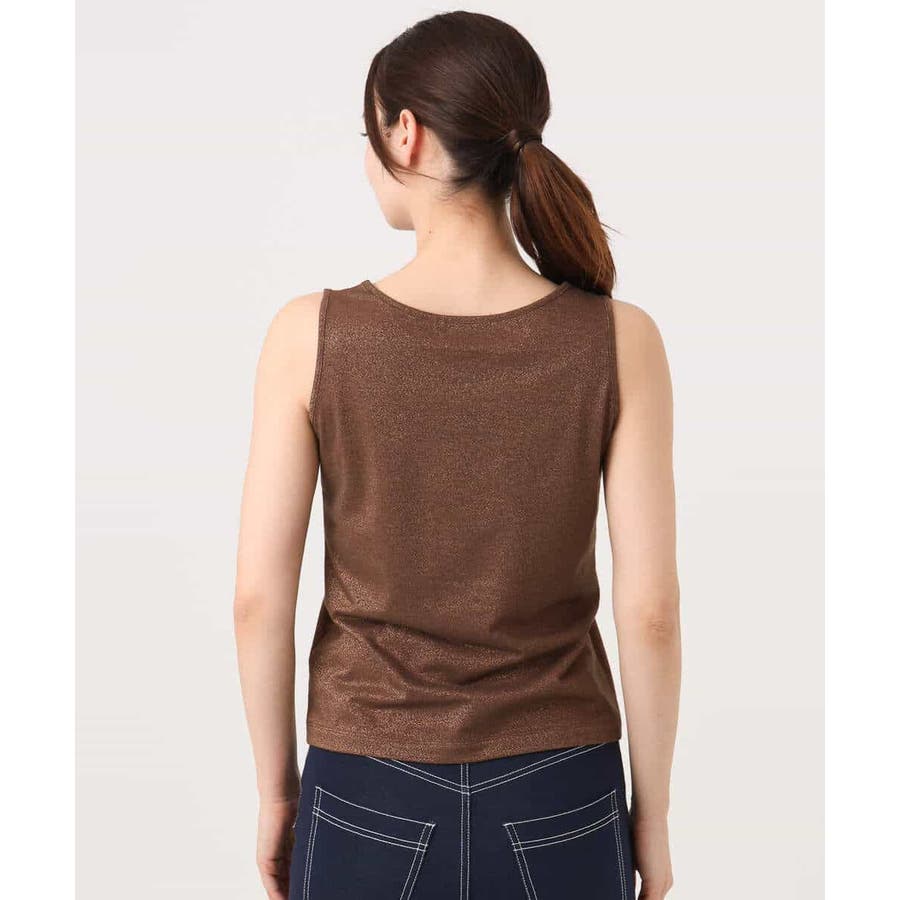 開きすぎないクルーネック、下着の紐が覗きにくい肩幅、ボトムにインしてもゴワつきにくい短丈が使い勝手の良いタンクトップ。ラメ感がトレンドライクな一枚です。