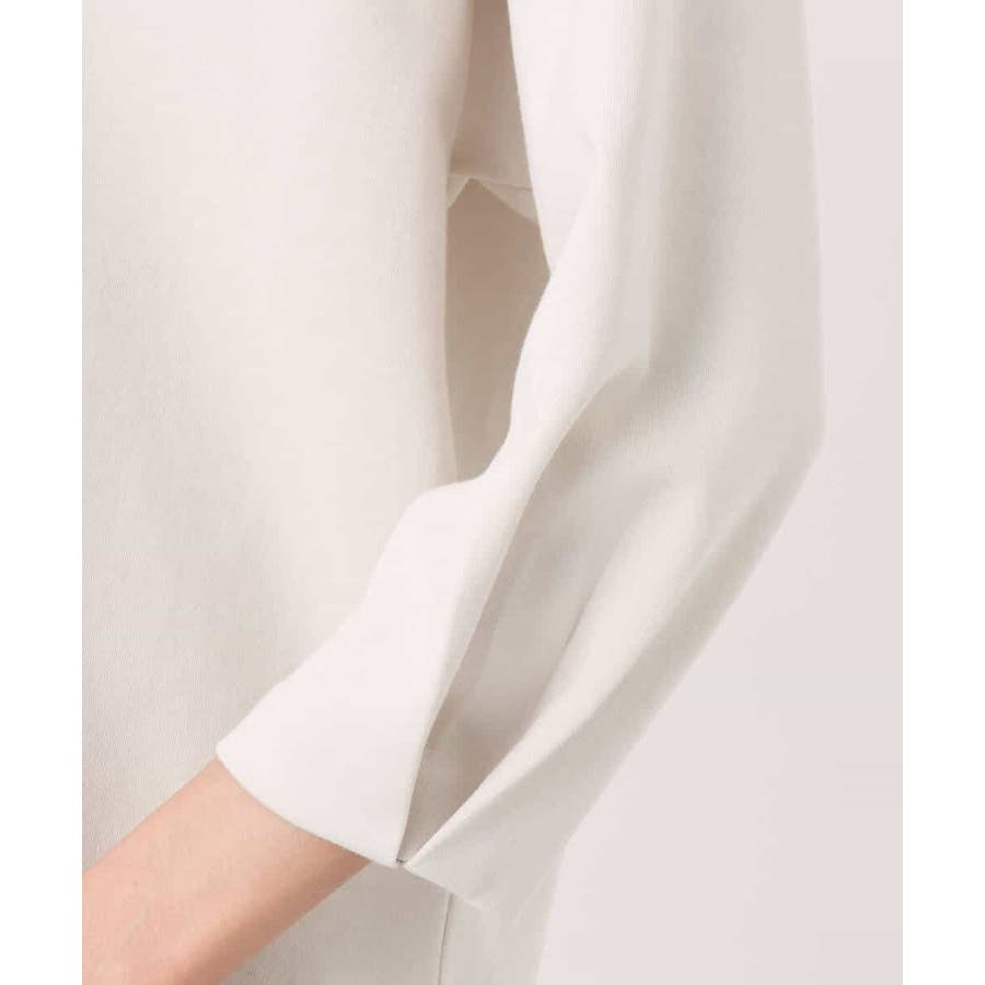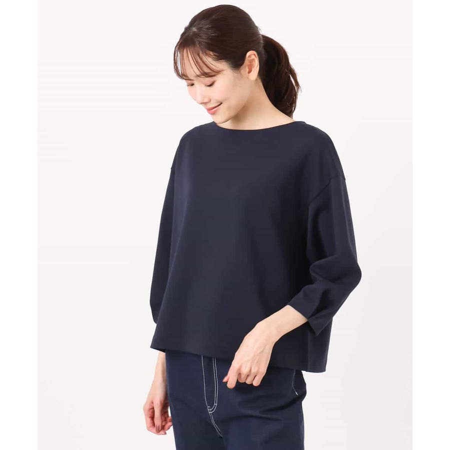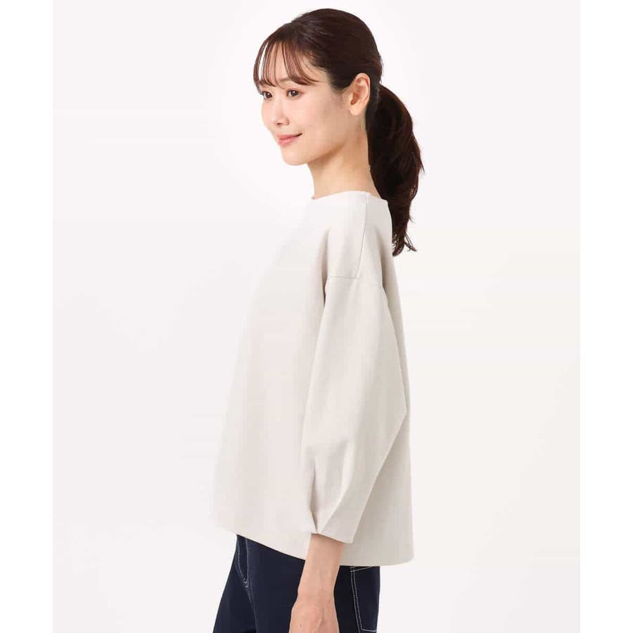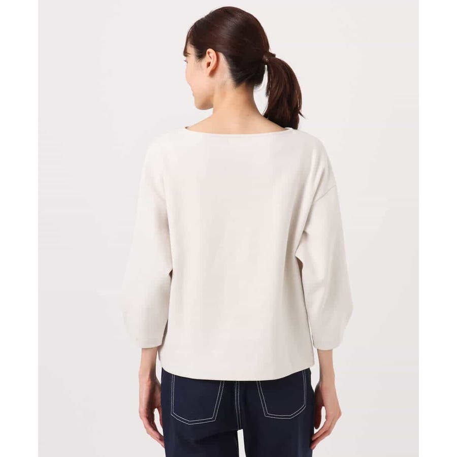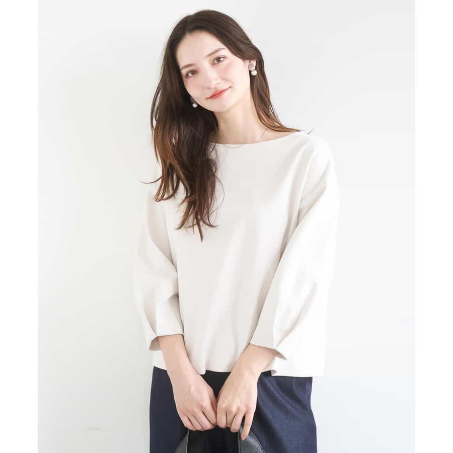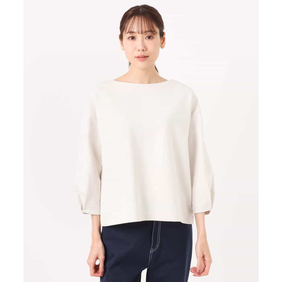 横広のボートネックとコクーンな袖がモードな雰囲気のカットソー。ボクシーのハリのあるフォルムが大人カジュアルな雰囲気に。