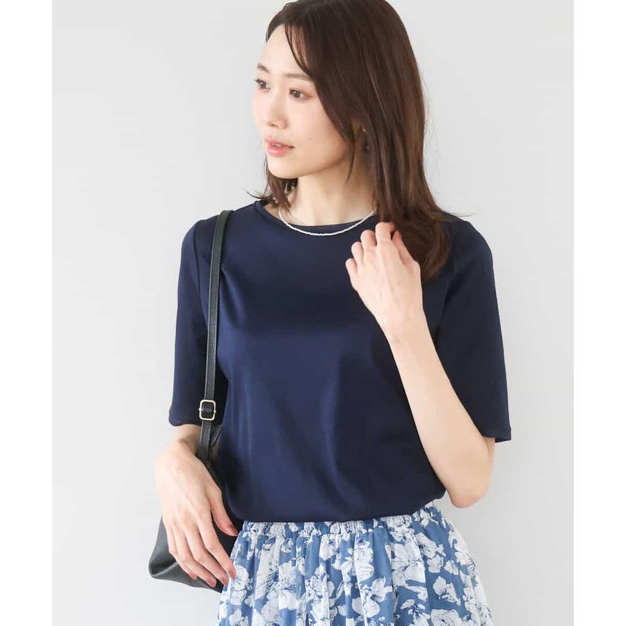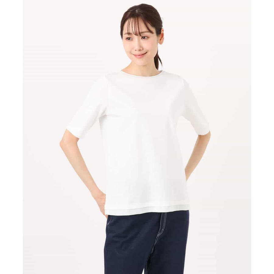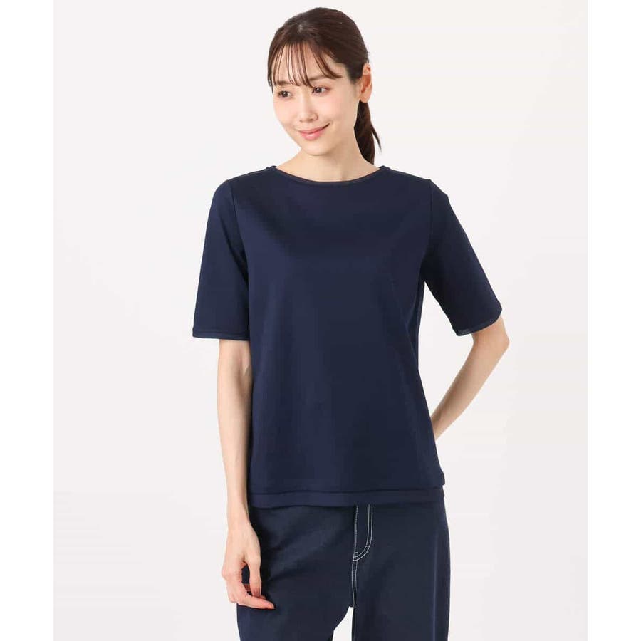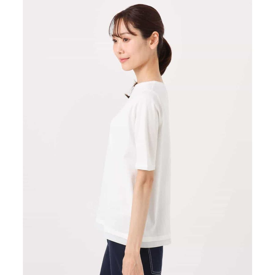 二の腕をしっかりカバーする、やや長めの半袖Tシャツ。衿端、袖口にシアー素材をあしらった、さりげないオシャレポイントのあるデザインです。