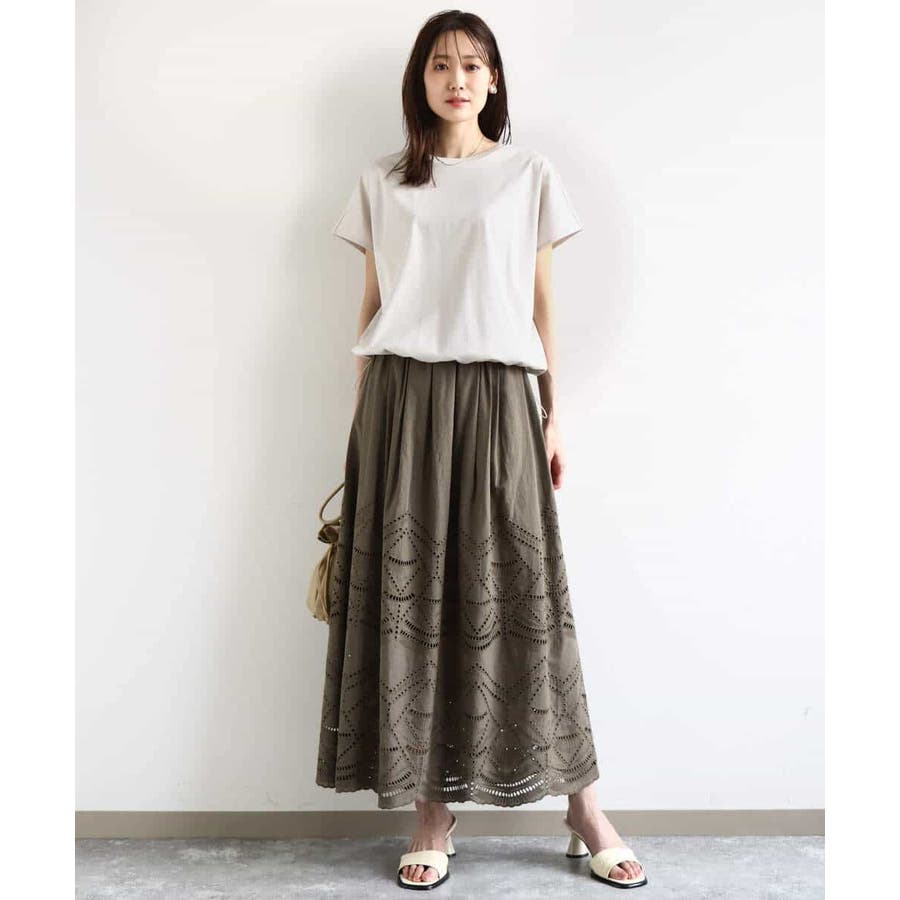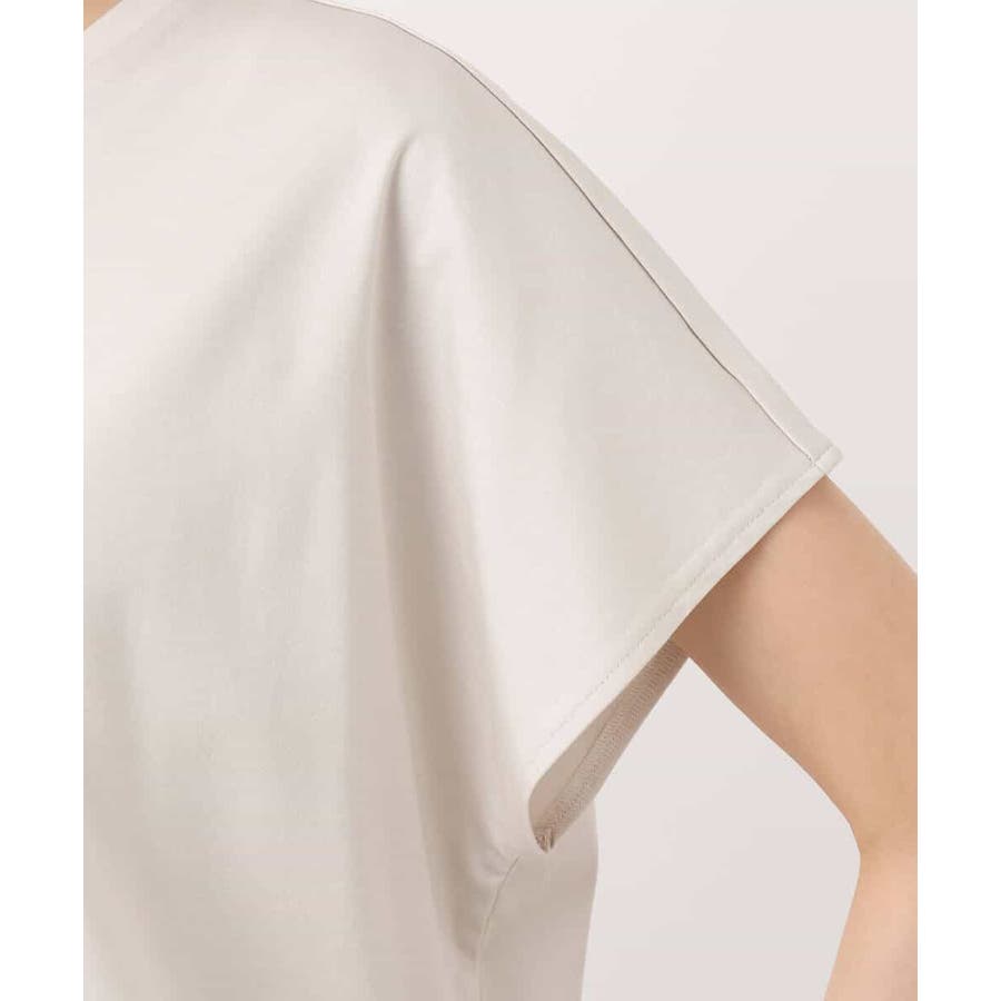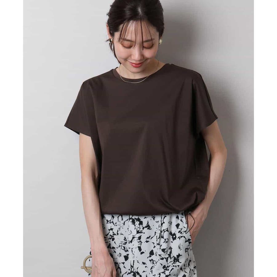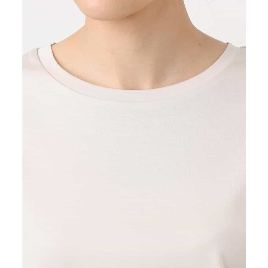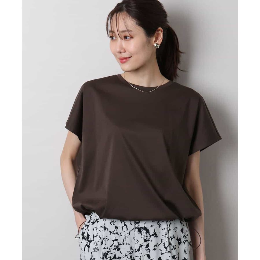 接触冷感素材でさらりと涼しげ、コットン100のデザインカットソーです。ややツヤ感のあるカジュアルすぎない質感できれいめボトムにも馴染むので、お仕事にも便利な一枚。サイズ感はゆったり、身体のラインを拾わず着られました。ドロストを絞らず着ると、157センチで腰が隠れるくらいの着丈になりました。一枚でも羽織のインナーとしても便利なこの季節におすすめのアイテムです。