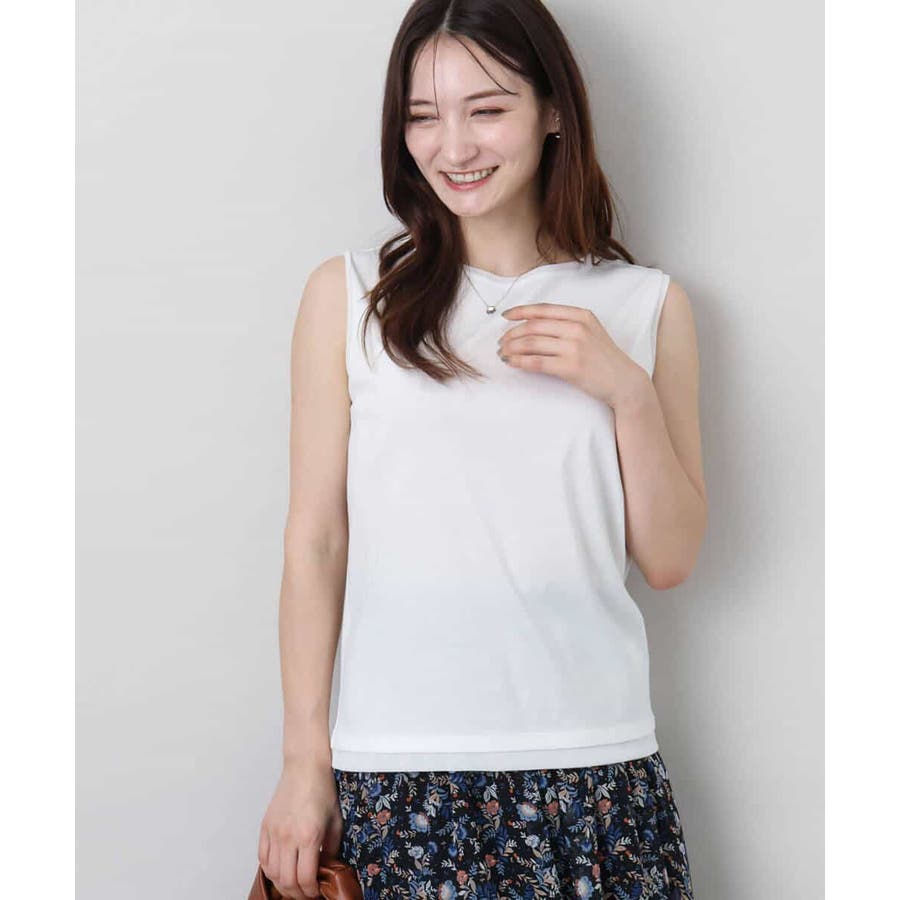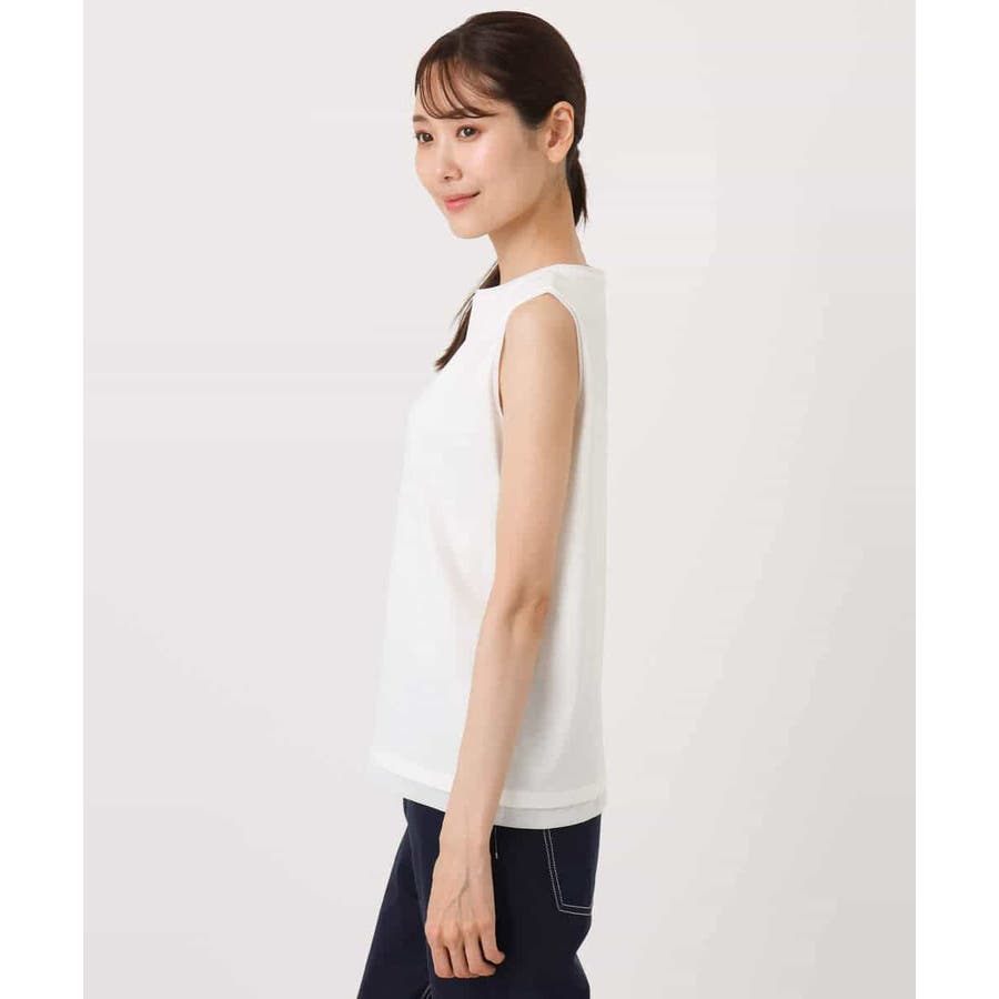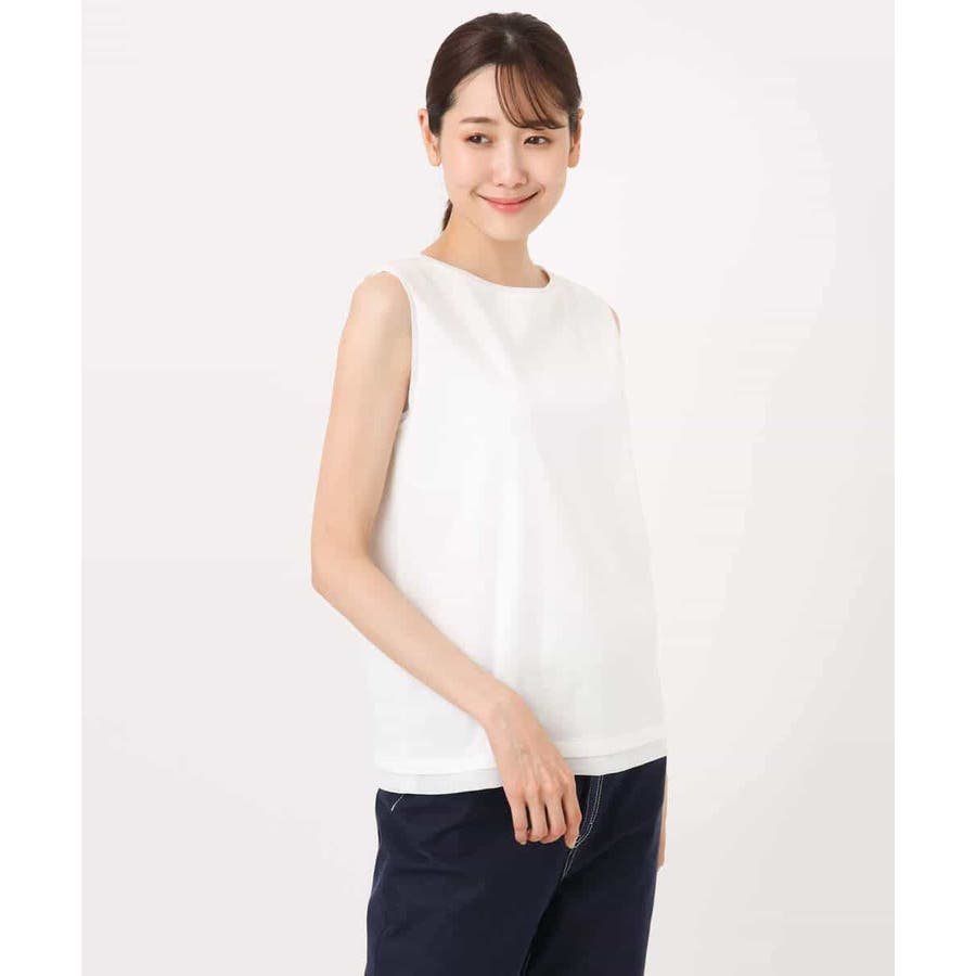 透けにくい素材が嬉しい大人のノースリーブカットソー。デコルテ部分や肩の肌見せを抑え、大人も一枚で着こなしやすいデザインに仕上げました。衿ぐり、アームホール、裾部分にのみシアーな素材をトリミングし優しい透け感のアクセントに。