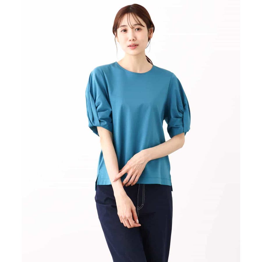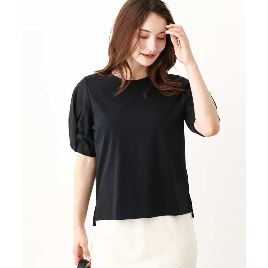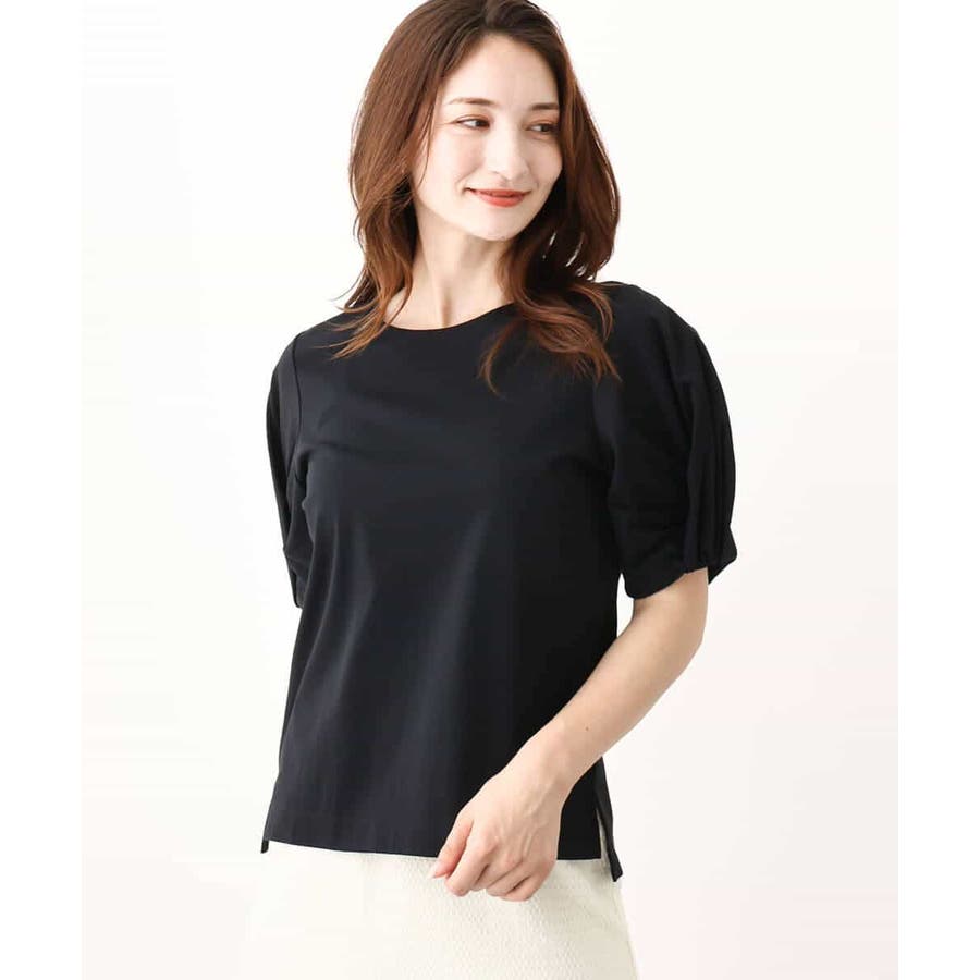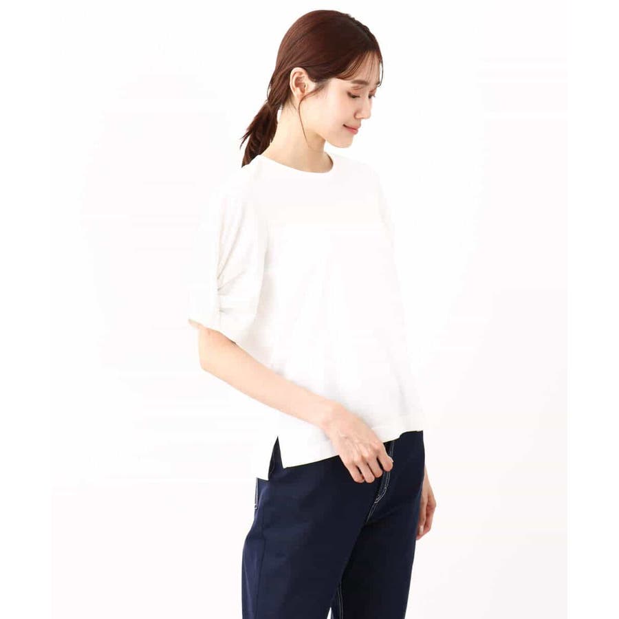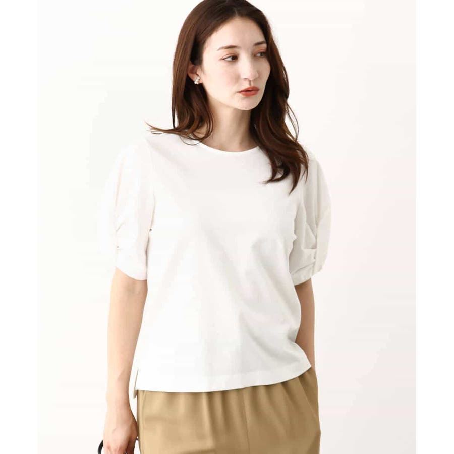 袖口をツイストした袖コンシャスなデザインがポイントのカットソー。一枚で映えるデザインが暑い時期に嬉しいアイテムです。