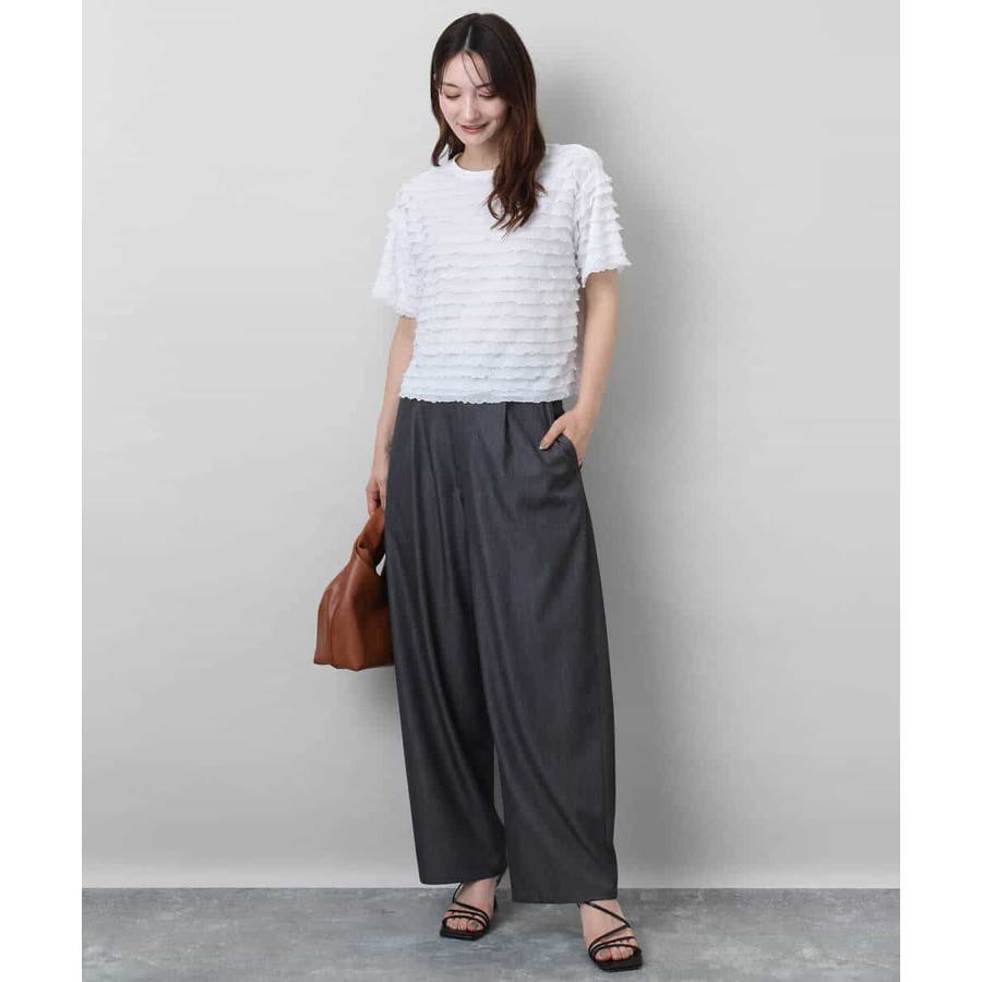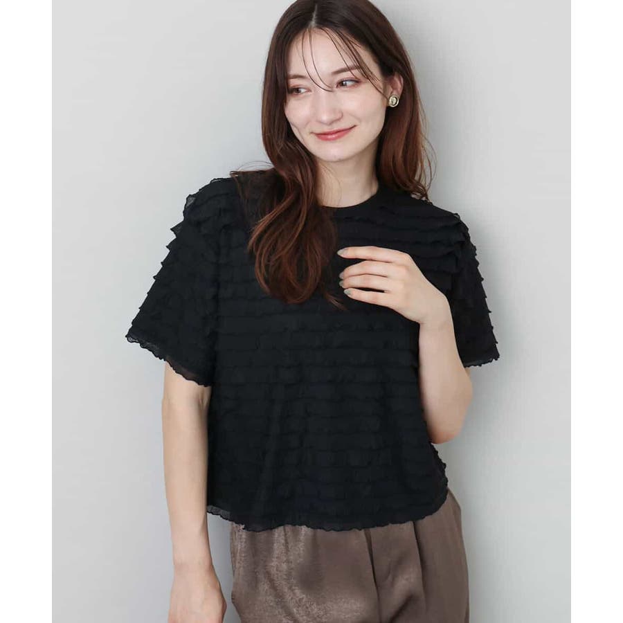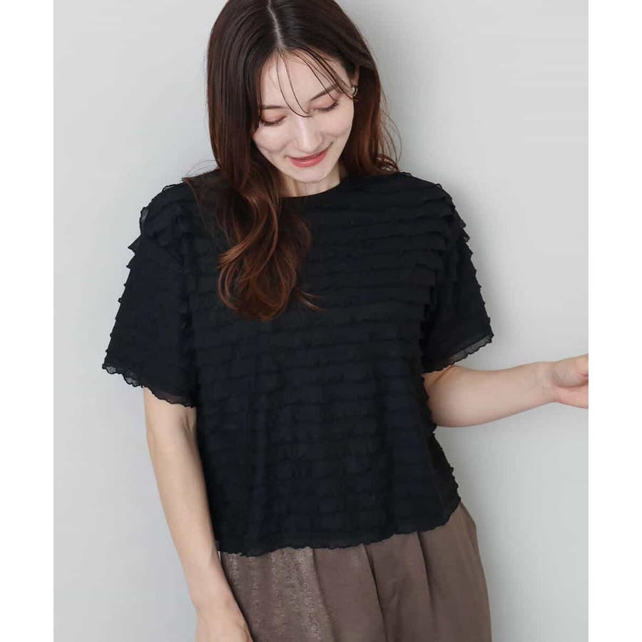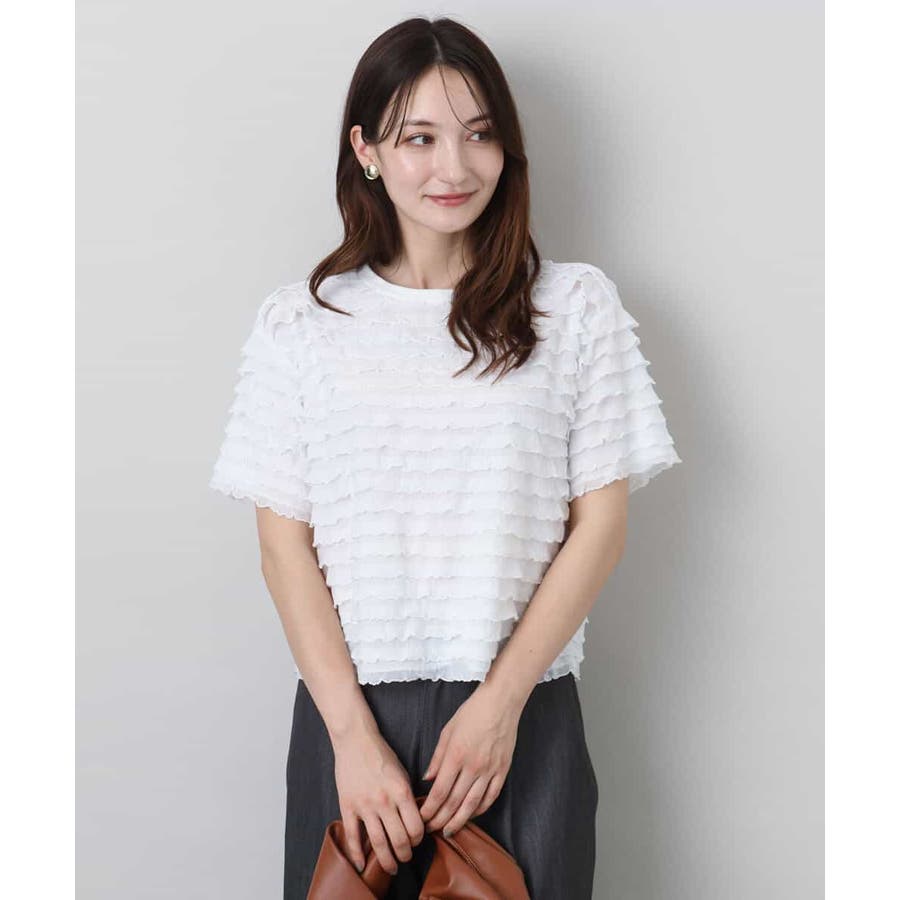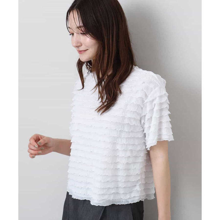 素材感が目をひくフリルティアードのカットソー。コンパクトな丈感とサイジングが着こなしやすい。