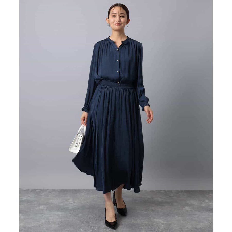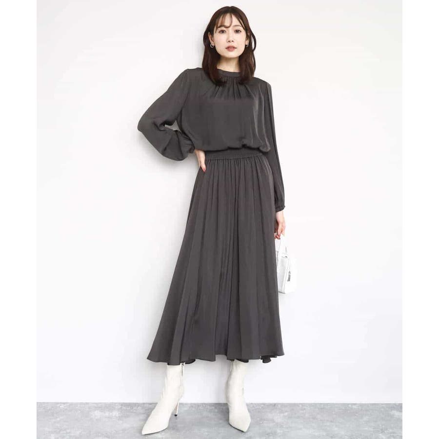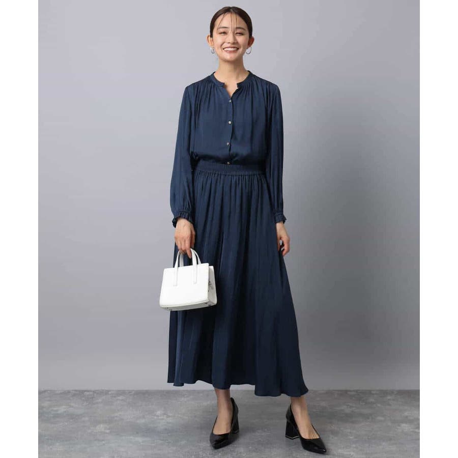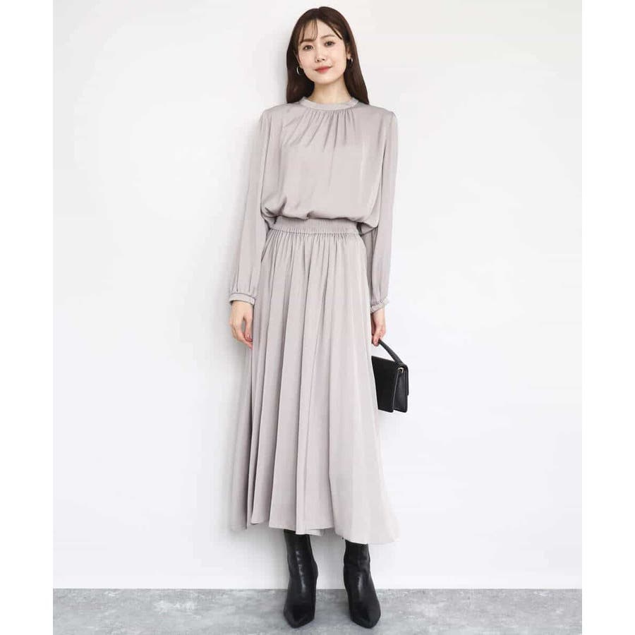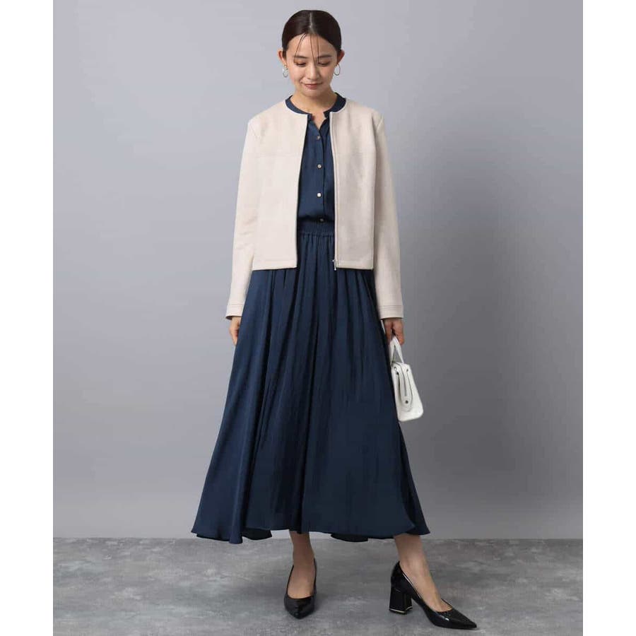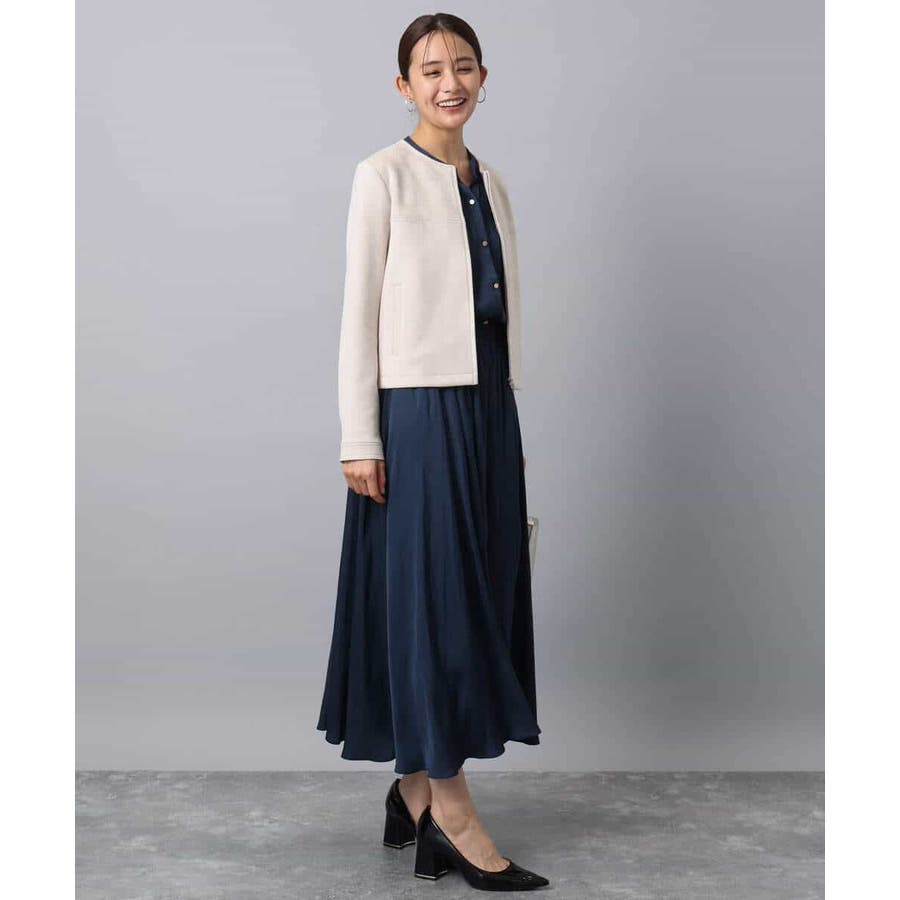 上品な光沢感と程よいパウダリータッチの起毛サテン地を使用。合繊素材なのでシワになりにくく、扱いのラクさも魅力的。裏地ありで秋から春にかけてちょうどいい素材感です。