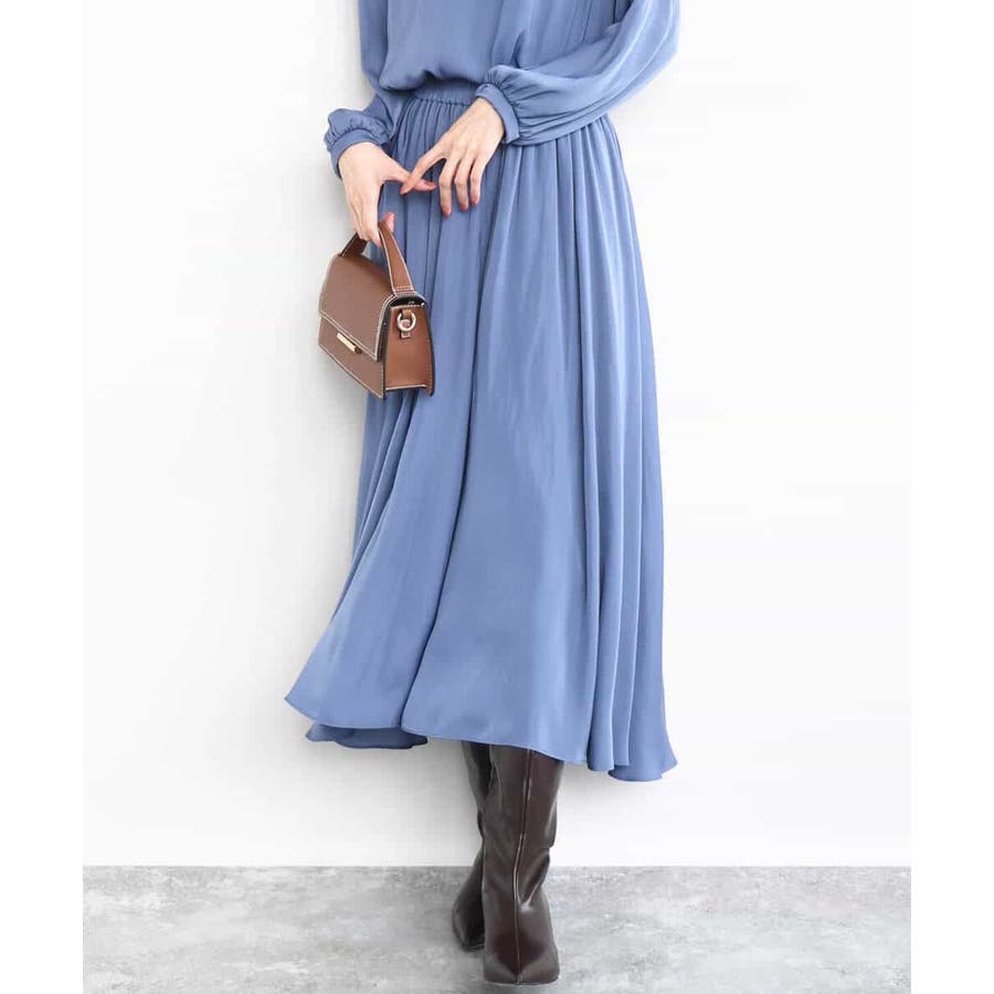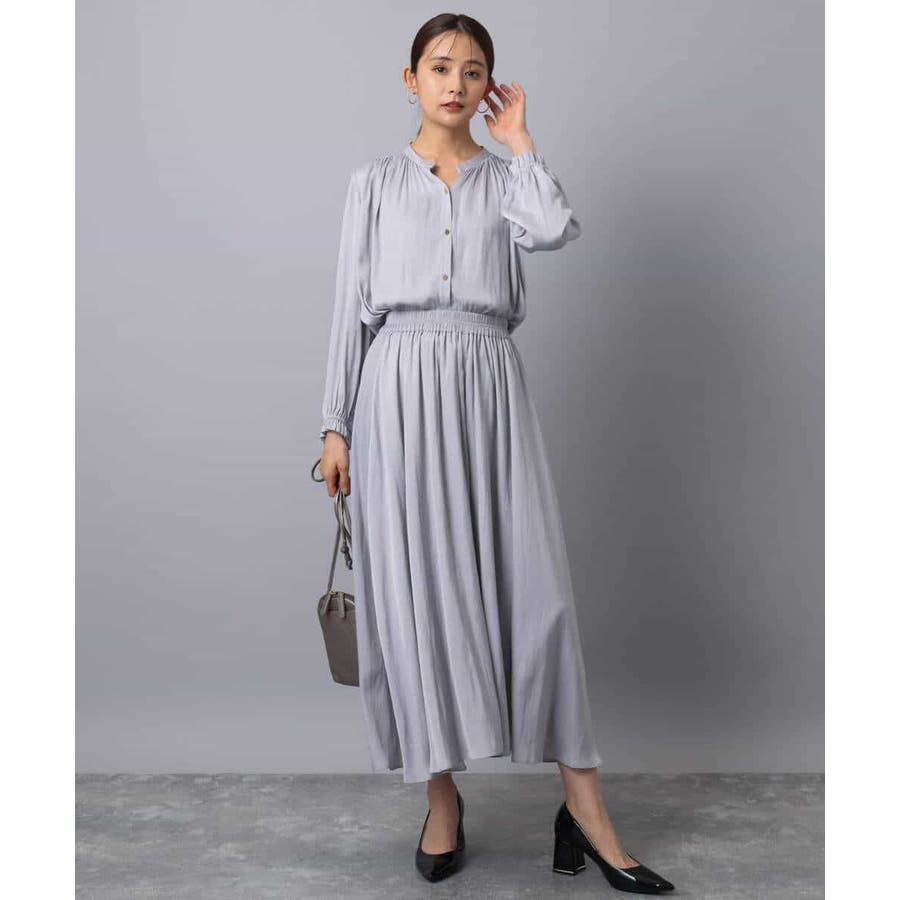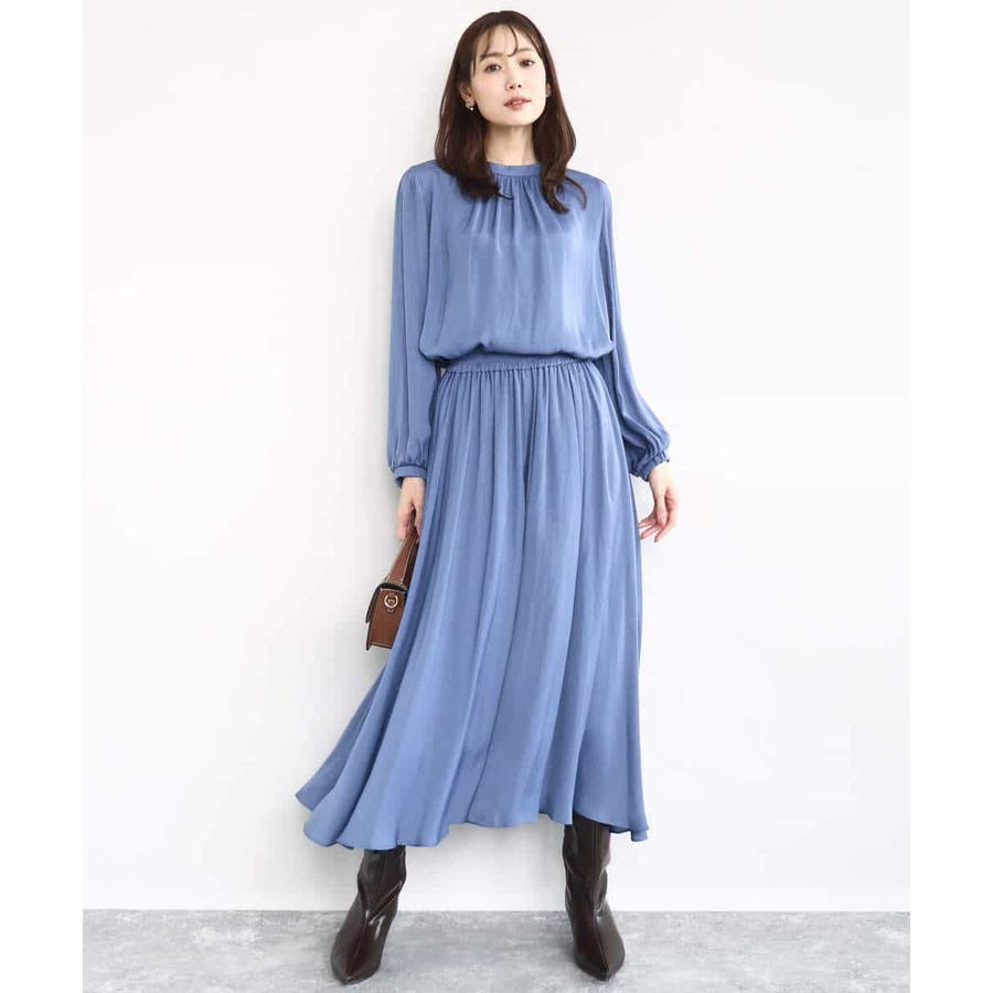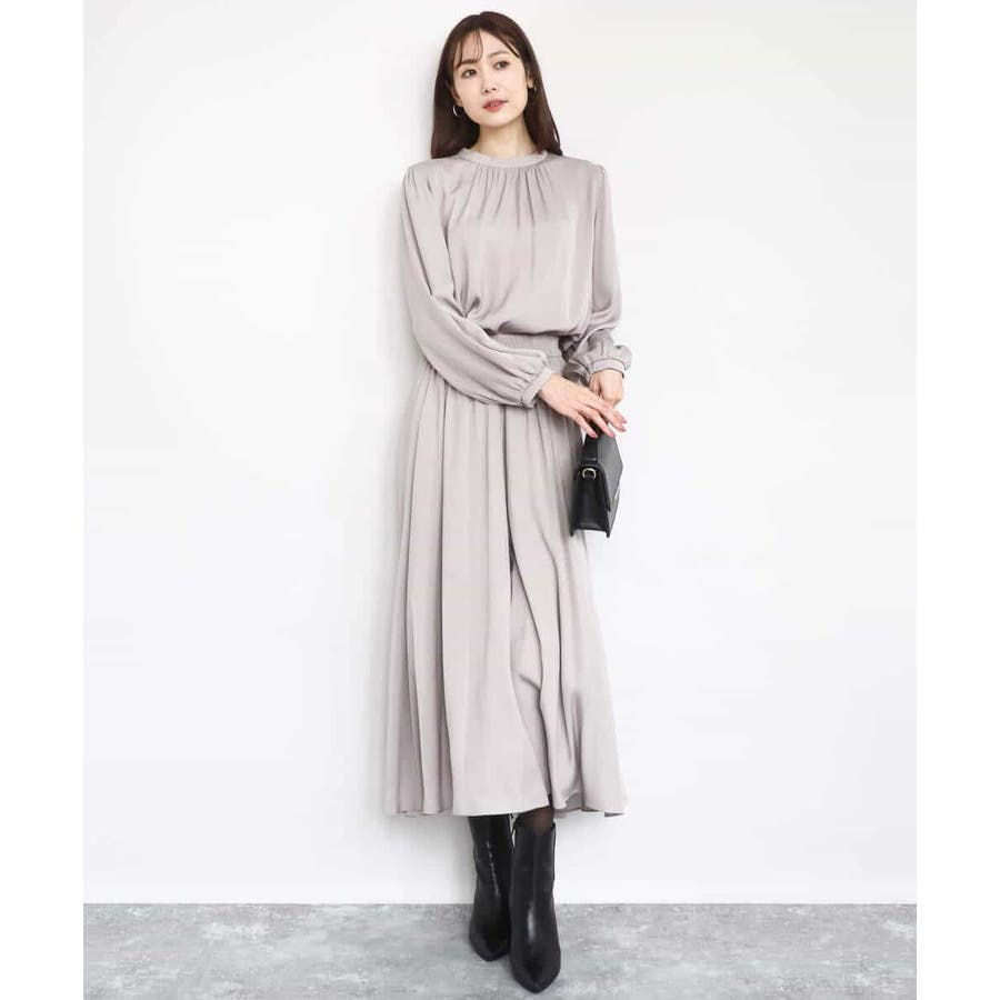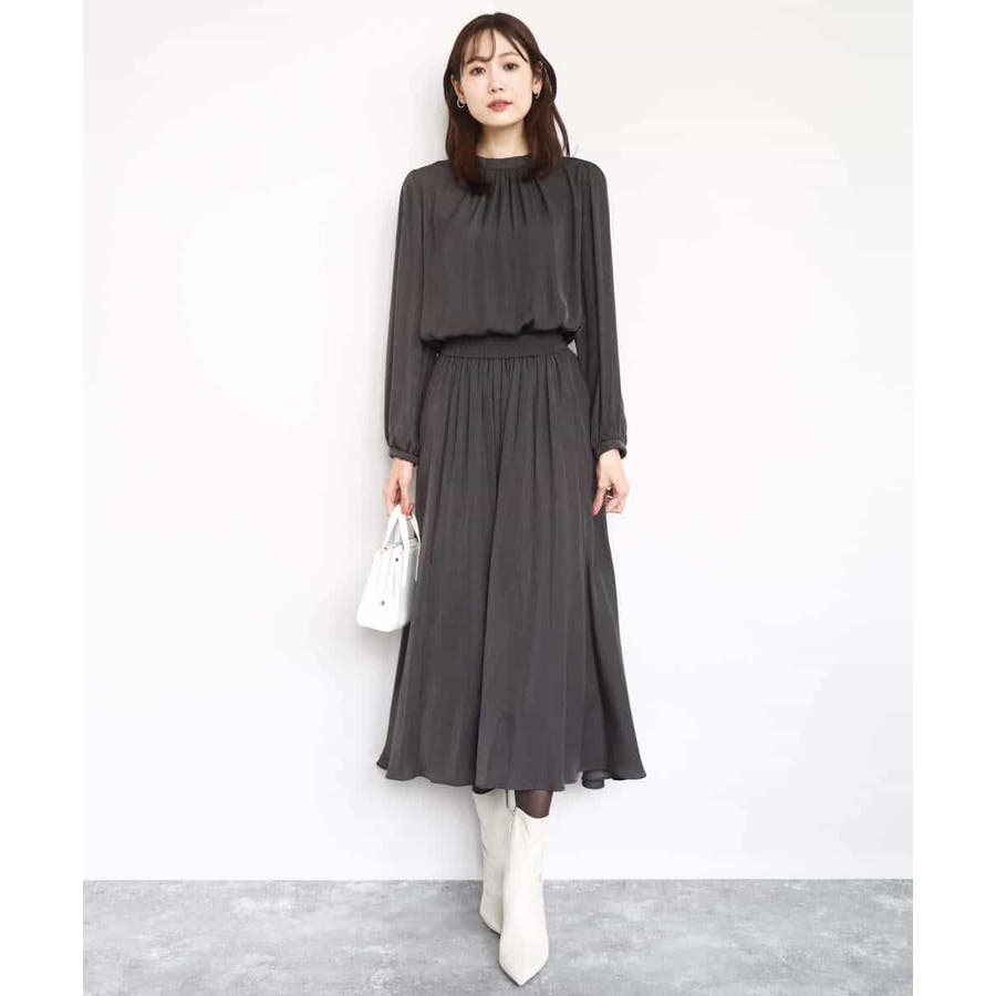 上品な光沢感と程よいパウダリータッチの起毛サテン地を使用。合繊素材なのでシワになりにくく、扱いのラクさも魅力的。裏地ありで秋から春にかけてちょうどいい素材感です。