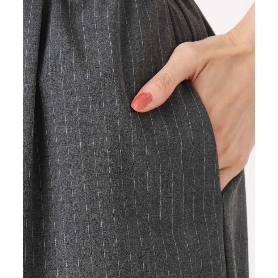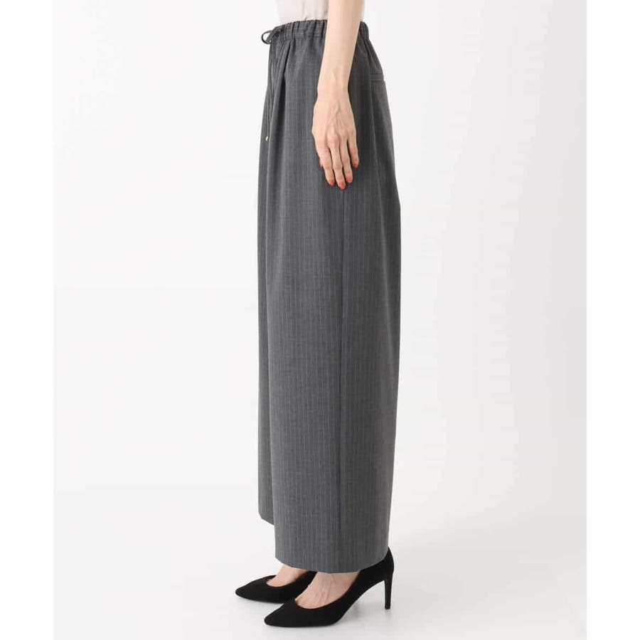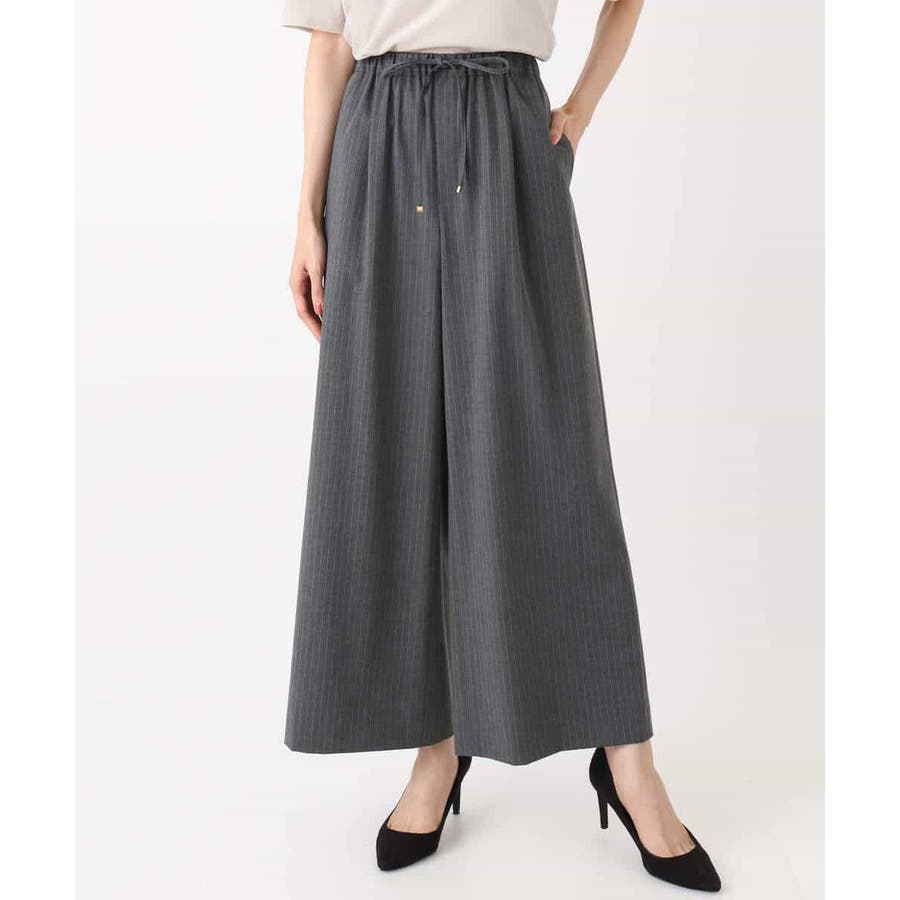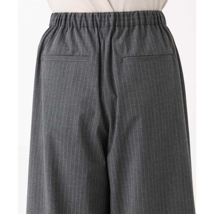ストライプ柄と無地の二柄展開のワイドパンツ。ウエストはオールゴム仕様でフロントの共地紐で調節が可能。身体のラインがきれいに見えるストレートワイドシルエットです。