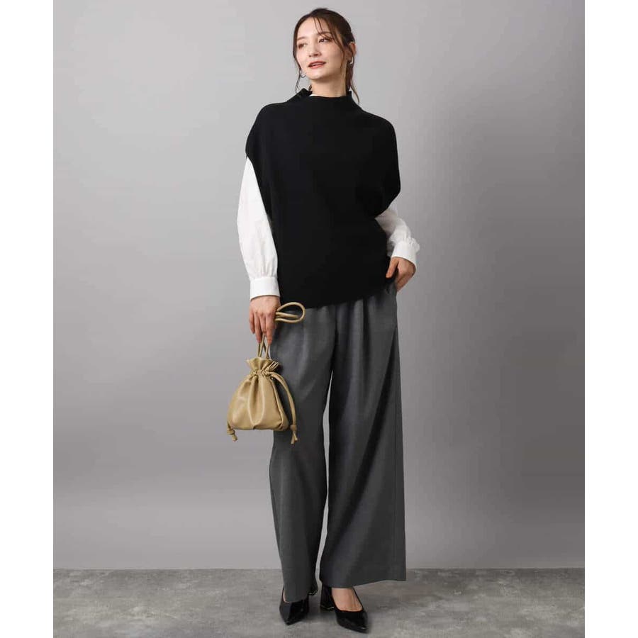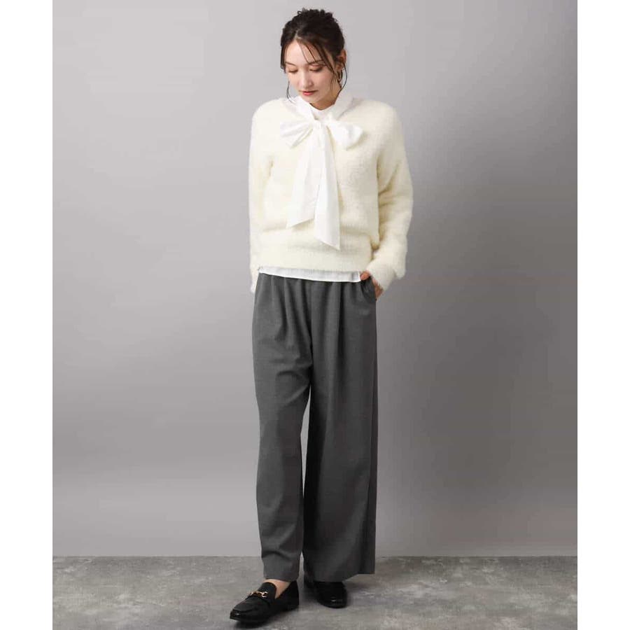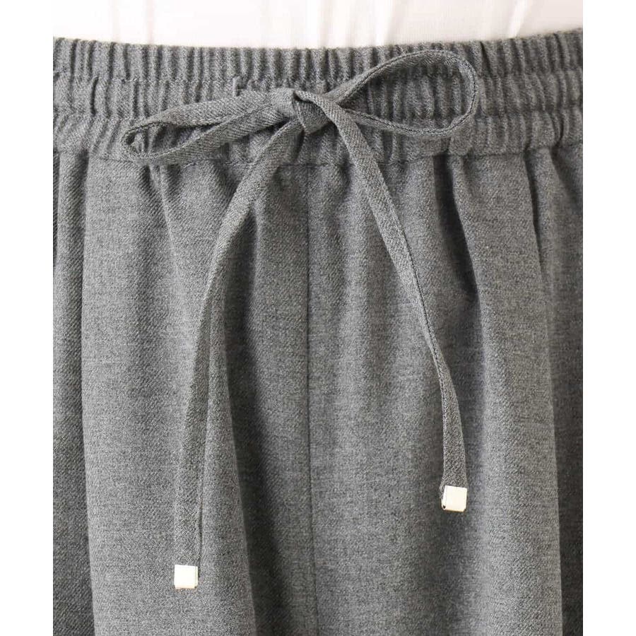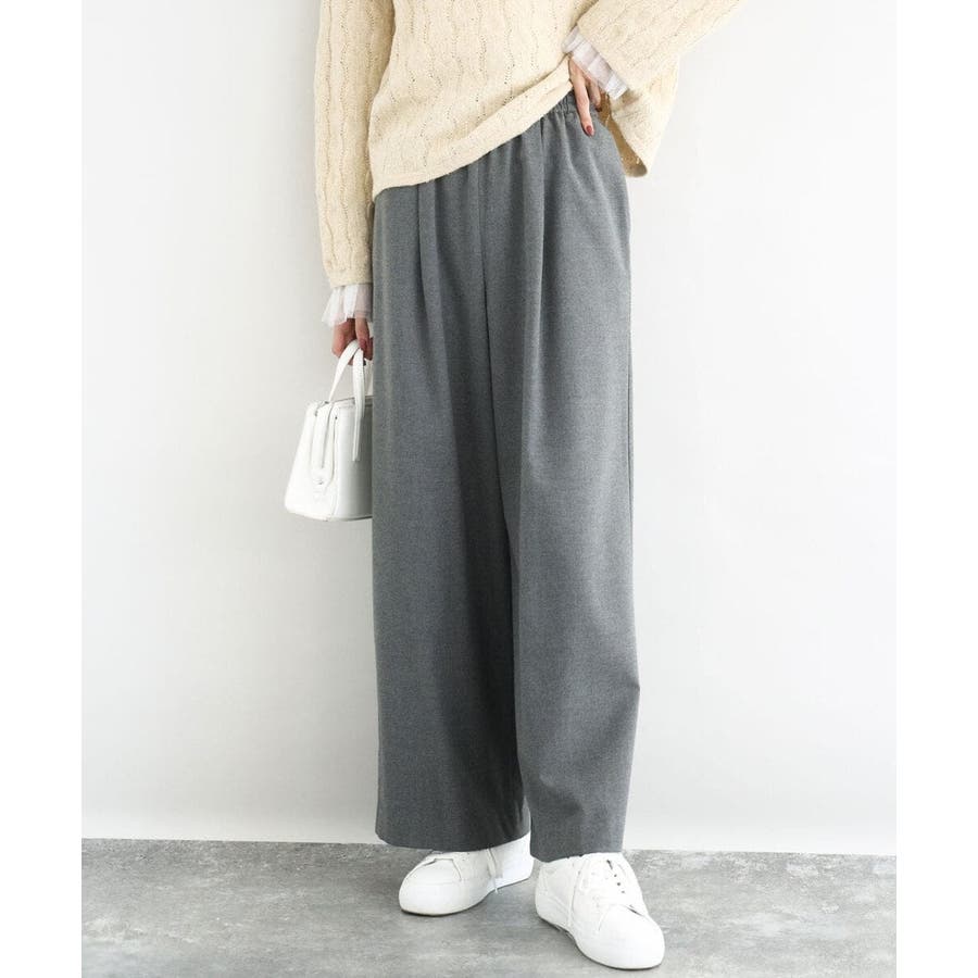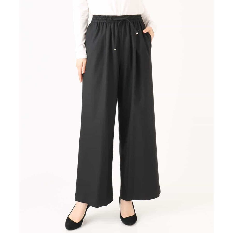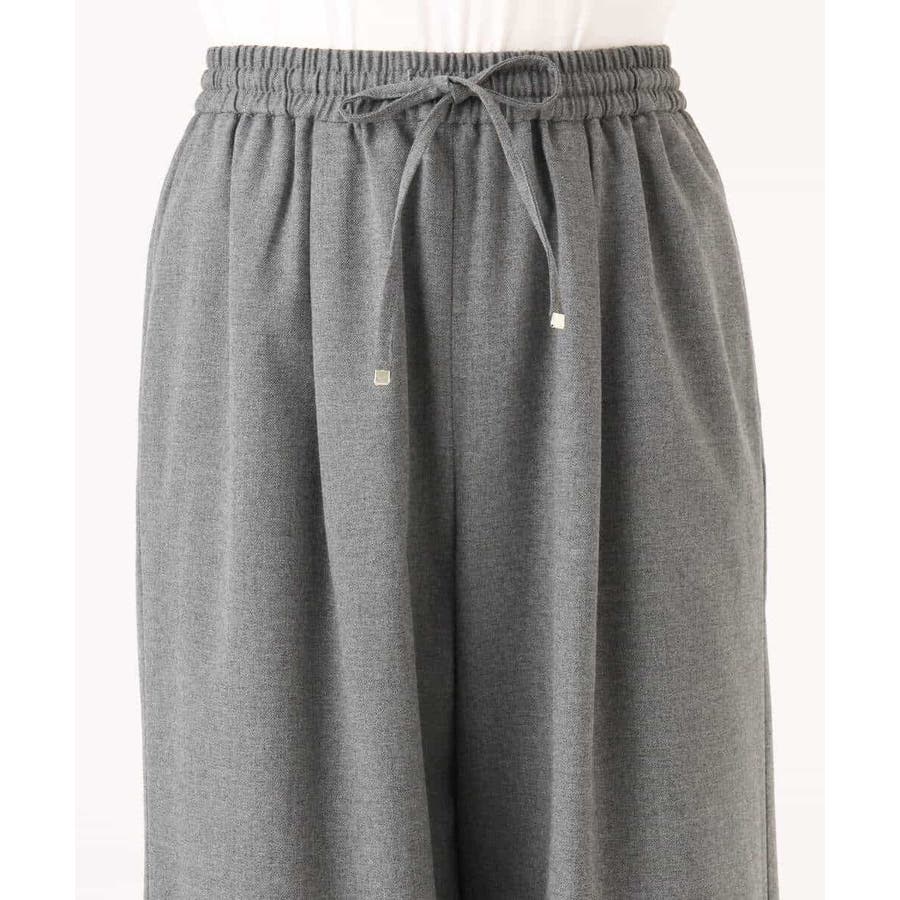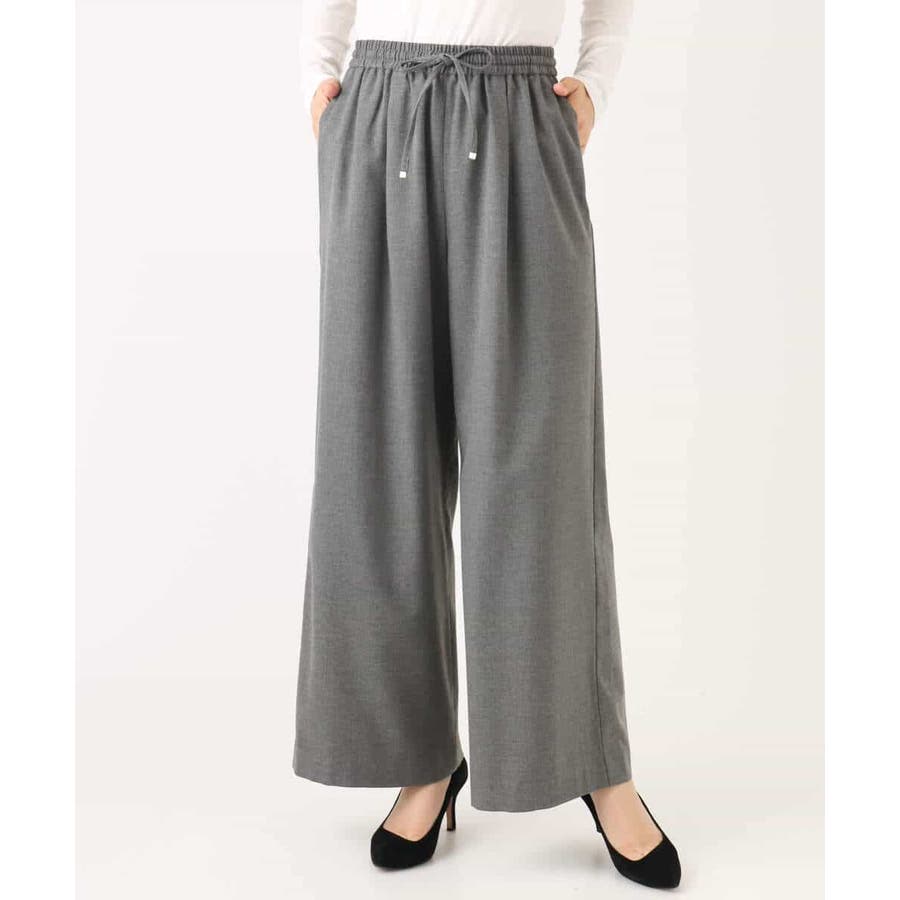 紐でウエストを調節できるタイプのプルオンパンツは、トップスをアウトで着こなすときれいめシーンにも対応可能。フルレングスのワイドパンツはショートブーツともバランスよく決まります。