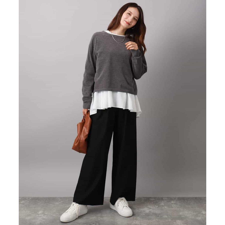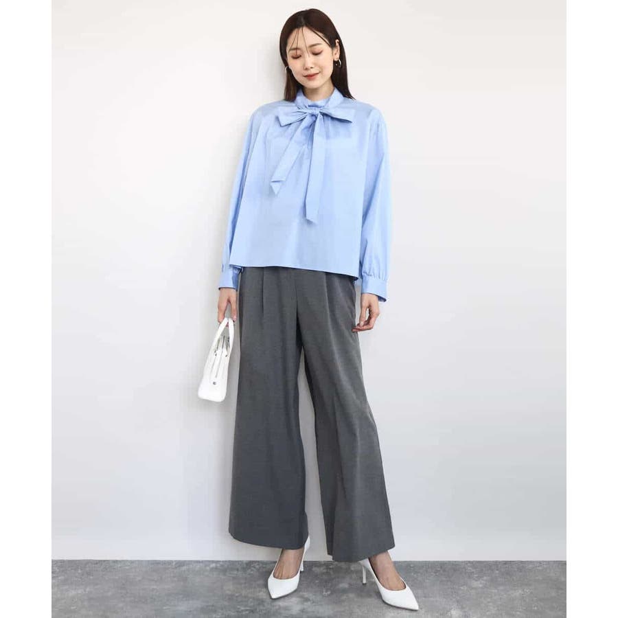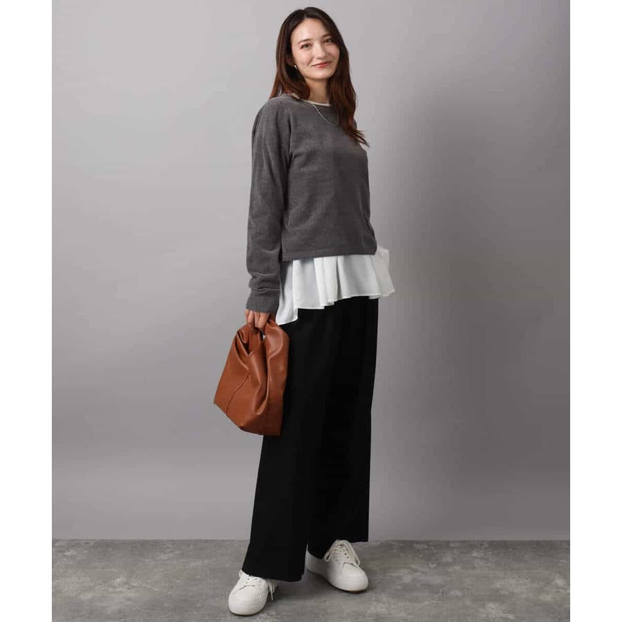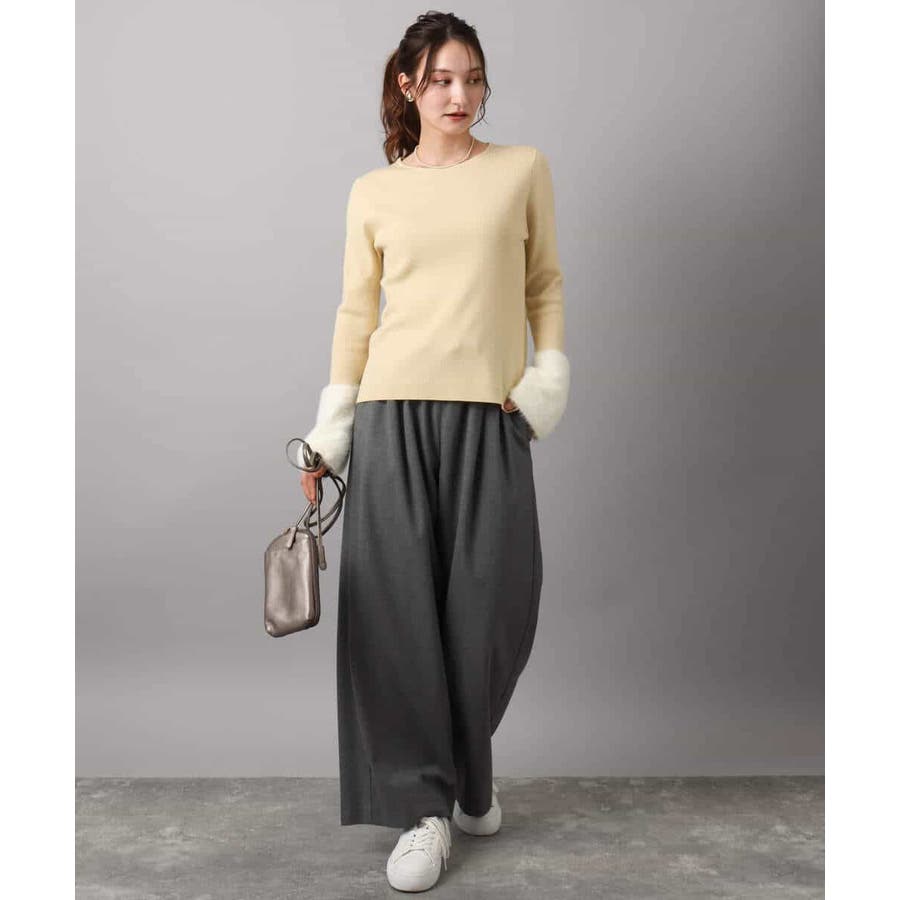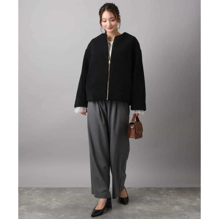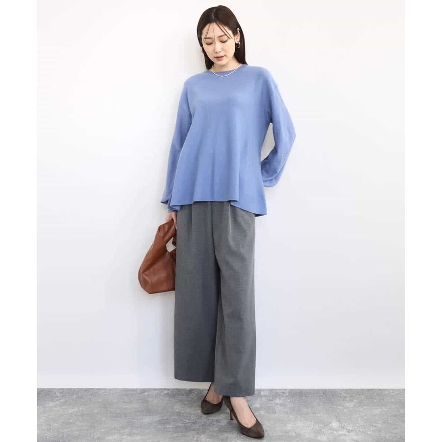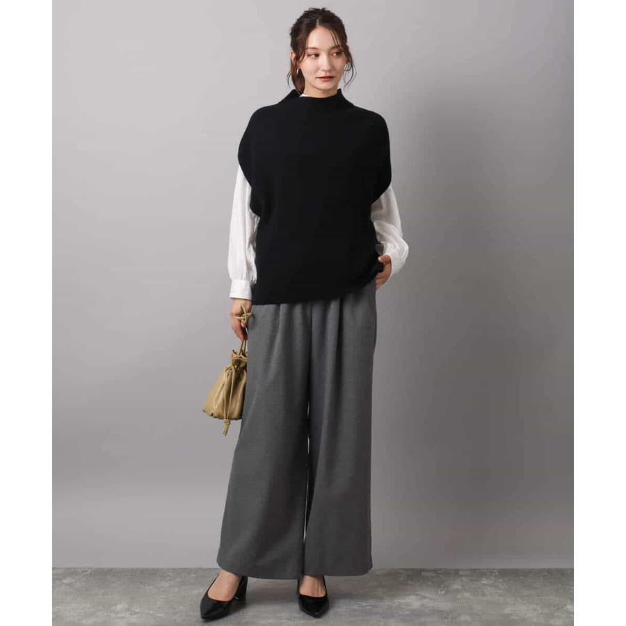 紐でウエストを調節できるタイプのプルオンパンツは、トップスをアウトで着こなすときれいめシーンにも対応可能。フルレングスのワイドパンツはショートブーツともバランスよく決まります。