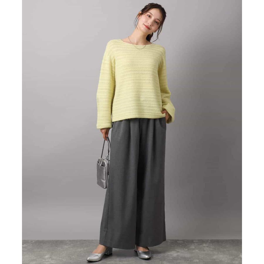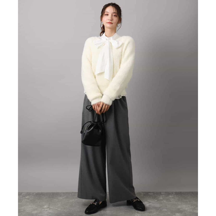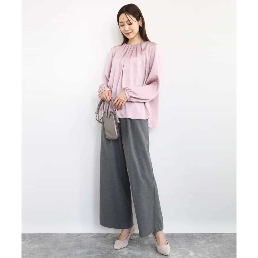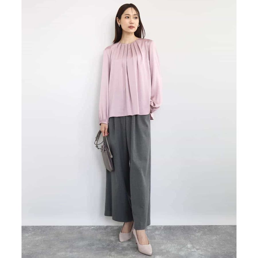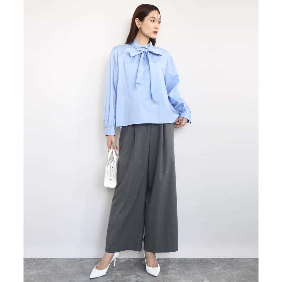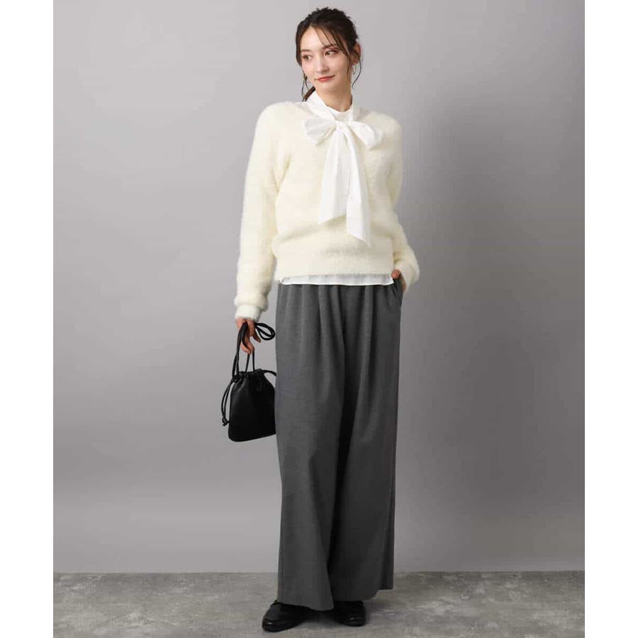 紐でウエストを調節できるタイプのプルオンパンツは、トップスをアウトで着こなすときれいめシーンにも対応可能。フルレングスのワイドパンツはショートブーツともバランスよく決まります。