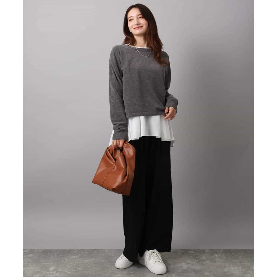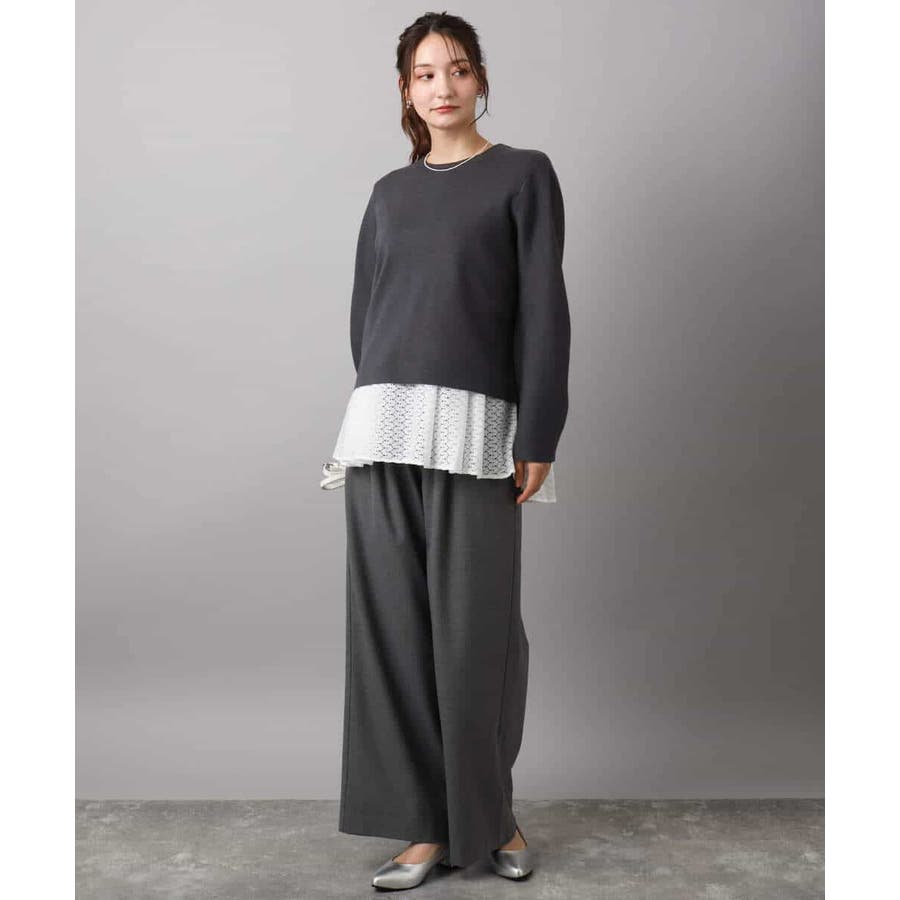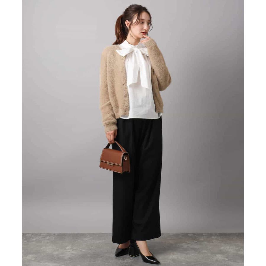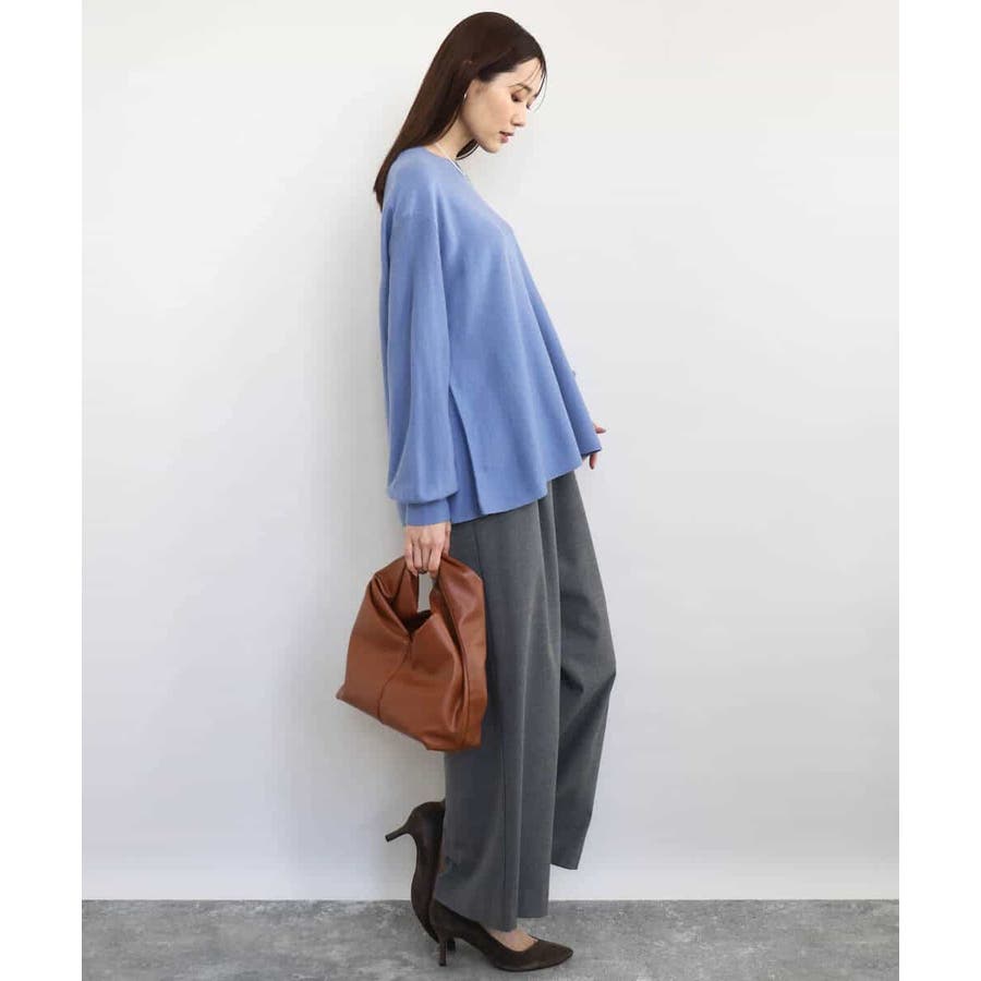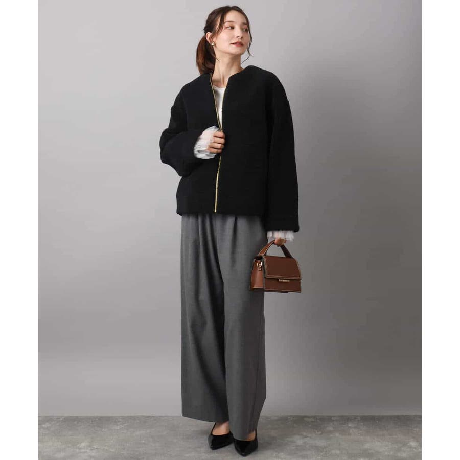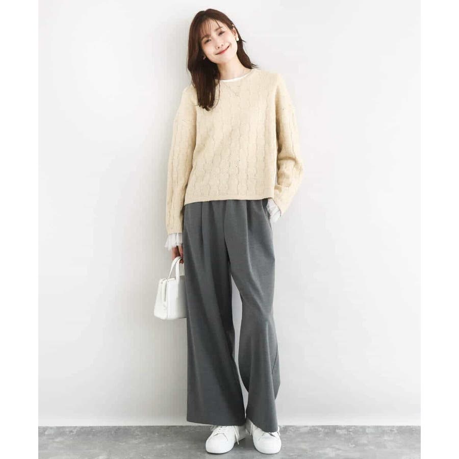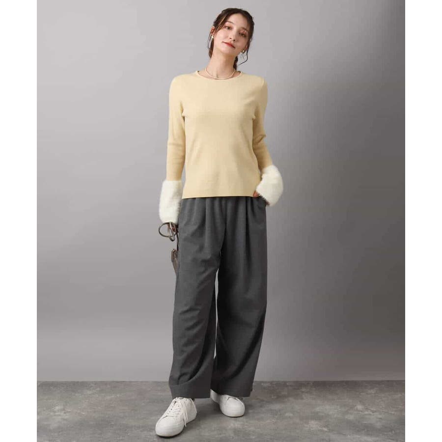 紐でウエストを調節できるタイプのプルオンパンツは、トップスをアウトで着こなすときれいめシーンにも対応可能。フルレングスのワイドパンツはショートブーツともバランスよく決まります。